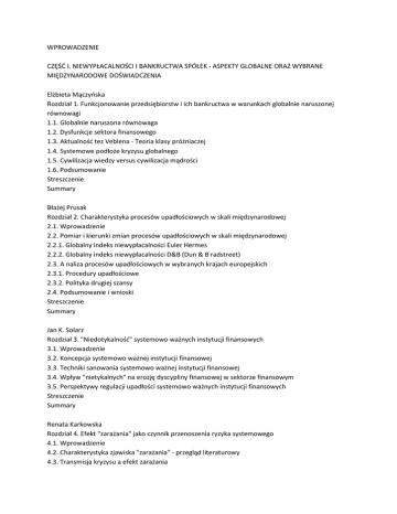 WPROWADZENIE CZĘŚĆ I. NIEWYPŁACALNOŚCI I BANKRUCTWA SPÓŁEK - ASPEKTY GLOBALNE ORAZ WYBRANE MIĘDZYNARODOWE DOŚWIADCZENIA Elżbieta Mączyńska Rozdział 1. Funkcjonowanie przedsiębiorstw i ich bankructwa w warunkach globalnie naruszonej równowagi 1.1. Globalnie naruszona równowaga 1.2. Dysfunkcje sektora finansowego 1.3. Aktualność tez Veblena - Teoria klasy próżniaczej 1.4. Systemowe podłoże kryzysu globalnego 1.5. Cywilizacja wiedzy versus cywilizacja mądrości 1.6. Podsumowanie Streszczenie Summary Błażej Prusak Rozdział 2. Charakterystyka procesów upadłościowych w skali międzynarodowej 2.1. Wprowadzenie 2.2. Pomiar i kierunki zmian procesów upadłościowych w skali międzynarodowej 2.2.1. Globalny indeks niewypłacalności Euler Hermes 2.2.2. Globalny indeks niewypłacalności D&B (Dun & B radstreet) 2.3. A naliza procesów upadłościowych w wybranych krajach europejskich 2.3.1. Procedury upadłościowe 2.3.2. Polityka drugiej szansy 2.4. Podsumowanie i wnioski Streszczenie Summary Jan K. Solarz Rozdział 3. "Niedotykalność" systemowo ważnych instytucji finansowych 3.1. Wprowadzenie 3.2. Koncepcja systemowo ważnej instytucji finansowej 3.3. Techniki sanowania systemowo ważnej instytucji finansowej 3.4. Wpływ "nietykalnych" na erozję dyscypliny finansowej w sektorze finansowym 3.5. Perspektywy regulacji upadłości systemowo ważnych instytucji finansowych Streszczenie Summary Renata Karkowska Rozdział 4. Efekt "zarażania" jako czynnik przenoszenia ryzyka systemowego 4.1. Wprowadzenie 4.2. Charakterystyka zjawiska "zarażania" - przegląd literaturowy 4.3. Transmisja kryzysu a efekt zarażania 4.4. Charakterystyka kanałów "zarażania" 4.5. Integracja rynków finansowych jako czynnik sprzyjający przenoszeniu się kryzysów 4.6. Podsumowanie Streszczenie Summary Paweł Wieprzowski Rozdział 5. Efekt zarażania w sferze finansowej gospodarki - implikacje dla polskich przedsiębiorstw 5.1. Wprowadzenie 5.2. Determinanty efektu zarażania 5.3. Efekt zarażenia na rynkach finansowych 5.4. Efekt zarażenia w sektorze bankowym 5.5. Podsumowanie Streszczenie Summary Luigi Lai Chapter 6. Spanish and Italian intervention measures for saving companies intrinsic value Conclusions Summary Eva Tom çkov Chapter 7. Statistic data about insolvency in the Czech Republic 7.1. Introduction 7.2. Insolvency Act in the Czech Republic 7.3. Development of insolvency 7.4. Detailed insolvency at companies 7.5. Personal entity insolvency 7.6. Conclusions Summary CZĘŚĆ II. PRZYCZYNY I PREDYKCJA BANKRUCTW PRZEDSIĘBIORSTW Katarzyna Boratyńska Rozdział 8. Faza schyłkowa oraz przesłanki bankructwa przedsiębiorstw agrobiznesu i gospodarstw rolniczych 8.1. Wprowadzenie 8.2. Cykl życia przedsiębiorstwa 8.3. S kala i przesłanki bankructwa przedsiębiorstw agrobiznesu 8.4. Koncepcja ewolucji naturalnej i przesłanki bankructwa gospodarstw rolniczych 8.5. Podsumowanie Streszczenie Summary Tomasz Wyszynski Chapter 9. Price wars and insolvencies 9.1. Introduction 9.2. Definition of a price war 9.3. Reasons for price war eruption 9.4. Consequences of price wars 9.5. Tactics for the price war 9.6. Conclusions Summary Streszczenie Waldemar Rogowski, Kamila Duleba Rozdział 10. Możliwość wykorzystania modeli oceny zagrożenia bankructwem w praktyce audytorów 10.1. Wprowadzenie 10.2. Metodyka badania 10.2.1. Charakterystyka populacji 10.2.2. Wybór modeli 10.2.3. Dane finansowe 10.3. Wyniki badań 10.4. Analiza wyników badania 10.5. Podsumowanie Streszczenie Summary Magdalena Ciszewska Rozdział 11. Prognozowanie upadłości przedsiębiorstw z wykorzystaniem analizy dyskryminacyjnej, przy spełnieniu założenia dotyczącego rozkładu badanych zmiennych 11.1. Wprowadzenie 11.2. Analiza dyskryminacyjna 11.2.1. Zbiór danych 11.2.2. Sprawdzenie normalności rozkładu zmiennych 11.3. Zastosowanie analizy dyskryminacyjnej 11.3.1. Zastosowanie analizy dyskryminacyjnej dla zmiennych posiadających rozkład normalny dla testu Kołmogorowa-Smirnowa 11.3.2. Zastosowanie analizy dyskryminacyjnej dla zmiennych posiadających rozkład normalny dla testu Shapiro-Wilka 11.4. Podsumowanie Streszczenie Summary Małgorzata Tymoszuk Rozdział 12. Skuteczność modeli prognozowania upadłości przedsiębiorstw a upływ czasu porównanie popularnych polskich modeli wielowymiarowej analizy dyskryminacyjnej z modelem zbudowanym przez autorkę Streszczenie Summary Paweł Antonowicz Rozdział 13. Założenia analizy dyskryminacyjnej w konstruowaniu nowych wielowymiarowych modeli klasyfikacyjnych w celu prognozowania upadłości przedsiębiorstw 13.1. Wprowadzenie 13.2. Założenia metodologiczne analizy dyskryminacyjnej 13.3. Praktyczne dylematy na poziomie wyboru właściwego modelu dyskryminacyjnego 13.4. Praktyczne dylematy na poziomie obliczania modeli dyskryminacyjnych 13.5. Praktyczne dylematy na poziomie interpretacji modeli dyskryminacyjnych 13.6. Podsumowanie - rekomendacje do tworzenia nowych modeli dyskryminacyjnych dopasowanych do badania przedsiębiorstw funkcjonujących w gospodarce polskiej Streszczenie Summary CZĘŚĆ III. ZARZĄDZANIE RYZYKIEM W PRZEDSIĘBIORSTWIE Edyta Bochenek Rozdział 14. Credit rating w zarządzaniu ryzykiem bankructwa przedsiębiorstwa 14.1. Wprowadzenie 14.2. Ryzyko bankructwa jako szczególny rodzaj ryzyka w działalności przedsiębiorstwa 14.3. Zarządzanie ryzykiem bankructwa w przedsiębiorstwie 14.4. Credit rating i jego znaczenie dla zarządzających przedsiębiorstwem w aspekcie ryzyka bankructwa 14.4.1. Istota i klasyfikacja credit ratingu 14.4.2. Model tworzenia credit ratingu w polskim systemie bankowym na przykładzie wybranego banku 14.4.3. Wykorzystanie credit ratingu w procesie zarządzania ryzykiem bankructwa w przedsiębiorstwie 14.5. Podsumowanie Streszczenie Summary Jacek Nowak Chapter 15. Company financing perspective in the context of bankruptcy risk analysis 15.1. Introduction 15.2. Credit risk 15.3. Prudential regulations 15.4. Suppor