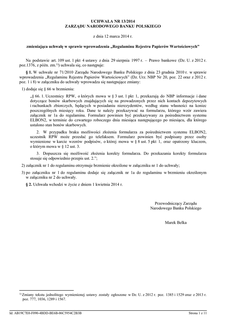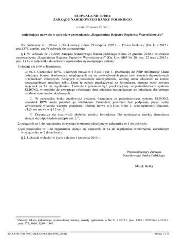 UCHWAŁA NR 13/2014 ZARZĄDU NARODOWEGO BANKU POLSKIEGO z dnia 12 marca 2014 r. zmieniająca uchwałę w sprawie wprowadzenia „Regulaminu Rejestru Papierów Wartościowych” Na podstawie art. 109 ust. 1 pkt 4 ustawy z dnia 29 sierpnia 1997 r. – Prawo bankowe (Dz. U. z 2012 r. poz.1376, z późn. zm.1)) uchwala się, co następuje: § 1. W uchwale nr 71/2010 Zarządu Narodowego Banku Polskiego z dnia 23 grudnia 2010 r. w sprawie wprowadzenia „Regulaminu Rejestru Papierów Wartościowych” (Dz. Urz. NBP Nr 20, poz. 22 oraz z 2012 r. poz. 1 i 8) w załączniku do uchwały wprowadza się następujące zmiany: 1) dodaje się § 66 w brzmieniu: „§ 66. 1. Uczestnicy RPW, o których mowa w § 3 ust. 1 pkt 1, przekazują do NBP informacje i dane dotyczące bonów skarbowych znajdujących się na prowadzonych przez nich kontach depozytowych i rachunkach zbiorczych, będących w posiadaniu nierezydentów, według stanu własności na koniec poszczególnych miesięcy roku. Dane te należy przekazywać na formularzu, którego wzór zawiera załącznik nr 1a do regulaminu. Formularz powinien być przekazywany za pośrednictwem systemu ELBON2, w terminie do czwartego roboczego dnia miesiąca następującego po miesiącu, dla którego ustalono stan bonów skarbowych. 2. W przypadku braku możliwości złożenia formularza za pośrednictwem systemu ELBON2, uczestnik RPW może przesłać go telefaksem. Formularz powinien być podpisany przez osoby wymienione w karcie wzorów podpisów, o której mowa w § 8 ust. 5 pkt 1, oraz opatrzony kluczem, o którym mowa w § 12 ust. 3. 3. Dopuszcza się możliwość złożenia korekty formularza. Do przekazania korekty formularza stosuje się odpowiednio przepis ust. 2.”; 2) załącznik nr 1 do regulaminu otrzymuje brzmienie określone w załączniku nr 1 do uchwały; 3) po załączniku nr 1 do regulaminu dodaje się załącznik nr 1a do regulaminu w brzmieniu określonym w załączniku nr 2 do uchwały. § 2. Uchwała wchodzi w życie z dniem 1 kwietnia 2014 r. Przewodniczący Zarządu Narodowego Banku Polskiego Marek Belka 1) Zmiany tekstu jednolitego wymienionej ustawy zostały ogłoszone w Dz. U. z 2012 r. poz. 1385 i 1529 oraz z 2013 r. poz. 777, 1036, 1289 i 1567. Id: AB19C7E0-F090-4BDD-BE6B-06C5954C2B3B Strona 1 z 11 Załączniki do uchwały nr 13/2014 Zarządu Narodowego Banku Polskiego z dnia 12 marca 2014 r. (poz. ) Załącznik nr 1 Struktura rachunku i konta depozytowego bonów skarbowych Lp. 1 0 0 0 0 Rachunek podstawowy – portfel własny; portfel funduszy zarządzanych przez KDPW 2 9 0 0 0 Pula pożyczek 3 8 0 0 0 Konto pomocnicze – bony uczestników RPW i ich klientów przekazane do KDPW. Konto prowadzone dla KDPW w RPW Konto depozytowe – portfele klientów Rezydenci 4 1 1 0 0 Banki 5 1 2 0 0 Zakłady ubezpieczeniowe 6 1 3 0 0 Fundusze emerytalne 7 1 4 0 0 Fundusze inwestycyjne 8 1 5 0 0 Osoby fizyczne 9 1 6 1 2 Uczelnie publiczne 10 1 6 1 3 Samodzielne publiczne zakłady opieki zdrowotnej nadzorowane przez ministra, centralny organ administracji rządowej, wojewodę, uczelnię medyczną 11 1 6 1 5 Państwowe instytucje kultury i państwowe instytucje filmowe 12 1 6 1 6 Polska Akademia Nauk i tworzone przez nią jednostki organizacyjne 13 1 6 1 7 Inne państwowe osoby prawne utworzone na podstawie odrębnych ustaw, w celu wykonywania zadań publicznych, z wyłączeniem przedsiębiorstw, instytutów badawczych, banków i spółek prawa handlowego 14 1 6 1 8 Instytucje gospodarki budżetowej 15 1 6 1 9 Agencje wykonawcze 16 1 6 2 1 Jednostki samorządu terytorialnego oraz ich związki 17 1 6 2 3 Samodzielne publiczne zakłady opieki zdrowotnej nadzorowane przez jednostkę samorządu terytorialnego 18 1 6 2 4 Samorządowe instytucje kultury 19 1 6 2 5 Samorządowe osoby prawne utworzone na podstawie odrębnych ustaw, w celu wykonywania zadań publicznych, z wyłączeniem banków oraz spółek prawa handlowego 20 1 6 3 1 Zakład Ubezpieczeń Społecznych i zarządzane przez niego fundusze oraz Kasę Rolniczego Ubezpieczenia Społecznego i fundusze zarządzane przez Prezesa Kasy Rolniczego Ubezpieczenia Społecznego 21 1 6 3 2 Narodowy Fundusz Zdrowia 22 1 7 0 0 Inne podmioty 23 1 8 0 0 Podmioty niefinansowe 24 2 1 0 0 Banki 25 2 2 1 0 Banki centralne 26 2 3 0 0 Osoby fizyczne 27 2 5 0 0 Inne podmioty 28 2 6 0 0 Podmioty niefinansowe 29 2 7 0 0 Instytucje publiczne 30 2 8 0 0 Zakłady ubezpieczeniowe 31 2 9 0 0 Fundusze emerytalne 32 2 9 1 0 Fundusze inwestycyjne 33 2 9 2 0 Fundusze hedgingowe 34 3 0 0 0 Rachunki zbiorcze Nierezydenci Struktura rachunku i konta depozytowego bonów pieniężnych NBP WŁ Portfel własny KL Portfel klientów Id: AB19C7E0-F090-4BDD-BE6B-06C5954C2B3B Strona 2 z 11 Załącznik nr 2 NBP DOK Bony skarbowe Uczestnika RPW ....................................................................................................................................................... (numer rachunku i konta depozytowego w RPW oraz nazwa uczestnika RPW) na kontach depozytowych i rachunkach zbiorczych w posiadaniu nierezydentów wg stanu własności na koniec miesiąca ...................... w sztukach Wartość nominalna bonów skarbowych nierezydenci Wyszczególnienie 1 ogółem (3+14) 2 ogółem (4+5+6+7+8 +9+10+11 +12+13) banki banki centralne instytucje publiczne zakłady ubezpieczeniowe fundusze emerytalne fundusze inwestycyjne fundusze hedgingowe osoby fizyczne podmioty niefinansowe inne podmioty 3 4 5 6 7 8 9 10 11 12 13 posiadacze rachunków zbiorczych 14 I.1. PL00001xxxx dzień-miesiąc-rok II. Kraje według kodu ISO 3166-1 Alpha-2 1) II.1. Kraj1 II.2…………. II.k1………… III. Regiony według kodu 1) III.1. Region1 III.2…………. III.n1…………. Id: AB19C7E0-F090-4BDD-BE6B-06C5954C2B3B Strona 3 z 11 I.2. PL0001yyyy dzień-miesiąc-rok II. Kraje według kodu ISO 3166-1 Alpha-2 1) II.1. Kraj1 II.2…………. II.k2………… III. Regiony według kodu 1) III.1. Region1 III.2…………. III.n2……