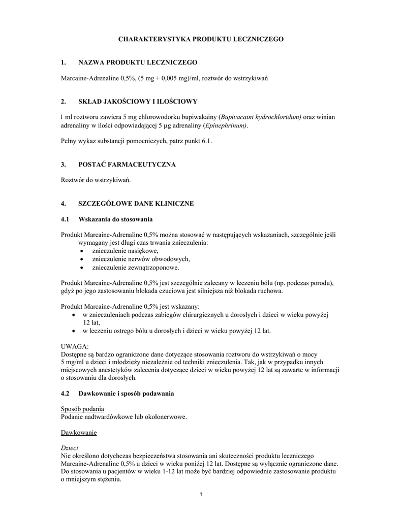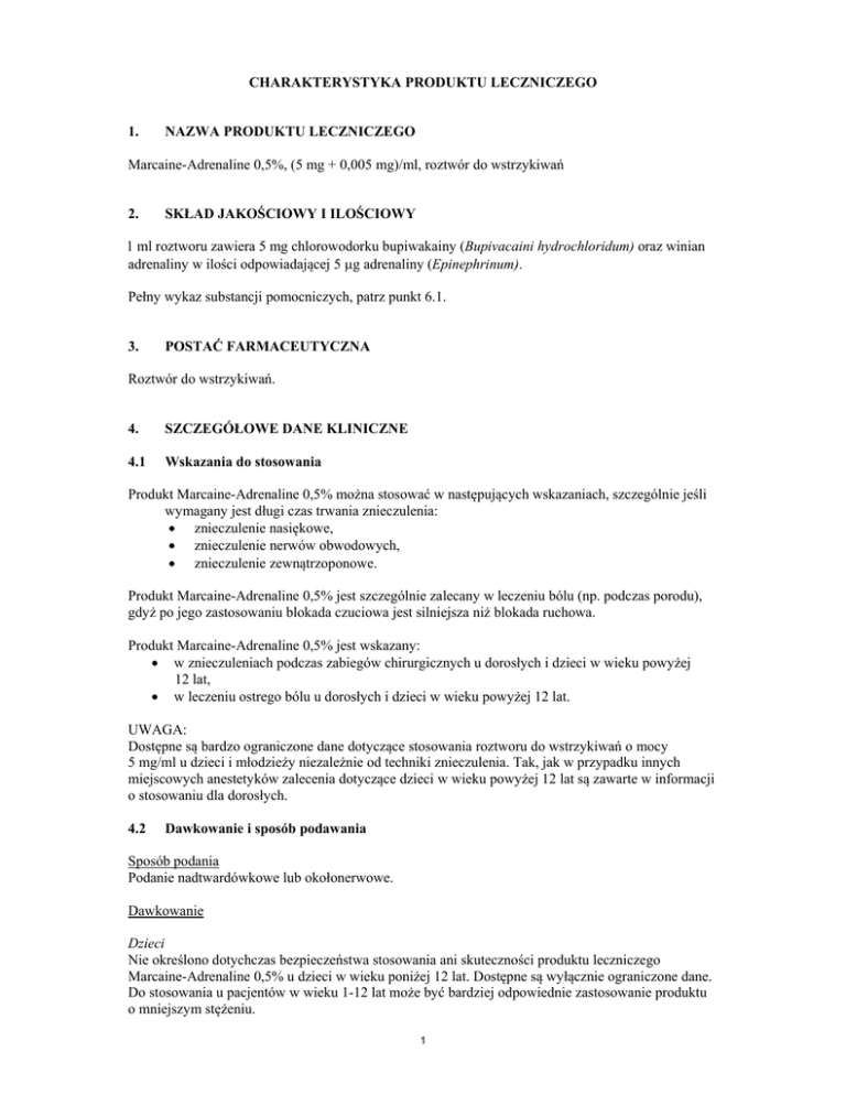 CHARAKTERYSTYKA PRODUKTU LECZNICZEGO 1. NAZWA PRODUKTU LECZNICZEGO Marcaine-Adrenaline 0,5%, (5 mg + 0,005 mg)/ml, roztwór do wstrzykiwań 2. SKŁAD JAKOŚCIOWY I ILOŚCIOWY 1 ml roztworu zawiera 5 mg chlorowodorku bupiwakainy (Bupivacaini hydrochloridum) oraz winian adrenaliny w ilości odpowiadającej 5 g adrenaliny (Epinephrinum). Pełny wykaz substancji pomocniczych, patrz punkt 6.1. 3. POSTAĆ FARMACEUTYCZNA Roztwór do wstrzykiwań. 4. SZCZEGÓŁOWE DANE KLINICZNE 4.1 Wskazania do stosowania Produkt Marcaine-Adrenaline 0,5% można stosować w następujących wskazaniach, szczególnie jeśli wymagany jest długi czas trwania znieczulenia: znieczulenie nasiękowe, znieczulenie nerwów obwodowych, znieczulenie zewnątrzoponowe. Produkt Marcaine-Adrenaline 0,5% jest szczególnie zalecany w leczeniu bólu (np. podczas porodu), gdyż po jego zastosowaniu blokada czuciowa jest silniejsza niż blokada ruchowa. Produkt Marcaine-Adrenaline 0,5% jest wskazany: w znieczuleniach podczas zabiegów chirurgicznych u dorosłych i dzieci w wieku powyżej 12 lat, w leczeniu ostrego bólu u dorosłych i dzieci w wieku powyżej 12 lat. UWAGA: Dostępne są bardzo ograniczone dane dotyczące stosowania roztworu do wstrzykiwań o mocy 5 mg/ml u dzieci i młodzieży niezależnie od techniki znieczulenia. Tak, jak w przypadku innych miejscowych anestetyków zalecenia dotyczące dzieci w wieku powyżej 12 lat są zawarte w informacji o stosowaniu dla dorosłych. 4.2 Dawkowanie i sposób podawania Sposób podania Podanie nadtwardówkowe lub okołonerwowe. Dawkowanie Dzieci Nie określono dotychczas bezpieczeństwa stosowania ani skuteczności produktu leczniczego Marcaine-Adrenaline 0,5% u dzieci w wieku poniżej 12 lat. Dostępne są wyłącznie ograniczone dane. Do stosowania u pacjentów w wieku 1-12 lat może być bardziej odpowiednie zastosowanie produktu o mniejszym stężeniu. 1 Dorośli i dzieci w wieku od 12 lat W poniższej tabeli znajdują się zalecenia dotyczące dawkowania produktu w najczęściej stosowanych technikach znieczulenia. Dawka indywidualna powinna być wyliczona z uwzględnieniem doświadczenia lekarza oraz stanu ogólnego pacjenta. W przypadku stosowania przedłużonego znieczulenia poprzez wykorzystanie techniki znieczulenia ciągłego lub powtarzanych dawek należy rozważyć możliwość osiągnięcia toksycznego stężenia w osoczu lub wystąpienia miejscowego uszkodzenia nerwów. Zalecane dawkowanie chlorowodorku bupiwakainy Stężenie mg/ml Znieczulenie do zabiegu chirurgicznego Objętość ml Dawka mg Początek działania minuty Czas działania godziny 5,0 7,5 15-30 15-20 75-150 112,5-150 15-30 10-15 2-3 3-4 5,0 15-30 75-150 15-30 2-3 2,5 5,0 5-15 5-10 12,5-37,5 25-50 10-15 10-15 1,5-2 2-3 Zewnątrzoponowe krzyżowe1) 2,5 5,0 20-30 20-30 50-75 100-150 20-30 15-30 1-2 2-3 Blokada nerwów obwodowych2) (splot barkowy, udowy, kulszowy) 5,0 10-35 50-175 15-30 4-8 Znieczulenie nasiękowe, blokady małych nerwów 2,5 5,0 7,5 60 30 20 150 150 7,5-150 1-3 1-10 2-10 3-4 3-8 6-10 Dawka pojedyncza3) (np. znieczulenie w okresie pooperacyjnym) 2,5 6-15 minimalny odstęp pomiędzy dawkami to 30 minut 2-5 1-2 Znieczulenie ciągłe4) 1,25 10-15/ godzinę 5-7,5/ godzinę 15-37,5 minimalny odstęp pomiędzy dawkami to 30 minut 12,5-18,8/ godzinę 12,5-18,8/ Godzinę 5-10/ godzinę 6,25-12,5/ Godzinę Zewnątrzoponowe lędźwiowe do zabiegu chirurgicznego1) Zewnątrzoponowe lędźwiowe do cięcia cesarskiego1) Zewnątrzoponowe piersiowe do zabiegu chirurgicznego1) Leczenie ostrego bólu Zewnątrzoponowe lędźwiowe 2,5 Znieczulenie ciągłe podczas porodu4) 1,25 2 Zewnątrzoponowe piersiowe Znieczulenie ciągłe 1,25 2,5 5-10/ godzinę 4-7,5/ godzinę 6,3-12,5/ godzinę 10-18,8/ Godzinę Znieczulenie dostawowe6) (np. znieczulenie do artroskopii kolana) 2,5 40 1005) 5-10 2-4 godziny od odstawienia Znieczulenie nasiękowe, blokady małych nerwów 2,5 60 150 1-3 3-4 1) Dawka uwzględnia dawkę próbną. W przypadku znieczulenia dużych nerwów dawkę należy dostosować w zależności od miejsca podania i stanu ogólnego pacjenta. Znieczulenie nerwów międzyżebrowych i splotu barkowego z dostępu nadobojczykowego wiąże się ze zwiększoną częstością ciężkich działań niepożądanych, niezależnie od użytego do znieczulenia miejscowego anestetyku, (patrz punkt 4.4). 3) Dawka całkowita 400 mg/24 godziny. 4) Roztwór ten jest często stosowany w znieczuleniu zewnątrzoponowym do leczenia bólu w połączeniu z lekiem opioidowym. Dawka całkowita 400 mg/24 godziny. 5) Jeżeli jednocześnie u pacjenta jest stosowana bupiwakaina w innych technikach znieczulenia całkowita podana dawka bupiwakainy nie powinna przekraczać 150 mg. 6) po dopuszczeniu produktu do obrotu zgłaszano przypadki chondrolizy u pacjentów otrzymujących po operacji ciągłą infuzję do stawu miejscowego środka znieczulającego. Takie wskazanie nie jest zatwierdzone dla produktu Marcaine-Adrenaline (patrz punkt 4.4). 2) Wymienione w tabeli dawki uważa się za wystarczające do wystąpienia znieczulenia u dorosłego pacjenta. Początek działania i czas działania może być różny u poszczególnych pacjentów. Wartości podane w tabeli to zazwyczaj wymagany zakres dawek. Należy uwzględnić różne czynniki mogące wpływać na poszczególne techniki znieczulenia oraz indywidualne wymagania pacjenta. Czas działania w porównaniu do podanego w tabeli może być dłuższy ze względu na zawartość adrenaliny w produkcie. Stosując duże dawki produktu należy zachować ostrożność ze względu na możliwość wystąpienia ogólnoustrojowego działania adrenaliny. Należy unikać niepotrzebnego stosowania dużych dawek lokalnych anestetyków. W celu uzyskania całkowitej blokady wszystkich włókien nerwowych w dużych nerwach konieczne są większe stężenia leku. Do uzyskania całkowitej blokady mniejszych nerwów lub znieczulenia o mniejszej sile (np. zniesienie bólu porodowego) wskazane jest zastosowanie m