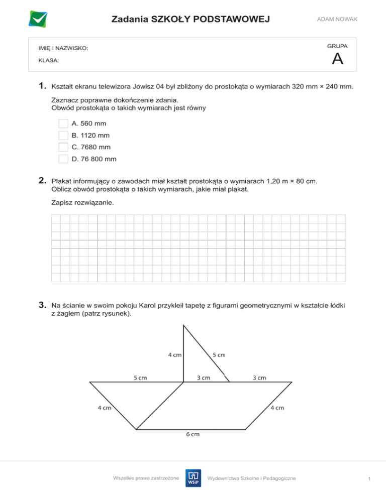 =DGDQLD6=.2à<32'67$:2:(- $'$012:$. GRUPA ,0,ĉ,1$=:,6.2 A ./$6$ 1. .V]WDáWHNUDQXWHOHZL]RUD-RZLV]E\á]EOLĪRQ\GRSURVWRNąWDRZ\PLDUDFKPPîPP =D]QDF]SRSUDZQHGRNRĔF]HQLH]GDQLD 2EZyGSURVWRNąWDRWDNLFKZ\PLDUDFKMHVWUyZQ\ $PP %PP &PP 'PP 2. 3ODNDWLQIRUPXMąF\R]DZRGDFKPLDáNV]WDáWSURVWRNąWDRZ\PLDUDFKPîFP 2EOLF]REZyGSURVWRNąWDRWDNLFKZ\PLDUDFKMDNLHPLDáSODNDW =DSLV]UR]ZLą]DQLH 3. 1DĞFLDQLHZVZRLPSRNRMX.DUROSU]\NOHLáWDSHWĊ]ILJXUDPLJHRPHWU\F]Q\PLZNV]WDáFLHáyGNL ]ĪDJOHPSDWU]U\VXQHN :V]HONLHSUDZD]DVWU]HĪRQH :\GDZQLFWZD6]NROQHL3HGDJRJLF]QH =D]QDF]SRSUDZQHGRNRĔF]HQLH]GDQLD 2EZyGSU]HGVWDZLRQHMQDWDSHFLHILJXU\MHVWUyZQ\ $FP %FP &FP 'FP 4. 3ROHUyZQROHJáRERNXMHVWUyZQHFPDMHGHQ]ERNyZPDGáXJRĞüFP ,OHZ\QRVLGáXJRĞüZ\VRNRĞFLRSXV]F]RQHMQDWHQERN" =DSLV]REOLF]HQLDLVIRUPXáXMRGSRZLHGĨ 5. 6WDĞ]URELá]DNáDGNĊGRNVLąĪNLZNV]WDáFLHSURVWRNąWDRZ\PLDUDFKFPîFP =D]QDF]SRSUDZQHGRNRĔF]HQLH]GDQLD 2EZyGSURVWRNąWDRZ\PLDUDFKWDNLFKMDNLHPD]DNáDGND6WDVLDMHVWUyZQ\ $FP %FP &FP 'FP 6. :WUyMNąFLHRSROXFPZ\VRNRĞüPDGáXJRĞüFP -DNąGáXJRĞüPDERNQDNWyU\SRSURZDG]RQRWĊZ\VRNRĞü" =DSLV]REOLF]HQLDLVIRUPXáXMRGSRZLHGĨ :V]HONLHSUDZD]DVWU]HĪRQH :\GDZQLFWZD6]NROQHL3HGDJRJLF]QH Podsumowanie testu NAZWA Adam Nowak Zadania SZKOŁY PODSTAWOWEJ GRUPYA LICZBA ZADAŃ6 CZAS NA ROZWIĄZANIE 15 MIN POZIOM TRUDNOŚCI ŚREDNI SUMA PUNKTÓW 9 PKT SEGMENT SZKOŁA PODSTAWOWA 4 – 6 GRUPA A Numer zadania Poprawna odpowiedź Zasady przyznawania punktów Czas na rozwiązanie Liczba punktów 1 B Zaznaczenie poprawnego dokończenia zdania – 1 punkt. 2 min 0–1 2 400 cm Zapisanie wyrażenia prowadzącego do wyznaczenia obwodu prostokąta – 1 punkt. Poprawne obliczenie obwodu prostokąta – 1 punkt. 3 min 0–2 3 A Zaznaczenie poprawnego dokończenie zdania – 1 punkt. 1 min 0–1 4 4,5 cm Zapisanie wyrażenia prowadzącego do wyznaczenia sumy pola równoległoboku – 1 punkt. Poprawne obliczenie wartości zapisanego wyrażenia – 1 punkt. 3 min 0–2 5 C Zaznaczenie poprawnego dokończenia zdania – 1 punkt. 1 min 0–1 6 4 Zapisanie wyrażenia prowadzącego do wyznaczenia długości boku trójkąta – 1 punkt. Poprawne obliczenie długości boku trójkąta – 1 punkt. 5 min 0–2 WYKORZYSTANE WYMAGANIA SZCZEGÓŁOWE: Obliczenia w geometrii Uczeń 11.1 oblicza obwód wielokąta o danych długościach boków. 11.2 oblicza pola: kwadratu, prostokąta, rombu, równoległoboku, trójkąta, trapezu przedstawionych na rysunku (w tym na własnym rysunku pomocniczym) oraz w sytuacjach praktycznych. Wszelkie prawa zastrzeżone Wydawnictwa Szkolne i Pedagogiczne