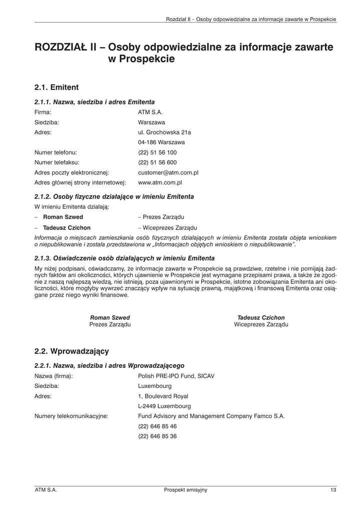 Rozdział II – Osoby odpowiedzialne za informacje zawarte w Prospekcie ROZDZIAŁ II – Osoby odpowiedzialne za informacje zawarte w Prospekcie 2.1. Emitent 2.1.1. Nazwa, siedziba i adres Emitenta Firma: ATM S.A. Siedziba: Warszawa Adres: ul. Grochowska 21a 04-186 Warszawa Numer telefonu: (22) 51 56 100 Numer telefaksu: (22) 51 56 600 Adres poczty elektronicznej: [email protected] Adres głównej strony internetowej: www.atm.com.pl 2.1.2. Osoby fizyczne działające w imieniu Emitenta W imieniu Emitenta działają: – Roman Szwed – Prezes Zarządu – Tadeusz Czichon – Wiceprezes Zarządu Informacja o miejscach zamieszkania osób fizycznych działających w imieniu Emitenta została objęta wnioskiem o niepublikowanie i została przedstawiona w „Informacjach objętych wnioskiem o niepublikowanie”. 2.1.3. Oświadczenie osób działających w imieniu Emitenta My niżej podpisani, oświadczamy, że informacje zawarte w Prospekcie są prawdziwe, rzetelne i nie pomijają żadnych faktów ani okoliczności, których ujawnienie w Prospekcie jest wymagane przepisami prawa, a także że zgodnie z naszą najlepszą wiedzą, nie istnieją, poza ujawnionymi w Prospekcie, istotne zobowiązania Emitenta ani okoliczności, które mogłyby wywrzeć znaczący wpływ na sytuację prawną, majątkową i finansową Emitenta oraz osiągane przez niego wyniki finansowe. Roman Szwed Prezes Zarządu Tadeusz Czichon Wiceprezes Zarządu 2.2. Wprowadzający 2.2.1. Nazwa, siedziba i adres Wprowadzającego Nazwa (firma): Polish PRE-IPO Fund, SICAV Siedziba: Luxembourg Adres: 1, Boulevard Royal L-2449 Luxembourg Numery telekomunikacyjne: Fund Advisory and Management Company Famco S.A. (22) 646 85 46 (22) 646 85 36 ATM S.A. Prospekt emisyjny 13 Rozdział II – Osoby odpowiedzialne za informacje zawarte w Prospekcie 2.2.1.1. Osoby fizyczne działające w imieniu Wprowadzającego – Polish PRE-IPO Fund, SICAV W imieniu Wprowadzającego PRE-IPO Fund, SICAV działa: – Piotr Nadolski – Pełnomocnik Polish PRE-IPO Fund, SICAV Informacja o miejscu zamieszkania osoby fizycznej działającej w imieniu Wprowadzającego Polish PRE-IPO Fund, SICAV została objęta wnioskiem o niepublikowanie i została przedstawiona w „Informacjach objętych wnioskiem o niepublikowanie”. 2.2.1.2. Opis powiązań Wprowadzającego oraz osób fizycznych działających w imieniu Wprowadzającego z Emitentem Osoby fizyczne działające w imieniu Wprowadzającego nie są powiązane z Emitentem poza faktem, że Pan Piotr Nadolski jest członkiem Rady Nadzorczej Emitenta. 2.2.1.3. Oświadczenie o odpowiedzialności osób wymienionych w pkt 2.2.1.1 Niniejszym oświadczam, że informacje zawarte w Prospekcie są prawdziwe, rzetelne i nie pomijają żadnych faktów ani okoliczności, których ujawnienie w Prospekcie jest wymagane przepisami prawa, a także że zgodnie z moją najlepszą wiedzą, nie istnieją, poza ujawnionymi w Prospekcie, istotne zobowiązania Emitenta ani okoliczności, które mogłyby wywrzeć znaczący wpływ na sytuację prawną, majątkową i finansową Emitenta oraz osiągane przez niego wyniki finansowe. Piotr Nadolski Pełnomocnik Polish PRE-IPO Fund, SICAV 2.2.2. Nazwa, siedziba i adres Wprowadzającego Nazwa (firma): Polish PRE-IPO L.P. Siedziba: Wilmington, Delaware, USA Adres: 1013 Centre Road, Wilmington, Delaware 19805 Numery telekomunikacyjne: Fund Advisory and Management Company Famco S.A. (22) 646 85 46 (22) 646 85 36 2.2.2.1. Osoby fizyczne działające w imieniu Wprowadzającego – Polish PRE-IPO L.P. W imieniu Wprowadzającego Polish Pre-IPO L.P. działa: – Anthony Doran – Pełnomocnik Polish PRE-IPO L.P. Informacja o miejscu zamieszkania osóby fizycznej działającej w imieniu Wprowadzającego Polish PRE-IPO L.P. została objęta wnioskiem o niepublikowanie i została przedstawiona w „Informacjach objętych wnioskiem o niepublikowanie”. 2.2.2.2. Opis powiązań Wprowadzającego oraz osób fizycznych działających w imieniu Wprowadzającego z Emitentem Pan Anthony Doran jest prezesem Fund Advisory and Mamagement Company Famco S.A., która jest komplementariuszem Polish PRE-IPO L.P. Poza ww. związkiem nie istnieją inne powiązania. 2.2.2.3. Oświadczenie o odpowiedzialności osób wymienionych w pkt 2.2.2.1 Niniejszym oświadczam, że informacje zawarte w Prospekcie są prawdziwe, rzetelne i nie pomijają żadnych faktów ani okoliczności, których ujawnienie w Prospekcie jest wymagane przepisami prawa, a także że zgodnie z moją najlepszą wiedzą, nie istnieją, poza ujawnionymi w Prospekcie, istotne zobowiązania Emitenta ani okoliczności, które mogłyby wywrzeć znaczący wpływ na sytuację prawną, majątkową i finansową Emitenta oraz osiągane przez niego wyniki finansowe. Anthony Doran Pełnomocnik Polish PRE-IPO L.P. 14 Prospekt emisyjny ATM S.A. Rozdział II – Osoby odpowiedzialne za informacje zawarte w Prospekcie 2.3. Podmioty sporządzające Prospekt 2.3.1. Emitent 2.3.1.1. Nazwa, siedziba i adres Emitenta Firma: ATM S.A. Siedziba: Warszawa Adres: ul. Grochowska 21a 04-186 Warszawa Numer telefonu: (22) 51 56 100 Numer telefaksu: (22) 51 56 600 Adres poczty elektronicznej: [email protected] Adres głównej strony internetowej: www.atm.com.pl 2.3.1.2. Osoby fizyczne działające w imieniu Emitenta W imieniu Emitenta działają: – Roman Szwed – Prezes Zarządu – Tadeusz Czichon – Wiceprezes Zarządu Informacja o miejscach zamieszkania osób fizycznych działających w imieniu Emitenta została objęta wnioskiem o niepublikowanie i została przedstawiona w „Informacjach objętych wnioskiem o niepublikowanie”. Emitent odpowiada za wszystkie informacje zawarte w Prospekcie oraz za sporządzenie punktów 2.1, 2.2, 2.3.1 rozdziału II, rozdziału VIII (za wyjątkiem opinii podmiotu uprawnionego do badania sprawozdań finansowych) oraz rozdziału IX niniejszego Prospektu. 2.3.1.3. Opis powiązań sporządzającego Prospekt oraz osób fizycznych działających w 