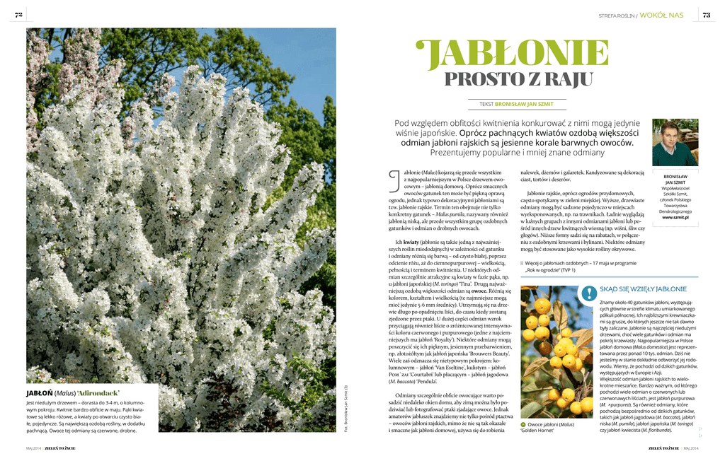 72 strefa Roślin / wokół nas 73 Jabłonie PROSTO Z RajU Tekst Bronisław jan szmit Pod względem obfitości kwitnienia konkurować z nimi mogą jedynie wiśnie japońskie. Oprócz pachnących kwiatów ozdobą większości odmian jabłoni rajskich są jesienne korale barwnych owoców. Prezentujemy popularne i mniej znane odmiany J abłonie (Malus) kojarzą się przede wszystkim z najpopularniejszym w Polsce drzewem owocowym – jabłonią domową. Oprócz smacznych owoców gatunek ten może być piękną oprawą ogrodu, jednak typowo dekoracyjnymi jabłoniami są tzw. jabłonie rajskie. Termin ten obejmuje nie tylko konkretny gatunek – Malus pumila, nazywany również jabłonią niską, ale przede wszystkim grupę ozdobnych gatunków i odmian o drobnych owocach. Jabłoń (Malus) ‘Adirondack’ Jest niedużym drzewem – dorasta do 3-4 m, o kolumnowym pokroju. Kwitnie bardzo obficie w maju. Pąki kwiatowe są lekko różowe, a kwiaty po otwarciu czysto białe, pojedyncze. Są największą ozdobą rośliny, w dodatku pachnącą. Owoce tej odmiany są czerwone, drobne. MAJ 2014 | ZIELEŃ TO ŻYCIE Fot. Bronisław Jan Szmit (3) Ich kwiaty (jabłonie są także jedną z najważniejszych roślin miododajnych) w zależności od gatunku i odmiany różnią się barwą – od czysto białej, poprzez odcienie różu, aż do ciemnopurpurowej – wielkością, pełnością i terminem kwitnienia. U niektórych odmian szczególnie atrakcyjne są kwiaty w fazie pąka, np. u jabłoni japońskiej (M. toringo) ‘Tina’. Drugą najważniejszą ozdobą większości odmian są owoce. Różnią się kolorem, kształtem i wielkością (te najmniejsze mogą mieć jedynie 5-6 mm średnicy). Utrzymują się na drzewie długo po opadnięciu liści, do czasu kiedy zostaną zjedzone przez ptaki. U dużej części odmian wzrok przyciągają również liście o zróżnicowanej intensywności koloru czerwonego i purpurowego (jedne z najciemniejszych ma jabłoń ‘Royalty’). Niektóre odmiany mogą poszczycić się ich pięknym, jesiennym przebarwieniem, np. złotożółtym jak jabłoń japońska ‘Brouwers Beauty’. Wiele zaś odznacza się nietypowym pokrojem: kolumnowym – jabłoń ‘Van Eseltine’, kulistym – jabłoń Pom�zai ‘Courtabri’ lub płaczącym – jabłoń jagodowa (M. baccata) ‘Pendula’. Odmiany szczególnie obficie owocujące warto posadzić niedaleko okien domu, aby zimą można było podziwiać lub fotografować ptaki zjadające owoce. Jednak amatorów jabłuszek znajdziemy nie tylko pośród ptactwa – owoców jabłoni rajskich, mimo że nie są tak okazałe i smaczne jak jabłoni domowej, używa się do robienia nalewek, dżemów i galaretek. Kandyzowane są dekoracją ciast, tortów i deserów. Jabłonie rajskie, oprócz ogrodów przydomowych, często spotykamy w zieleni miejskiej. Wyższe, drzewiaste odmiany mogą być sadzone pojedynczo w miejscach wyeksponowanych, np. na trawnikach. Ładnie wyglądają w luźnych grupach z innymi odmianami jabłoni lub pośród innych drzew kwitnących wiosną (np. wiśni, śliw czy głogów). Niższe formy sadzi się na rabatach, w połączeniu z ozdobnymi krzewami i bylinami. Niektóre odmiany mogą być stosowane jako wysokie rośliny okrywowe. Bronisław jan szmit Współwłaściciel Szkółki Szmit, członek Polskiego Towarzystwa Dendrologicznego www.szmit.pl ▶ Więcej o jabłoniach ozdobnych – 17 maja w programie „Rok w ogrodzie” (TVP 1) SKĄD SIĘ WZIĘŁY JABŁONIE Owoce jabłoni (Malus) ‘Golden Hornet' Znamy około 40 gatunków jabłoni, występujących głównie w strefie klimatu umiarkowanego półkuli północnej. Ich najbliższymi krewniaczkami są grusze, do których jeszcze nie tak dawno były zaliczane. Jabłonie są najczęściej niedużymi drzewami, choć wiele gatunków i odmian ma pokrój krzewiasty. Najpopularniejsza w Polsce jabłoń domowa (Malus domestica) jest reprezentowana przez ponad 10 tys. odmian. Dziś nie jesteśmy w stanie dokładnie odtworzyć jej rodowodu. Wiemy, że pochodzi od dzikich gatunków, występujących w Europie i Azji. Większość odmian jabłoni rajskich to wielokrotne mieszańce. Bardzo ważnym, od którego pochodzi wiele odmian o czerwonych lub czerwonawych liściach, jest jabłoń purpurowa (M. ×purpurea). Są również odmiany, które pochodzą bezpośrednio od dzikich gatunków, takich jak jabłoń jagodowa (M. baccata), jabłoń niska (M. pumila), jabłoń japońska (M. toringo) ▷ czy jabłoń kwiecista (M. floribunda). ▷ ZIELEŃ TO ŻYCIE | MAJ 2014 wokół nas / strefa Roślin strefa Roślin / wokół 75 nas Jabłoń jagodowa (Malus baccata) ‘Pendula’ Nieduże drzewo – jego wysokość zależy od wysokości podkładki, na której zostało zaszczepione – o parasolowatej koronie. Kwiaty są białe, pojedyncze. Drzewo kwitnie bardzo obficie w maju. Ogromną atrakcją są też niezwykle liczne, bardzo drobne, żółte owoce z pomarańczowym rumieńcem. Utrzymują się na drzewie przez zimę, aż zostaną zjedzone przez ptaki. Jabłoń japońska (Malus toringo) ‘Tina’ Jabłoń (Malus) ‘Van Eseltine’ Zwarty, gęsty krzew osiągający 1,5 m wysokości i 2 m średnicy. Bywa szczepiony na wyższej podkładce, tworząc miniaturowe drzewko. Pąki kwiatowe są intensywnie czerwone. Kwiaty – po otwarciu białe, z zewnątrz zaróżowione. To największa ozdoba krzewu. Drobne owoce nie są zbyt ozdobne, jednak lubią je ptaki. Silnie rosnące drzewo o kolumnowym pokroju. Osiąga 6-8 m wysokości. Ciemnoróżowe pąki kwiatowe po otwarciu stają się jaśniejsze, półpełne. Odmiana kwitnie bardzo obficie w drugiej połowie maja. Owoce są drobne (1,5-2 cm średnicy), żółtozielone z czerwonym rumieńcem. Inne polecane jabłonie ozdobne Jabłoń (Malus) ‘Dolgo’ Dorasta do 8 m. Kwiaty są różowawe w pąkach, po otwarciu białe. Odmianę wyróżniają czerwone owoce, polecane na przetwory. Jabłoń (Malus) ‘Fontana’ Drzewko o wąskiej, parasolowatej ko