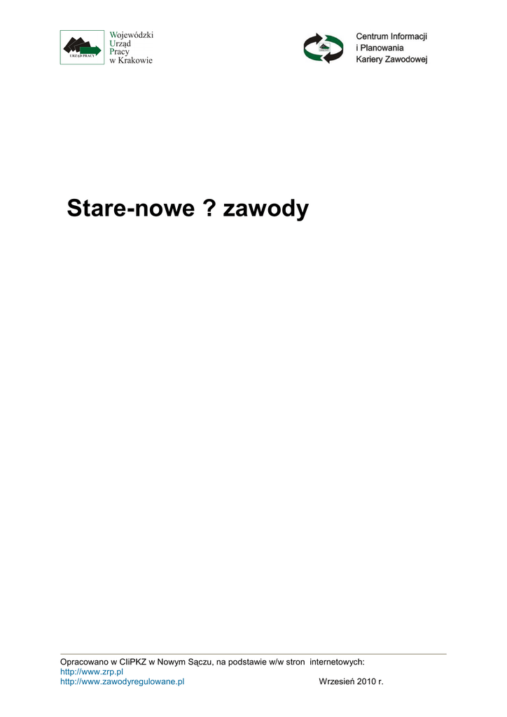 Stare-nowe ? zawody Opracowano w CIiPKZ w Nowym Sączu, na podstawie w/w stron internetowych: http://www.zrp.pl http://www.zawodyregulowane.pl Wrzesień 2010 r. Po latach zapomnienia i odstawienia na „boczny tor” edukacja polska próbuje przywracać do łask zawody rzemieślnicze. Taki trend wynika przede wszystkim z potrzeb współczesnego rynku pracy, ale takŜe rynku edukacji, gdzie nastąpiło ewidentne przesycenie rynku absolwentami uczelni wyŜszych, zwłaszcza humanistycznych, zasilających rzesze bezrobotnych. Z roku na rok obserwujemy coraz wyŜsze zainteresowanie młodzieŜy zawodami na poziomie technikum, szkoły zawodowej lub praktycznej nauki u rzemieślnika. MłodzieŜ zaczyna bowiem zdawać sobie sprawę, Ŝe powstała nisza rynkowa, którą mogą zagospodarować, pozwoli im zaistnieć na rynku pracy. Jednocześnie „burza” medialna wokół tej tematyki pozwala wyjść naprzeciw niektórym instytucjom edukacyjnym i sprostać nowym potrzebom kształcenia zawodowego. Ministerstwo Edukacji Narodowej ogłosiło oficjalnie załoŜenia planowanych od 2012 r. zmian w systemie kształcenia zawodowego. W obecnym etapie reformy - reformy programowej oczekiwana jest poprawa jakości kształcenia i zmiana wizerunku szkoły zawodowej, która zgodnie z hasłem towarzyszącym reformatorom ma być „Szkołą zawodową - szkołą pozytywnego wyboru”. Społeczeństwu i gospodarce potrzebne są fachowe kadry przygotowane do pracy w sektorze wytwórczości i usług. W tym sektorze dobre przygotowanie zawodowe oznacza przede wszystkim dobre przygotowanie praktyczne, a jeŜeli praktyczne to najlepiej …u rzemieślnika. Celem nauki zawodu jest opanowanie przez ucznia - młodocianego pracownika umiejętności praktycznych i teoretycznych w zawodzie i potwierdzenie ich dowodem kwalifikacji zawodowych w drodze przystąpienia do egzaminu czeladniczego. Świadectwo czeladnicze umoŜliwia absolwentowi zatrudnienie na stanowisku wymagającym kwalifikacji zawodowych na tzw. pierwszym poziomie. Egzaminy czeladnicze przeprowadzają komisje egzaminacyjne izb rzemieślniczych. Nauka zawodu w rzemiośle Małe i średnie zakłady rzemieślnicze obok działalności gospodarczej tradycyjnie zajmują się szkoleniem uczniów. Nauka zawodu składa się z dwóch integralnych, równolegle realizowanych części; praktycznej zorganizowanej w zakładzie rzemieślniczym i teoretycznej zorganizowanej w szkole zawodowej lub na kursach dokształcających. Podstawą organizacji nauki jest umowa o pracę w celu przygotowania zawodowego, podpisywana pomiędzy pracodawcą rzemieślnikiem, a uczniem młodocianym pracownikiem. W związku z zawartą umową o pracę i faktem uczęszczania do szkoły zawodowej młody człowiek uzyskuje podwójny status prawny tj. ucznia i pracownika młodocianego lub wyłącznie pracownika młodocianego, jeśli dokształcanie teoretyczne realizowane jest w systemie pozaszkolnym. Warunki zatrudnienia ucznia Na naukę zawodu mogą być przyjęci młodociani pracownicy w przedziale wiekowym od 16 do 18 lat. Młody człowiek zamierzający podjąć naukę zawodu w zakładzie rzemieślniczym musi spełniać następujące warunki: Opracowano w CIiPKZ w Nowym Sączu, na podstawie w/w stron internetowych: http://www.zrp.pl http://www.zawodyregulowane.pl Wrzesień 2010 r. • ukończony 16 rok Ŝycia, - z osobą niemającą 16 lat, która ukończyła gimnazjum, moŜe być zawarta umowa o pracę w celu przygotowania zawodowego w formie nauki zawodu, pod warunkiem wyraŜenia na to zgody opiekuna tej osoby - z osobą niemająca 16 lat, która nie ukończyła gimnazjum, moŜe być zawarta umowa o pracę w celu przygotowania zawodowego w formie przyuczenia do wykonywania określonej pracy, pod warunkiem wyraŜenia na to zgody opiekuna tej osoby • ukończone gimnazjum, • dobre warunki fizyczne i stan zdrowia pozwalający na podjęcie nauki zawodu, a następnie pracy. Umowa o pracę w przygotowania zawodowego Wszelkie formalności związane z zatrudnieniem młodocianego pracownika w celu nauki zawodu najlepiej załatwiać w cechu. Przepisy prawne ustalają, jakie elementy musi zawierać umowa o pracę z młodocianym tj. • rodzaj przygotowania zawodowego: nauka zawodu lub przyuczenie do wykonywania określonej pracy, • czas trwania nauki zawodu oraz okres przyuczenia • miejsce odbywania przygotowania zawodowego, • sposób realizacji obowiązku szkolnego, • wysokość miesięcznego wynagrodzenia. • czy umowa o pracę zawarta na czas nieokreślony czy teŜ określony, • sposób ponoszenia kosztów dokształcania teoretycznego młodocianego, • rodzaj kwalifikacji zawodowych i pedagogicznych osoby szkolącej. Okres nauki w zawodach szkolnych Nauka zawodu moŜe odbywać się w zawodach występujących w klasyfikacji zawodów szkolnictwa zawodowego oraz w klasyfikacji zawodów i specjalności dla potrzeb rynku pracy. Nauka u rzemieślnika odbywa się w zawodach z klasyfikacji szkolnej, które odpowiadają danemu rodzajowi rzemiosła i w których przeprowadzane są egzaminy czeladnicze. Klasyfikacja określa takŜe czas trwania nauki w zawodach przewidzianych do kształcenia w zasadniczych szkołach zawodowych (cykl 2-letni lub 3-letni). W takich przypadkach okres nauki odpowiednio wynosi 24 lub 36 miesięcy Pracodawca zobowiązany jest skierować młodocianego na dokształcanie teoretyczne w zasadniczej szkole zawodowej lub zorganizować dokształcanie w systemie pozaszkolnym pod warunkiem realizacji obowiązkowych zajęć z zakresu teoretycznego kształcenia zawodowego, wynikających z programu nauczania. Okres nauki zawodu w rzemiośle Nauka zawodu trwa nie mniej niŜ 24 miesiące i nie więcej niŜ 36. W wyjątkowych, uzasadnionych przypadkach na wniosek ucznia-młodocianego pracownika i Opracowano w CIiPKZ w Nowym Sączu, na podstawie w/w stron internetowych: http://www.zrp.pl http://www.zawodyregulowane.pl Wrzesień 2010 r. za zgodą rzemieślnika szkolącego - izba rzemieślnicza mo