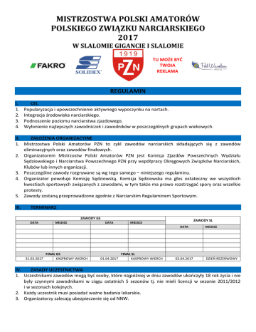 MISTRZOSTWA POLSKI AMATORÓW POLSKIEGO ZWIĄZKU NARCIARSKIEGO 2017 W SLALOMIE GIGANCIE I SLALOMIE TU MOŻE BYĆ TWOJA REKLAMA REGULAMIN I. 1. 2. 3. 4. CEL Popularyzacja i upowszechnienie aktywnego wypoczynku na nartach. Integracja środowiska narciarskiego. Podnoszenie poziomu narciarstwa zjazdowego. Wyłonienie najlepszych zawodniczek i zawodników w poszczególnych grupach wiekowych. II. ZAŁOŻENIA ORGANIZACYJNE 1. Mistrzostwa Polski Amatorów PZN to cykl zawodów narciarskich składających się z zawodów eliminacyjnych oraz zawodów finałowych. 2. Organizatorem Mistrzostw Polski Amatorów PZN jest Komisja Zjazdów Powszechnych Wydziału Sędziowskiego i Narciarstwa Powszechnego PZN przy współpracy Okręgowych Związków Narciarskich, Klubów lub innych organizacji. 3. Poszczególne zawody rozgrywane są wg tego samego – niniejszego regulaminu. 4. Organizator powołuje Komisję Sędziowską. Komisja Sędziowska ma głos ostateczny we wszystkich kwestiach sportowych związanych z zawodami, w tym także ma prawo rozstrzygać spory oraz wszelkie protesty. 5. Zawody zostaną przeprowadzone zgodnie z Narciarskim Regulaminem Sportowym. III. TERMINARZ ZAWODY GS DATA MIEJSCE ZAWODY SL DATA MIEJSCE DATA 31.03.2017 FINAŁ GS KASPROWY WIERCH 01.04.2017 FINAŁ SL KASPROWY WIERCH 02.04.2017 MIEJSCE DZIEŃ REZERWOWY IV. ZASADY UCZESTNICTWA 1. Uczestnikami zawodów mogą być osoby, które najpóźniej w dniu zawodów ukończyły 18 rok życia i nie były czynnymi zawodnikami w ciągu ostatnich 5 sezonów tj. nie mieli licencji w sezonie 2011/2012 i w sezonach kolejnych. 2. Każdy uczestnik musi posiadać ważne badania lekarskie. 3. Organizatorzy zalecają ubezpieczenie się od NNW. V. PROGRAM ZAWODÓW 1. Mistrzostwa Polski Amatorów PZN zostaną rozegrane w następujących konkurencjach: - slalom gigant kobiet i mężczyzn, - slalom kobiet i mężczyzn. 2. O kolejności startów w zawodach Mistrzostw Polski Amatorów PZN decyduje: a) w zawodach eliminacyjnych (slalom gigant i slalom): - I przejazd - na podstawie losowania w grupach, - II przejazd - pierwsza piętnastka w odwróconej kolejności, następnie pozostali zawodnicy wg kolejności miejsc zajętych w I przejeździe. b) w zawodach finałowych decyduje (slalom gigant i slalom): - I przejazd - na podstawie losowania w grupach, - II przejazd - pierwsza piętnastka w odwróconej kolejności, następnie pozostali zawodnicy wg kolejności miejsc zajętych w I przejeździe. VI. PUNKTACJA ELIMINACJI 1. W każdych zawodach eliminacyjnych zdobywamy punkty wg poniższej tabeli: MIEJSCE PUNKTY I II III IV V VI VII VIII IX X XI XII XIII-XX XXI - 100 80 60 50 45 40 35 30 25 20 15 10 5 0 2. Do startu w zawodach finałowych Mistrzostw Polski Amatorów PZN 2017 kwalifikuje się każda osoba, która uzyskała minimum 60 pkt. 3. Kobiety urodzone w 1951 roku i starsze oraz mężczyźni urodzeni w 1941 i starsi uzyskują kwalifikacje do zawodów finałowych Mistrzostw Polski Amatorów PZN 2016 po uzyskaniu minimum 20 punktów VII. GRUPY WIEKOWE 1. W zawodach eliminacyjnych i zawodach finałowych wprowadza się następujący podział na grupy wiekowe: MĘŻCZYŹNI KOBIETY GRUPA I 66 lat i więcej 1951 GRUPA I 56 i więcej 1961 GRUPA II 56 - 65 lat 1961 - 1952 GRUPA II 46 - 55 lat 1971 - 1962 GRUPA III 46 - 55 lat 1971 - 1962 GRUPA III 36 - 45 lat 1981 - 1972 GRUPA IV 36 - 45 lat 1981 - 1972 GRUPA IV 18 - 35 lat 1999 - 1982 GRUPA V 18 - 35 lat 1999 - 1982 2. W związku z prowadzoną podczas zawodów eliminacyjnych klasyfikacją Pucharu Polski Amatorów nie dopuszcza się możliwości łączenia grup. VIII. NAGRODY 1. Nagrody rzeczowe w poszczególnych zawodach eliminacyjnych funduje organizator w zależności od możliwości finansowych. IX. ZASADY FINANSOWANIA 1. Mistrzostwa Polski Amatorów PZN w narciarstwie alpejskim finansowane są: - ze środków finansowych pozyskanych przez organizatora z Polskiego Związku Narciarskiego, - ze środków finansowych pozyskanych przez organizatora z urzędów administracji publicznej, - ze środków finansowych pozyskanych przez organizatora z od sponsorów, - przez uczestników poprzez wpłacenie wpisowego (szczegóły w komunikatach dotyczących poszczególnych zawodów). 2. W ramach pozyskanych środków organizator zawodów eliminacyjnych i finałowych zapewnia: - pełną organizację zawodów (wynajęcie stoku, pomiar czasu, obsługę biura zawodów, obsługę techniczną, obsługę sędziowską), - obsługę medyczną w tym TOPR/GOPR, - ubezpieczenie OC organizatora, - w miarę możliwości finansowych nagrody. 3. Uczestnicy we własnym zakresie pokrywają koszty przejazdów, zakwaterowania, wyżywienia, wpisowego oraz przejazdów wyciągami narciarskimi. 4. Organizator zawodów eliminacyjnych odprowadza na konto Polskiego Związku Narciarskiego opłatę w wysokości 10 zł od każdego uczestnika eliminacji. Opłata przeznaczona jest na koszty organizacyjne. X. ODWOŁANIA I PROTESTY 1. W trakcie trwania zawodów wszelkie sprawy sporne, odwołania i protesty rozpatruje Komisja Sędziowska. 2. Od decyzji Komisji Sędziowskiej lub w przypadku naruszenia regulaminu zawodów można składać odwołania i protesty (na piśmie) do Komisji Zjazdów Powszechnych Wydziału Sędziowskiego i Narciarstwa Powszechnego PZN w terminie 7 dni od zakończenia imprezy, jednocześnie wpłacając kaucję w wysokości 500,00 zł na konto PZN. W przypadku uznania protestu kaucja podlega zwrotowi. 3. Od decyzji Komisji Zjazdów Powszechnych Wydziału Sędziowskiego i Narciarstwa Powszechnego PZN odwołanie nie przysługuje. XI. ZGŁOSZENIA 1. Wszystkie dokumenty, informacje, komunikaty i wyniki znajdują się na stronie: www.wnp.pzn.pl. 2. Zgłoszenie do poszczególnych zawodów musi zostać wykonane w terminie określonym w komunikacie organizacyjnym dotyczącym danych zawodów. 3. Zgłoszenia do poszczególnych zawodów eliminacyjnych dokonuje się u organizatorów lokalnych wg zasad określonych w komunikacie organizacyjnym dotycz