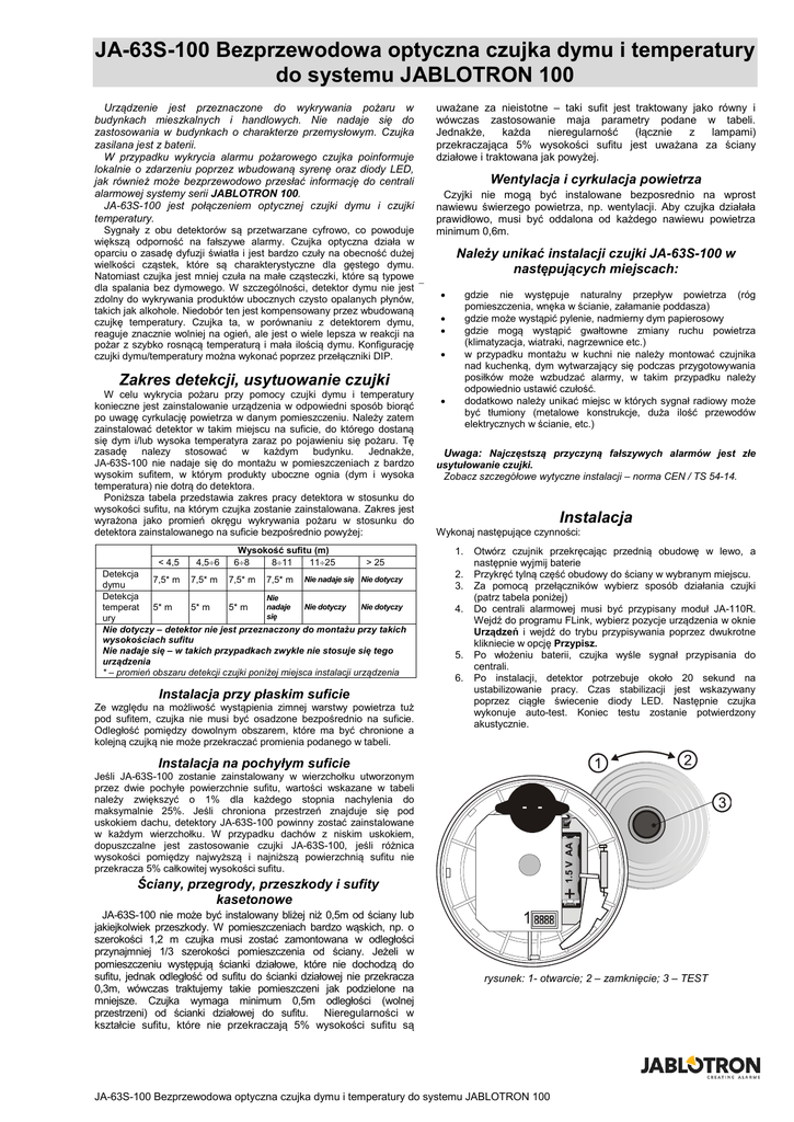 JA-63S-100 Bezprzewodowa optyczna czujka dymu i temperatury do systemu JABLOTRON 100 Urządzenie jest przeznaczone do wykrywania pożaru w budynkach mieszkalnych i handlowych. Nie nadaje się do zastosowania w budynkach o charakterze przemysłowym. Czujka zasilana jest z baterii. W przypadku wykrycia alarmu pożarowego czujka poinformuje lokalnie o zdarzeniu poprzez wbudowaną syrenę oraz diody LED, jak również może bezprzewodowo przesłać informację do centrali alarmowej systemy serii JABLOTRON 100. JA-63S-100 jest połączeniem optycznej czujki dymu i czujki temperatury. Sygnały z obu detektorów są przetwarzane cyfrowo, co powoduje większą odporność na fałszywe alarmy. Czujka optyczna działa w oparciu o zasadę dyfuzji światła i jest bardzo czuły na obecność dużej wielkości cząstek, które są charakterystyczne dla gęstego dymu. Natomiast czujka jest mniej czuła na małe cząsteczki, które są typowe dla spalania bez dymowego. W szczególności, detektor dymu nie jest zdolny do wykrywania produktów ubocznych czysto opalanych płynów, takich jak alkohole. Niedobór ten jest kompensowany przez wbudowaną czujkę temperatury. Czujka ta, w porównaniu z detektorem dymu, reaguje znacznie wolniej na ogień, ale jest o wiele lepsza w reakcji na pożar z szybko rosnącą temperaturą i mała ilością dymu. Konfigurację czujki dymu/temperatury można wykonać poprzez przełączniki DIP. uważane za nieistotne – taki sufit jest traktowany jako równy i wówczas zastosowanie maja parametry podane w tabeli. Jednakże, każda nieregularność (łącznie z lampami) przekraczająca 5% wysokości sufitu jest uważana za ściany działowe i traktowana jak powyżej. Wentylacja i cyrkulacja powietrza Czyjki nie mogą być instalowane bezposrednio na wprost nawiewu świerzego powietrza, np. wentylacji. Aby czujka działała prawidłowo, musi być oddalona od każdego nawiewu powietrza minimum 0,6m. Należy unikać instalacji czujki JA-63S-100 w następujących miejscach: gdzie nie występuje naturalny przepływ powietrza (róg pomieszczenia, wnęka w ścianie, załamanie poddasza) gdzie może wystąpić pylenie, nadmierny dym papierosowy gdzie mogą wystąpić gwałtowne zmiany ruchu powietrza (klimatyzacja, wiatraki, nagrzewnice etc.) w przypadku montażu w kuchni nie należy montować czujnika nad kuchenką, dym wytwarzający się podczas przygotowywania posiłków może wzbudzać alarmy, w takim przypadku należy odpowiednio ustawić czułość. dodatkowo należy unikać miejsc w których sygnał radiowy może być tłumiony (metalowe konstrukcje, duża ilość przewodów elektrycznych w ścianie, etc.) Zakres detekcji, usytuowanie czujki W celu wykrycia pożaru przy pomocy czujki dymu i temperatury konieczne jest zainstalowanie urządzenia w odpowiedni sposób biorąć po uwagę cyrkulację powietrza w danym pomieszczeniu. Należy zatem zainstalować detektor w takim miejscu na suficie, do którego dostaną się dym i/lub wysoka temperatyra zaraz po pojawieniu się pożaru. Tę zasadę nalezy stosować w każdym budynku. Jednakże, JA-63S-100 nie nadaje się do montażu w pomieszczeniach z bardzo wysokim sufitem, w którym produkty uboczne ognia (dym i wysoka temperatura) nie dotrą do detektora. Poniższa tabela przedstawia zakres pracy detektora w stosunku do wysokości sufitu, na którym czujka zostanie zainstalowana. Zakres jest wyrażona jako promień okręgu wykrywania pożaru w stosunku do detektora zainstalowanego na suficie bezpośrednio powyżej: < 4,5 4,56 Wysokość sufitu (m) 68 811 1125 Uwaga: Najczęstszą przyczyną fałszywych alarmów jest złe usytułowanie czujki. Zobacz szczegółowe wytyczne instalacji – norma CEN / TS 54-14. Instalacja Wykonaj następujące czynności: 1. > 25 Detekcja 7,5* m 7,5* m 7,5* m 7,5* m Nie nadaje się Nie dotyczy dymu Detekcja Nie nadaje Nie dotyczy Nie dotyczy temperat 5* m 5* m 5* m się ury Nie dotyczy – detektor nie jest przeznaczony do montażu przy takich wysokościach sufitu Nie nadaje się – w takich przypadkach zwykle nie stosuje się tego urządzenia * – promień obszaru detekcji czujki poniżej miejsca instalacji urządzenia Instalacja przy płaskim suficie Ze względu na możliwość wystąpienia zimnej warstwy powietrza tuż pod sufitem, czujka nie musi być osadzone bezpośrednio na suficie. Odległość pomiędzy dowolnym obszarem, które ma być chronione a kolejną czujką nie może przekraczać promienia podanego w tabeli. 2. 3. 4. 5. 6. Otwórz czujnik przekręcając przednią obudowę w lewo, a następnie wyjmij baterie Przykręć tylną część obudowy do ściany w wybranym miejscu. Za pomocą przełączników wybierz sposób działania czujki (patrz tabela poniżej) Do centrali alarmowej musi być przypisany moduł JA-110R. Wejdź do programu FLink, wybierz pozycje urządzenia w oknie Urządzeń i wejdź do trybu przypisywania poprzez dwukrotne klikniecie w opcję Przypisz. Po włożeniu baterii, czujka wyśle sygnał przypisania do centrali. Po instalacji, detektor potrzebuje około 20 sekund na ustabilizowanie pracy. Czas stabilizacji jest wskazywany poprzez ciągłe świecenie diody LED. Następnie czujka wykonuje auto-test. Koniec testu zostanie potwierdzony akustycznie. Instalacja na pochyłym suficie Jeśli JA-63S-100 zostanie zainstalowany w wierzchołku utworzonym przez dwie pochyłe powierzchnie sufitu, wartości wskazane w tabeli należy zwiększyć o 1% dla każdego stopnia nachylenia do maksymalnie 25%. Jeśli chroniona przestrzeń znajduje się pod uskokiem dachu, detektory JA-63S-100 powinny zostać zainstalowane w każdym wierzchołku. W przypadku dachów z niskim uskokiem, dopuszczalne jest zastosowanie czujki JA-63S-100, jeśli różnica wysokości pomiędzy najwyższą i najniższą powierzchnią sufitu nie przekracza 5% całkowitej wysokości sufitu. Ściany, przegrody, przeszkody i sufity kasetonowe JA-63S-100 nie może być instalowany bliżej niż 0,5m od ściany lub 