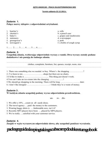JĘZYK ANGIELSKI - PRACA DŁUGOTERMINOWA NR3 Termin oddania-22.12.2011r. Zadanie 1. Połącz nazwy sklepów z odpowiednimi artykułami. 1. 2. 3. 4. 5. 6. butcher’s chemist’s baker’s stationery greengrocer’s newsagent’s a. rolls b. a pencil case c. grapes and mushrooms d. a newspaper e. pork f. a bottle of cough syrup 1…… 2…… 3…… 4…… 5….. 6…… Zadanie 2. Uzupełnij zdania, wybierając odpowiednie wyrazy z ramki. Dwa wyrazy zostały podane dodatkowo i nie pasują do żadnego zdania. ………………………………………………………………………………………………………………… clothes, complaint, furniture, list, queues, receipt, room, size ………………………………………………………………………………………………………………… 1. There was something else we needed to buy. Where’s the shopping ……………….? 2. I’ve been to ten ……………………….shops but there are no chairs. 3.I’d like to make a …………………………… This thing just doesn’t work. 4.You can’t take an ice-cream into the changing ……………….! 5.We should go shopping in the morning. There will be long ………………………later. 6. I don’t like designer ………………………….- I think they’re a waste of money. Zadanie 3 . W każdym zdaniu uzupełnij podany wyraz odpowiednim przedrostkiem. un- re- dis- 1. We offer a 10% ....count on all suede shoes. 2. The travel agency ….paid the money to the customers. 3. Wearing baggy shirts is .…fashionable now, isn’t it? 4. Recently MP3 players have been ….placed by MP4 players. 5. We’re really ….satisfied with your customer service. Zadanie 4. Znajdź w wężu wyrazowym odpowiednie słowa, aby uzupełnić poniższe wyrażenia. 1. …………………… compartment 2…..………………...… photos 3. ……………………..-decker bus 6. ……………………… book 7. ……………………… holiday 8. ……………………… diving 4 a …………………… ticket 9. ………………………site 5. ……………………... sightseeing 10. ……………………... tickets Zadanie 5. Uzupełnij zdania wyrazami z ramki. Jeden wyraz został podany dodatkowo. ………………………………………………………………………………………………………… straight, by, get, far, right, single, turn, directions ………………………………………………………………………………………………………… 1. Excuse me, how…………is the nearest cash machine? 2. How do I …………to the Baker Street? 3. Should I go ………………this street? ‘No, you have to turn left on the next lights.’ 4. The monument will be on your …………….. . 5. If you don’t know the road, ask for ……………… . 6. Do you prefer to travel ……sea or air? 7. Take the next …………..on your left. Zadanie 6. Podaj formę czasownika Past Participle. 1.be ………………. 2.become……………. 3.buy………………… 4.do…………………. 5.give………………. 6.go………………… 7.leave……………… 8.ride……………….. 9.see………………… 10.sing……………… 11.speak……………. 12.swim……………. 13.take……………... 14.think……………. 15.wake……………. 16.wear..................... Zadanie 7. Uzupełnij zwroty since lub for. 1……………..three years 2……………..November 3……………..last Sunday 4……………..five days 5……………..1995 6………………months 7………………last five months 8………………long time 9………………our last meeting 10…………….ages Zadanie 8 . Przepisz podane zdania , używając słów podanych w nawiasach. 1.Mark last Saw Helen two days ago. (for) Mark…………………………………………..…two days. 2. That’s the best exhibition ever. (never) I…………………………………………...…..…a better exhibition. 3. We haven’t visited Paris before. (first) This is ………………………………..………….Paris 4. He is still reading a book.(finished) He……………………………………………..…the book. 5.They moved to Warsaw two years ago.(live) They …………………………………………......two years. Zadanie 9 . Uzupełnij zdania jedną spośród dwóch możliwych odpowiedzi. 1. I .......... a vacation for six years. a) didn't have b) haven't had 2. We ....... to the cinema on Friday night. a) haven't gone b) didn't go 3. I ....... new car two days ago. a) bought b) have bought 4. I .......... Spanish in 2000 a) learnt b) have learnt 5. He ....... some money in London last year. a) has earned b) earned 6. The weather ....... gorgeous for the whole fortnight we were there. a) was b) has been 7. I ...... dog for a walk because weather was terrible. a) haven't taken b) didn't take Zadanie 10. Popraw błędy gramatyczne. 1. We have bought a new sofa last month ………………………………………………………. 2. Jim lives in Germany for three years …………………………………………………………. 3. My father has already went fishing…………………………………………………………... 4. She is just moved house………………………………………………………………………. 5. We have eaten lunch at one o'clock. …………………………………………………………. 6. Sophie has do her homework. ……………………………………………………………….. 7. Ann and Tim have got married ten years ago. ………………………………………………. 8. I am at school since nine o'clock. ……………………………………………………………. Zadanie 11. Uzupełnij tabelkę formami przymiotników i pr