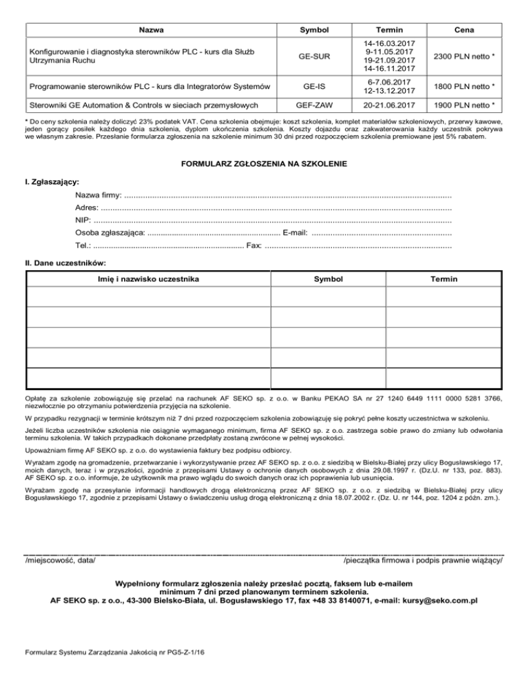 Nazwa Konfigurowanie i diagnostyka sterowników PLC - kurs dla Służb Utrzymania Ruchu Programowanie sterowników PLC - kurs dla Integratorów Systemów Sterowniki GE Automation & Controls w sieciach przemysłowych Symbol Termin Cena GE-SUR 14-16.03.2017 9-11.05.2017 19-21.09.2017 14-16.11.2017 2300 PLN netto * GE-IS 6-7.06.2017 12-13.12.2017 1800 PLN netto * GEF-ZAW 20-21.06.2017 1900 PLN netto * * Do ceny szkolenia należy doliczyć 23% podatek VAT. Cena szkolenia obejmuje: koszt szkolenia, komplet materiałów szkoleniowych, przerwy kawowe, jeden gorący posiłek każdego dnia szkolenia, dyplom ukończenia szkolenia. Koszty dojazdu oraz zakwaterowania każdy uczestnik pokrywa we własnym zakresie. Przesłanie formularza zgłoszenia na szkolenie minimum 30 dni przed rozpoczęciem szkolenia premiowane jest 5% rabatem. FORMULARZ ZGŁOSZENIA NA SZKOLENIE I. Zgłaszający: Nazwa firmy: ............................................................................................................................................ Adres: ...................................................................................................................................................... NIP: ......................................................................................................................................................... Osoba zgłaszająca: ............................................................ E-mail: ............................................................ Tel.: .................................................................... Fax: ................................................................................ II. Dane uczestników: Imię i nazwisko uczestnika Symbol Termin Opłatę za szkolenie zobowiązuję się przelać na rachunek AF SEKO sp. z o.o. w Banku PEKAO SA nr 27 1240 6449 1111 0000 5281 3766, niezwłocznie po otrzymaniu potwierdzenia przyjęcia na szkolenie. W przypadku rezygnacji w terminie krótszym niż 7 dni przed rozpoczęciem szkolenia zobowiązuję się pokryć pełne koszty uczestnictwa w szkoleniu. Jeżeli liczba uczestników szkolenia nie osiągnie wymaganego minimum, firma AF SEKO sp. z o.o. zastrzega sobie prawo do zmiany lub odwołania terminu szkolenia. W takich przypadkach dokonane przedpłaty zostaną zwrócone w pełnej wysokości. Upoważniam firmę AF SEKO sp. z o.o. do wystawienia faktury bez podpisu odbiorcy. Wyrażam zgodę na gromadzenie, przetwarzanie i wykorzystywanie przez AF SEKO sp. z o.o. z siedzibą w Bielsku-Białej przy ulicy Bogusławskiego 17, moich danych, teraz i w przyszłości, zgodnie z przepisami Ustawy o ochronie danych osobowych z dnia 29.08.1997 r. (Dz.U. nr 133, poz. 883). AF SEKO sp. z o.o. informuje, że użytkownik ma prawo wglądu do swoich danych oraz ich poprawienia lub usunięcia. Wyrażam zgodę na przesyłanie informacji handlowych drogą elektroniczną przez AF SEKO sp. z o.o. z siedzibą w Bielsku-Białej przy ulicy Bogusławskiego 17, zgodnie z przepisami Ustawy o świadczeniu usług drogą elektroniczną z dnia 18.07.2002 r. (Dz. U. nr 144, poz. 1204 z późn. zm.). /miejscowość, data/ /pieczątka firmowa i podpis prawnie wiążący/ Wypełniony formularz zgłoszenia należy przesłać pocztą, faksem lub e-mailem minimum 7 dni przed planowanym terminem szkolenia. AF SEKO sp. z o.o., 43-300 Bielsko-Biała, ul. Bogusławskiego 17, fax +48 33 8140071, e-mail: [email protected] Formularz Systemu Zarządzania Jakością nr PG5-Z-1/16
