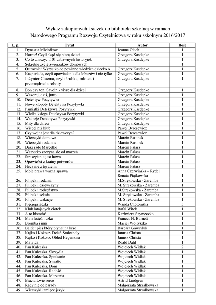 Wykaz zakupionych książek do biblioteki szkolnej w ramach Narodowego Programu Rozwoju Czytelnictwa w roku szkolnym 2016/2017 L. p. 1. 2. 3. 4. 5. 6. 7. Tytuł Dynastia Miziołków Horror! Czyli skąd się biorą dzieci Co to znaczy…101 zabawnych historyjek Sekretne życie zwierzaków domowych Ostrożnie! Wszystko co powinno wiedzieć dziecko o... Kacperiada, czyli opowiadania dla łobuzów i nie tylko Inżynier Ciućma, czyli śrubka, młotek i przemądrzałe roboty 8. 9. 10. 11. 12. 13. 14. 15. 16. 17. 18. 19. 20. 21. 22. 23. 24. 25. Bon czy ton. Savoir - vivre dla dzieci Wczoraj, dziś, jutro Detektyw Pozytywka Nowe kłopoty Detektywa Pozytywki Pamiątki Detektywa Pozytywki Wielka księga Detektywa Pozytywki Wakacje Detektywa Pozytywki Mity dla dzieci Więcej niż klub Czy wojna jest dla dziewczyn? Wierszyki domowe Wierszyki rodzinne Dasz radę Marcelko Wszystko zaczyna się od marzeń Straszyć nie jest łatwo Opowieści z krainy potworów Heca nie z tej ziemi Moje prawa ważna sprawa 26. 27. 28. 29. 30. 31. 32. 33. 34. 35. 36. 37. 38. 39. 40. 41. 42. 43. 44. 45. 46. 47. 48. 49. Filipek i rodzina Filipek i dziewczyny Filipek i rodzeństwo Filipek i szkoła Filipek i wakacje Pięciopsiaczki Klub latających ciotek A to historia! Mała księżniczka Bromba i inni Baltic: pies który płynął na krze Kajko i Kokosz. Dzień Śmiechały Kajko i Kokosz. Obłęd Hegemona Matylda Pan Kuleczka Pan Kuleczka. Skrzydła Pan Kuleczka. Spotkanie Pan Kuleczka. Światło Pan Kuleczka. Dom Pan Kuleczka. Radość Pan Kuleczka. Marzenia Bracia Lwie serce Rady nie od parady Wierszyki łamiące języki Autor Joanna Olech Grzegorz Kasdepke Grzegorz Kasdepke Grzegorz Kasdepke Grzegorz Kasdepke Grzegorz Kasdepke Grzegorz Kasdepke Grzegorz Kasdepke Grzegorz Kasdepke Grzegorz Kasdepke Grzegorz Kasdepke Grzegorz Kasdepke Grzegorz Kasdepke Grzegorz Kasdepke Paweł Beręsewicz Paweł Beręsewicz Marcin Rusinek Marcin Rusinek Marcin Pałasz Marcin Pałasz Marcin Pałasz Marcin Pałasz Marcin Pałasz Anna Czerwińska – Rydel Renata Piątkowska M.Strękowska - Zaremba M. Strękowska - Zaremba M.Strękowska - Zaremba M. Strękowska - Zaremba M. Strękowska - Zaremba Wanda Chotomska Rafał Witek Kazimierz Szymeczko Frances H. Burnett Maciej Wojtyszko Barbara Gawryluk Janusz Christa Janusz Christa Roald Dahl Wojciech Widłak Wojciech Widłak Wojciech Widłak Wojciech Widłak Wojciech Widłak Wojciech Widłak Wojciech Widłak Astrid Lindgren Małgorzata Strzałkowska Małgorzata Strzałkowska Ilość 1 1 1 1 1 1 1 1 1 1 1 1 1 1 1 1 1 1 1 1 1 1 1 1 1 1 1 1 1 1 5 1 1 1 1 1 1 1 1 2 1 1 1 1 1 1 1 1 1 50. 51. 52. 53. 54. 55. 56. 57. 58. 59. 60. 61. 62. 63. 64. 65. 66. 67. 68. 69. 70. 71. 72. 73. 74. 75. 76. 77. 78. 79. 80. 81. 82. 83. 84. 85. Wierszyki na giętkie języki Uczę się wymawiać. Z muchą na luzie ćwiczymy buzie Pamiętnik Blumki Pinokio Baśnie braci Grimm Legendy polskie Baśnie polskie W pustyni i w puszczy Szatan z siódmej klasy Kłopoty rodu Pożyczalskich Chłopcy z Placu Broni Dżok. Legenda o psiej wierności Ilustrowany słownik frazeologiczny dla dzieci S Słownik ortogragiczny dla uczniów klas 1 - 6 Dziennik cwaniaczka. Dziennik cwaniaczka. Rodrick rządzi Dziennik cwaniaczka. Szczyt wszystkiego Dziennik cwaniaczka. Ubaw po pachy Dziennik cwaniaczka.Przykra prawda. Dziennik cwaniaczka. Biała gorączka Dziennik cwaniaczka. Trzeci do pary Dziennik cwaniaczka. Zezowate szczęście Dziennik cwaniaczka. Stara bieda. Dziennik cwaniaczka. Droga przez mękę MMagiczne drzewo. Czerwone krzesło Gry i zabawy z dawnych lat Zezia i wszystkie problemy świata Zezia, Giler i Oczak Piątka z Zakątka Piątka z Zakątka zwowu w akcji Nowe przygody Piątki z Zakątka Banda z Uroczyska Marek – chłopiec, który miał marzenia Trzynastka na karku Po co mi chłopak? Dzień czekolady 86. 87. 88. 89. 90. 91. 92. 93. 94. 95. 96. 97. 98. 99. 100. 101. 102. 103. 104. Dziesięć stron świata Marcelka i szkolne sprawy Przygody Koziołka Matołka cz. 2 Przygody Koziołka Matołka cz. 3 Przygody Koziołka Matołka cz. 4 Już czytam. Michał i złoty puchar Już czytam. Tajemnica weneckiej maski Już czytam. Upiorne andrzejki. Już czytam. Zbawcy ksiażek Tuwim dzieciom Król Maciuś Pierwszy Psie troski O psie, który jeździł koleją Pollyanna Najpiękniejsze wiersze dla dzieci Nowe fikołki Pana Pierdziołki Wiejskie gryzmoł ki Pana Pierdziołki Tytus, Romek i Atomek. Tytus internautą Bezpieczne dziecko. Powiedz komuś Maurycy Polaski Marta Galewska - Kustra Iwona Chmielewska Carlo Collodi Wanda Chotomska Henryk Sienkiewicz Kornel Makuszyński Mary Norton Ferenc Molnar Barbara Gawryluk A.Nożyńska – Demianiuk Jeff Kinney Jeff Kinney Jeff Kinney Jeff Kinney Jeff Kinney Jeff Kinney Jeff Kinney Jeff Kinney Jeff Kinney Jeff Kinney Andrzej Maleszka Katarzyna Piętka Agnieszka Chylińska Agnieszka Chylińska Krystyna Drzewiecka Krystyna Drzewiecka Krystyna Drzewiecka Krystyna Drzewiecka Marek Kamiński Katarzyna Majgier Katarzyna Majgier Anna Onichimowska, Emilia Dziubak Anna Onichimowska Marcin Pałasz Kornel Makuszyński Kornel Makuszyński Kornel Makuszyński Agnieszka Stelmaszyk Agnieszka Stelmaszyk Agnieszka Stelmaszyk Agnieszka Stelmaszyk Julian Tuwim Janusz Korczak Tom Justyniarski Roman Pisarski E. H. Porter Jan Brzechwa Henryk Jerzy Chmielewski Elżbieta Zubrzycka 1 2 1 4 2 1 2 7 4 1 5 1 1 10 1 1 1 1 1 1 1 1 1 1 1 1 1 1 1 1 1 1 1 1 1 1 1 3 3 3 1 1 1 1 2 3 1 10 1 2 1 1 1 1 105. 106. 107. 108. 109. 110. 111. 112. 113. 114. 115. 116. 117. 118. 119. 120. 121. 122. 123. 124. 125. 126. 127. 128. 129. 130. 131. 132. Bezpieczne dziecko. Słup soli Dziewczyna I chłopak, czyli heca na 14 fajerek Kajko i Kokosz. Na wczasach. Bezpieczne dziecko. Po co się złościć? Nieustraszona babcia Adela i kosmiczna przygoda Wakacje z duchami Bezpieczne dziecko. Dobre i złe sekrety Dręczyciel w klasie Muminki. Księga pierwsza Muminki. Księga druga Kocie historie. Nowe kocie historie Baśnie znanie i nieznane Różne spos