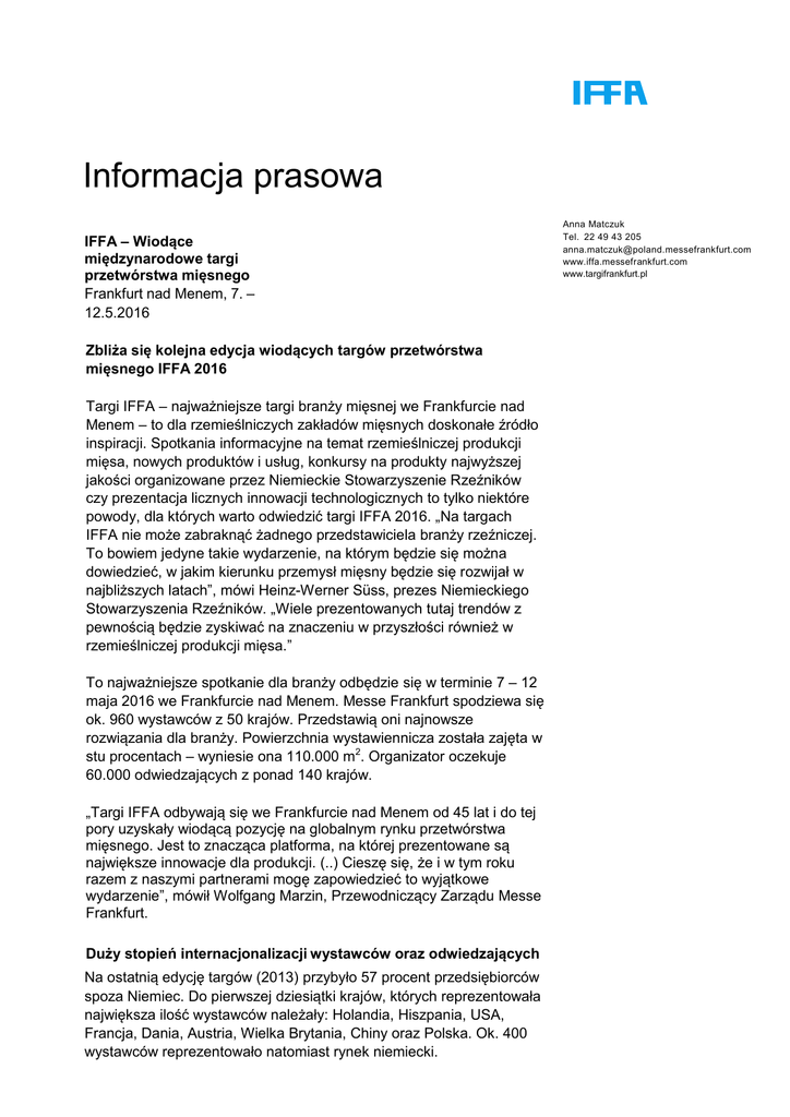 Informacja prasowa IFFA – Wiodące międzynarodowe targi przetwórstwa mięsnego Frankfurt nad Menem, 7. – 12.5.2016 Zbliża się kolejna edycja wiodących targów przetwórstwa mięsnego IFFA 2016 Targi IFFA – najważniejsze targi branży mięsnej we Frankfurcie nad Menem – to dla rzemieślniczych zakładów mięsnych doskonałe źródło inspiracji. Spotkania informacyjne na temat rzemieślniczej produkcji mięsa, nowych produktów i usług, konkursy na produkty najwyższej jakości organizowane przez Niemieckie Stowarzyszenie Rzeźników czy prezentacja licznych innowacji technologicznych to tylko niektóre powody, dla których warto odwiedzić targi IFFA 2016. „Na targach IFFA nie może zabraknąć żadnego przedstawiciela branży rzeźniczej. To bowiem jedyne takie wydarzenie, na którym będzie się można dowiedzieć, w jakim kierunku przemysł mięsny będzie się rozwijał w najbliższych latach”, mówi Heinz-Werner Süss, prezes Niemieckiego Stowarzyszenia Rzeźników. „Wiele prezentowanych tutaj trendów z pewnością będzie zyskiwać na znaczeniu w przyszłości również w rzemieślniczej produkcji mięsa.” To najważniejsze spotkanie dla branży odbędzie się w terminie 7 – 12 maja 2016 we Frankfurcie nad Menem. Messe Frankfurt spodziewa się ok. 960 wystawców z 50 krajów. Przedstawią oni najnowsze rozwiązania dla branży. Powierzchnia wystawiennicza została zajęta w stu procentach – wyniesie ona 110.000 m2. Organizator oczekuje 60.000 odwiedzających z ponad 140 krajów. „Targi IFFA odbywają się we Frankfurcie nad Menem od 45 lat i do tej pory uzyskały wiodącą pozycję na globalnym rynku przetwórstwa mięsnego. Jest to znacząca platforma, na której prezentowane są największe innowacje dla produkcji. (..) Cieszę się, że i w tym roku razem z naszymi partnerami mogę zapowiedzieć to wyjątkowe wydarzenie”, mówił Wolfgang Marzin, Przewodniczący Zarządu Messe Frankfurt. Duży stopień internacjonalizacji wystawców oraz odwiedzających Na ostatnią edycję targów (2013) przybyło 57 procent przedsiębiorców spoza Niemiec. Do pierwszej dziesiątki krajów, których reprezentowała największa ilość wystawców należały: Holandia, Hiszpania, USA, Francja, Dania, Austria, Wielka Brytania, Chiny oraz Polska. Ok. 400 wystawców reprezentowało natomiast rynek niemiecki. Anna Matczuk Tel. 22 49 43 205 [email protected] www.iffa.messefrankfurt.com www.targifrankfurt.pl Jeśli chodzi o odwiedzających, to i tu większość stanowili zagraniczni branżyści (61%). Szeroka oferta na targach IFFA przyciągnęła przedstawicieli przemysłu, rzemiosła oraz handlu m.in. z takich krajów jak: Rosja, Włochy, Holandia, Hiszpania, Polska, Austria, USA, Szwajcaria oraz Chiny. Zmodernizowana powierzchnia wystawiennicza W tym roku ekspozycję po raz pierwszy będzie można zobaczyć w hali 11. Zostanie tam przedstawiona kompletna oferta dotycząca pakowania, zaopatrzenia, technik pomiarowych i metod ważenia, a także przetwórstwa i cięcia. Wiodący producenci z segmentu rzeźnictwa, ćwiartowania oraz obróbki znajdą się natomiast w hali 9. Hala 8 będzie dedykowana przetwórstwu. Istotną część targów stanowić będzie dział skierowany do rzemieślniczych producentów mięsa w hali 4.1. To właśnie tu będzie można zapoznać się z ofertą najważniejszych wystawców działu „Sprzedaż – wszystko, czego potrzeba specjalistycznym sklepom mięsnym”, a także odwiedzić stoisko Niemieckiego Stowarzyszenia Rzeźników. W hali 4.0 zwiedzający będą mogli poznać trendy i nowości w zakresie wykorzystywanych do produkcji składników, przypraw, substancji pomocniczych, jelit i opakowań. Reprezentowane na targach przedsiębiorstwa są liderami rynku i ważnymi partnerami dla rzemieślniczego przetwórstwa mięsa. IFFA 2016 – najważniejsze tematy Globalny przemysł mięsny jest dynamicznym rynkiem, który cieszy się znacznym wzrostem. W krajach silnie zaludnionych m.in. w Azji, Ameryce Południowej, Europie Wschodniej oraz w Afryce obserwuje się zwiększony popyt na produkty mięsne. W związku z tym, zapotrzebowanie na wydajne urządzenia do przetwórstwa mięsnego w tych krajach również jest większy niż w innych regionach. Dużą rolę odgrywa jakość – coraz większą wagę przywiązuje się do bezpieczeństwa towarów. W krajach zachodnich w centrum zainteresowania znajdują się in. takie kwestie jak optymalizacja produktywności poprzez wydajność energii, łatwe procesy czyszczenia, większą automatyzację oraz rozwiązania przyjazne dla środowiska. W przemyśle mięsnym należy sięgnąć do tendencji oraz przyzwyczajeń konsumentów. Nowymi trendami są hasła takie jak dania typu convenience, „Walking Food” oraz produkty będące substytutem mięsa. Do istotnych zagadnień branżowych należą także inwestycje w rozwiązania wydajne energetycznie, uproszczenie procesów oraz ulepszenia w dziedzinie higieny zarówno w sprzedaży jak i w produkcji. UWAGA!! Chętnych do udziału w zorganizowanym wyjeździe na targi IFFA 2016, przygotowanym przez nasze biuro, zapraszamy do kontaktu: (22) 49 43 207 – p. Małgorzata Bednarska [email protected] Więcej informacji na stronie: www.iffa.com Przedstawicielstwo targów IFFA na Polskę ul. Mołdawska 7/141 02-127 Warszawa Tel. 22 49 43 207 [email protected]