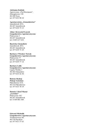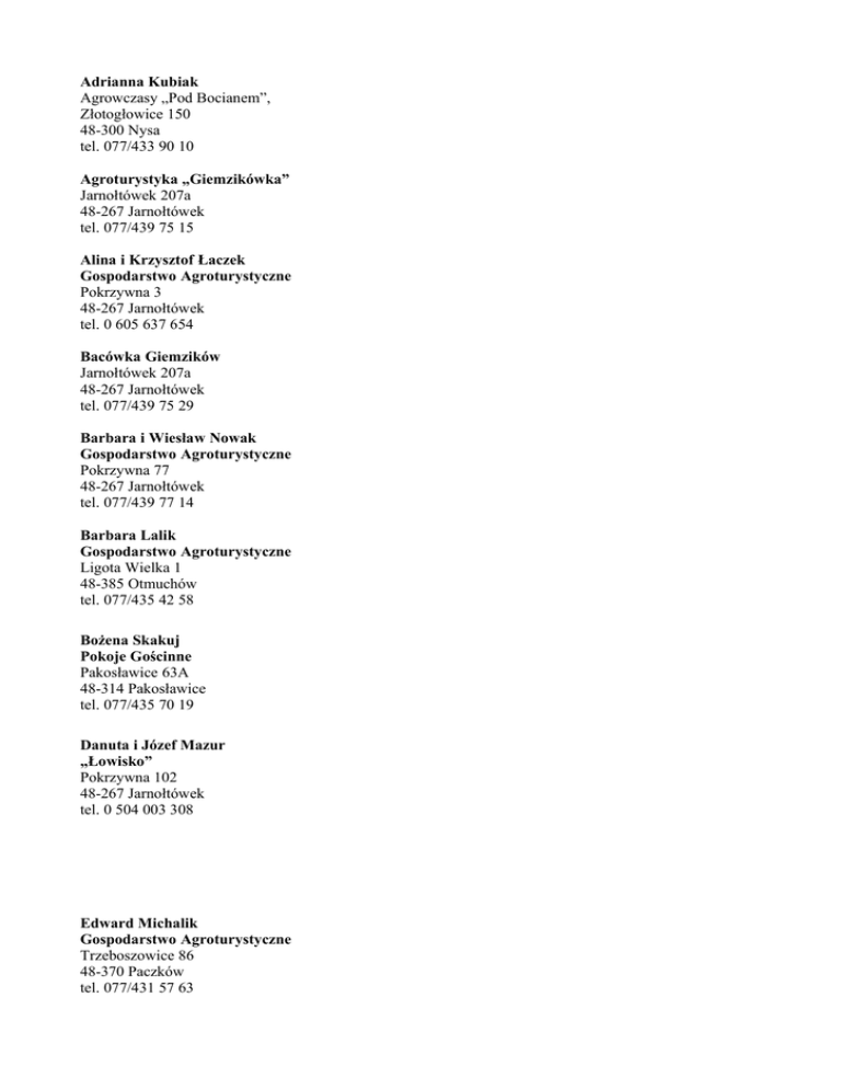 Adrianna Kubiak Agrowczasy „Pod Bocianem”, Złotogłowice 150 48-300 Nysa tel. 077/433 90 10 Agroturystyka „Giemzikówka” Jarnołtówek 207a 48-267 Jarnołtówek tel. 077/439 75 15 Alina i Krzysztof Łaczek Gospodarstwo Agroturystyczne Pokrzywna 3 48-267 Jarnołtówek tel. 0 605 637 654 Bacówka Giemzików Jarnołtówek 207a 48-267 Jarnołtówek tel. 077/439 75 29 Barbara i Wiesław Nowak Gospodarstwo Agroturystyczne Pokrzywna 77 48-267 Jarnołtówek tel. 077/439 77 14 Barbara Lalik Gospodarstwo Agroturystyczne Ligota Wielka 1 48-385 Otmuchów tel. 077/435 42 58 Bożena Skakuj Pokoje Gościnne Pakosławice 63A 48-314 Pakosławice tel. 077/435 70 19 Danuta i Józef Mazur „Łowisko” Pokrzywna 102 48-267 Jarnołtówek tel. 0 504 003 308 Edward Michalik Gospodarstwo Agroturystyczne Trzeboszowice 86 48-370 Paczków tel. 077/431 57 63 Elżbieta Stalowska Gospodarstwo Agroturystyczne Ligota Wielka 65 48-385 Otmuchów tel. 077/431 41 78 Erm Dorota i Witold Ścibórz 39 48-370 Paczków tel. 0 608 476 823 Ewa Wielgosz Gospodarstwo Agroturystyczne Stary Paczków 112 48-370 Paczków tel. 077/431 66 20 Genowefa i Tomasz Jakubowscy Gospodarstwo Agroturystyczne Frydrychów 48-385 Otmuchów tel. 077/431 42 16, 0 609 384 757 Gospodarstwo Agroturystyczne „Kamila” Konradów 87 48-340 Głuchołazy tel. 077/439 42 23 Gospodarstwo Agroturystyczne „Leśnika” Podlesie 76 48-340 Głuchołazy tel. 077/439 23 39 Gospodarstwo Agroturystyczne „Stajnia za tamą” Jarnołtówek 164 48-267 Jarnołtówek tel. 0 607 042 114 Gospodarstwo Agroturystyczne Jarnołtówek 3 48-267 Jarnołtówek tel. 077/439 75 51 Gospodarstwo Agroturystyczne Konradów 112 48-340 Głuchołazy tel. 0 607 044 625 Gospodarstwo Agroturystyczne Pokrzywna 3 48-267 Jarnołtówek tel. 0 605 637 654 Grażyna Kaczmarczyk „Złota Rybka” Grądy 36a 48-300 Nysa tel. 077/433 91 07, 0 507 875 855 Halina i Andrzej Bagińscy Gospodarstwo Agroturystyczne Sarnowice 7 48-385 Otmuchów tel. 077/431 42 44 Harcówka Konradów 189 48-340 Głuchołazy tel. 077/439 43 74 Izabela i Edward Wnęk „Jagoda” Stary Las 104 48-340 Głuchołazy tel. 077/439 70 97 Jadwiga i Jan Kaliszewscy „Jar” Jarnołtówek 173 48-267 Jarnołtówek tel. 077/439 76 64 Jadwiga Ryś Pokoje Gościnne ul. 3-Maja 12 48-304 Nysa tel. 077/431 09 81 Jan Sobek Gospodarstwo Agroturystyczne Sowin 100 48-318 Łambinowice tel. 077/431 34 43, 0 608 018 853 Jolanta i Waldemar Borkowscy Gospodarstwo Agroturystyczne Meszno 6 48-385 Otmuchów tel. 077/431 42 22 Kazimiera Jastrzębska „Słoneczna Zagroda” Konradów 94 48-340 Głuchołazy tel. 077/439 12 87 Małgorzata i Andrzej Kruczkiewicz Gospodarstwo Agroturystyczne Przechód 160 48-324 Przechód tel. 077/436 87 87, 0 693 627 939 Małgorzata Szach „Małgosia” Ścibórz 30a 48-370 Paczków tel. 077/31 37 18 Mateusz Kościelniak Gospodarstwo Rolne Ligota Wielka 9 48-385 Otmuchów tel. 077/431 46 53 Panama Pokrzywna 27a 48-267 Jarnołtówek tel. 077/439 76 56 Pod Kopą Biskupią Jarnołtówek 179 48-267 Jarnołtówek tel. 077/439 75 35 Przy Strumyku Stary Las 132 48-340 Głuchołazy tel. 077/439 71 61 Rafał Jedynak Gospodarstwo Agroturystyczne Sarnowice 27 48-385 Otmuchów tel. 077/431 42 48 Renata i Adrian Zuber Gospodarstwo Rolne Wójcice 25 48-385 Otmuchów tel. 077/431 54 77 Romualda Sommer, „Leśniczówka” Nadziejów 17a 48-364 Kałków tel. 077/439 81 69 RSP Wyszków Spółdzielnia Produkcyjna Wyszków Śl. 48-321 Niwnica tel. 077/435 65 41 Sławomira Machowska „Sonia” Ścibórz 18 48-370 Paczków tel. 077/431 30 51 Stok Agroturystyka Pokrzywna 30a 48-267 Jarnołtówek tel. 077/439 73 73 Tadeusz Dołbiński Gospodarstwo Agroturystyczne Ligota Wielka 59 48-385 Otmuchów tel. 077/435 42 86 Teresa Białkowska Gospodarstwo Agroturystyczne Ligota Wielka 19 48-385 Otmuchów tel. 077/435 42 75 Teresa Zając „Gościniec u Teresy” Stary Las 63 48-340 Głuchołazy tel. 077/439 66 22 Tomasz Zuwała Gospodarstwo Agroturystyczne ul. Długosza 7 48-300 Nysa tel. 0/77 433 08 11, 077/435 57 18 Urszula Bednarz „Urszula” Ścibórz 30 48-370 Paczków tel. 077/431 30 54 Zenowia Murawska Gospodarstwo Agroturystyczne Skorochów 22 48-300 Nysa tel. 077/433 48 01 Zofia Słomska Gospodarstwo Rolne ul. 3-Maja 22 48-304 Nysa tel. 077/435 24 76