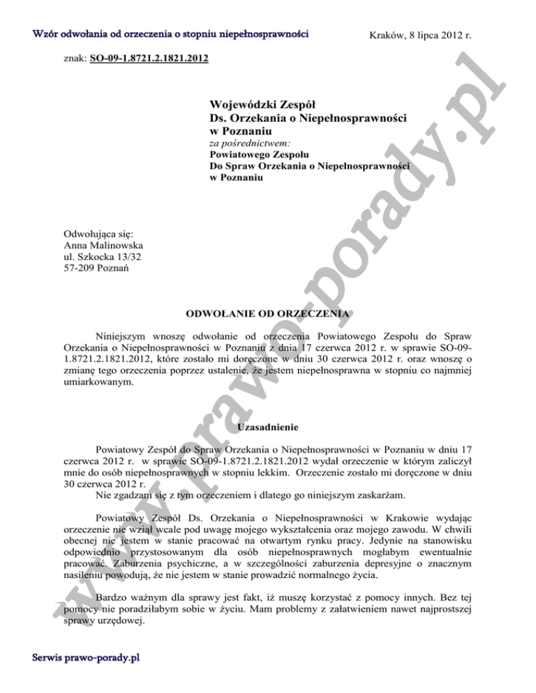 Wzór odwołania od orzeczenia o stopniu niepełnosprawności Kraków, 8 lipca 2012 r. y.p Wojewódzki Zespół Ds. Orzekania o Niepełnosprawności w Poznaniu l znak: SO-09-1.8721.2.1821.2012 ad za pośrednictwem: Powiatowego Zespołu Do Spraw Orzekania o Niepełnosprawności w Poznaniu o-p or Odwołująca się: Anna Malinowska ul. Szkocka 13/32 57-209 Poznań ODWOŁANIE OD ORZECZENIA aw Niniejszym wnoszę odwołanie od orzeczenia Powiatowego Zespołu do Spraw Orzekania o Niepełnosprawności w Poznaniu z dnia 17 czerwca 2012 r. w sprawie SO-091.8721.2.1821.2012, które zostało mi doręczone w dniu 30 czerwca 2012 r. oraz wnoszę o zmianę tego orzeczenia poprzez ustalenie, że jestem niepełnosprawna w stopniu co najmniej umiarkowanym. w. pr Uzasadnienie Powiatowy Zespół do Spraw Orzekania o Niepełnosprawności w Poznaniu w dniu 17 czerwca 2012 r. w sprawie SO-09-1.8721.2.1821.2012 wydał orzeczenie w którym zaliczył mnie do osób niepełnosprawnych w stopniu lekkim. Orzeczenie zostało mi doręczone w dniu 30 czerwca 2012 r. Nie zgadzam się z tym orzeczeniem i dlatego go niniejszym zaskarżam. ww Powiatowy Zespół Ds. Orzekania o Niepełnosprawności w Krakowie wydając orzeczenie nie wziął wcale pod uwagę mojego wykształcenia oraz mojego zawodu. W chwili obecnej nie jestem w stanie pracować na otwartym rynku pracy. Jedynie na stanowisku odpowiednio przystosowanym dla osób niepełnosprawnych mogłabym ewentualnie pracować. Zaburzenia psychiczne, a w szczególności zaburzenia depresyjne o znacznym nasileniu powodują, że nie jestem w stanie prowadzić normalnego życia. Bardzo ważnym dla sprawy jest fakt, iż muszę korzystać z pomocy innych. Bez tej pomocy nie poradziłabym sobie w życiu. Mam problemy z załatwieniem nawet najprostszej sprawy urzędowej. Serwis prawo-porady.pl l Wzór odwołania od orzeczenia o stopniu niepełnosprawności Moje dolegliwości w ostatnim czasie pogłębiły i mimo, że prowadzę stałe leczenie specjalistyczne stan mojego zdrowia nie uległ poprawie. Co więcej stan mojego zdrowia uległ znacznemu pogorszeniu. ad y.p Moim zdaniem lekarze wydający opinię w mojej sprawie w ogóle nie wzięli pod uwagę dokumentacji medycznej i psychologicznej jaką dołączyłam do swojego wniosku. Jak wynika wprost z oceny stanu psychicznego moje zaburzenia znacznie utrudniają mi funkcjonowanie społeczne i zawodowe. Co więcej w chwilach nasilenia objawów praktycznie nie jestem w stanie funkcjonować społecznie i zawodowo. Moja aktywność ze względu na moje schorzenia jest znacznie ograniczona. Mimo prowadzonego leczenia nie jestem w stanie zwiększyć mojej aktywności. or Jest niewątpliwym, że moja zdolność do samodzielnej egzystencji jest w dużym stopniu ograniczona. Nie rozumiem dlaczego nie został ten oczywisty fakt pominięty w wydanym mi orzeczeniu o stopniu niepełnosprawności. Jest niewątpliwym, że stan mojego zdrowia sprawia, a także to, że wymagam pomocy osób trzecich powoduje spełniam przesłanki do otrzymania co umiarkowanego stopnia niepełnosprawności. ww w. pr aw o-p W ostatnim okresie stan mojego zdrowia się pogorszył i nie rokuje poprawy. Proszę o ponowne, dokładne przeanalizowanie mojego stanu zdrowia i możliwości samodzielnej egzystencji na podstawie dokumentacji oraz badań uprawnionych lekarzy. Uważam, że decyzja ustalająca lekki stopień niepełnosprawności jest niesłuszna i niesprawiedliwa i dlatego wnoszę o jej zmianę i o zaliczenie mnie do co najmniej umiarkowanego stopnia niepełnosprawności. Serwis prawo-porady.pl