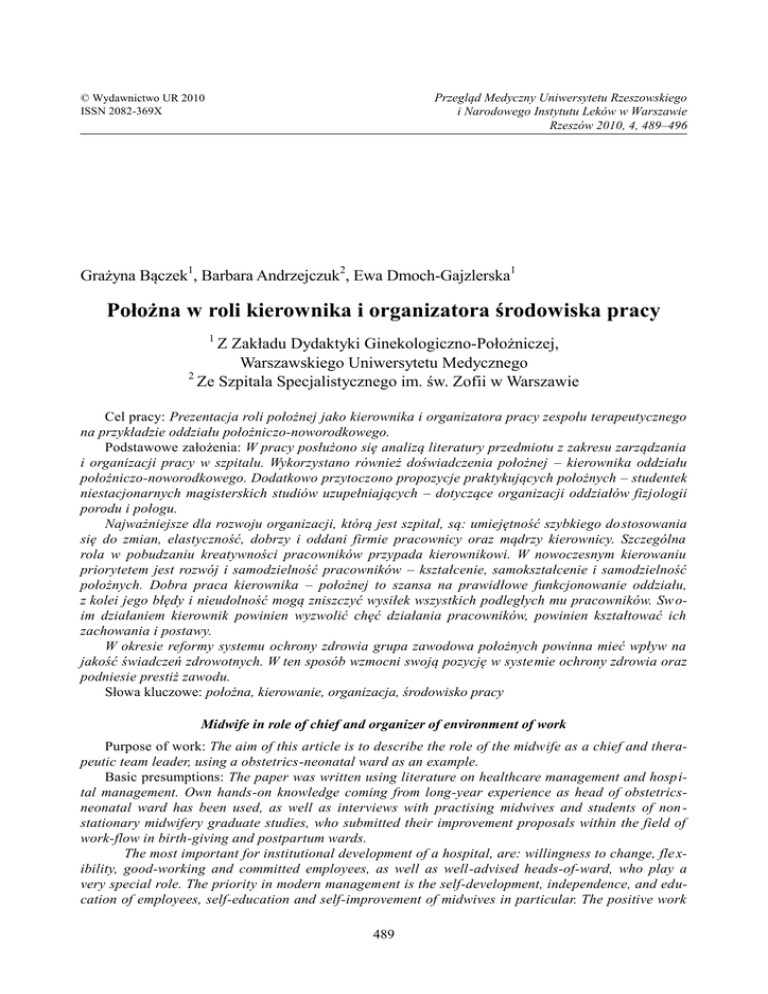 Przegląd Medyczny Uniwersytetu Rzeszowskiego i Narodowego Instytutu Leków w Warszawie Rzeszów 2010, 4, 489–496 © Wydawnictwo UR 2010 ISSN 2082-369X Grażyna Bączek1, Barbara Andrzejczuk2, Ewa Dmoch-Gajzlerska1 Położna w roli kierownika i organizatora środowiska pracy 1 Z Zakładu Dydaktyki Ginekologiczno-Położniczej, Warszawskiego Uniwersytetu Medycznego 2 Ze Szpitala Specjalistycznego im. św. Zofii w Warszawie Cel pracy: Prezentacja roli położnej jako kierownika i organizatora pracy zespołu terapeutycznego na przykładzie oddziału położniczo-noworodkowego. Podstawowe założenia: W pracy posłużono się analizą literatury przedmiotu z zakresu zarządzania i organizacji pracy w szpitalu. Wykorzystano również doświadczenia położnej – kierownika oddziału położniczo-noworodkowego. Dodatkowo przytoczono propozycje praktykujących położnych – studentek niestacjonarnych magisterskich studiów uzupełniających – dotyczące organizacji oddziałów fizjologii porodu i połogu. Najważniejsze dla rozwoju organizacji, którą jest szpital, są: umiejętność szybkiego do stosowania się do zmian, elastyczność, dobrzy i oddani firmie pracownicy oraz mądrzy kierownicy. Szczególna rola w pobudzaniu kreatywności pracowników przypada kierownikowi. W nowoczesnym kierowaniu priorytetem jest rozwój i samodzielność pracowników – kształcenie, samokształcenie i samodzielność położnych. Dobra praca kierownika – położnej to szansa na prawidłowe funkcjonowanie oddziału, z kolei jego błędy i nieudolność mogą zniszczyć wysiłek wszystkich podległych mu pracowników. Sw oim działaniem kierownik powinien wyzwolić chęć działania pracowników, powinien kształtować ich zachowania i postawy. W okresie reformy systemu ochrony zdrowia grupa zawodowa położnych powinna mieć wpływ na jakość świadczeń zdrowotnych. W ten sposób wzmocni swoją pozycję w systemie ochrony zdrowia oraz podniesie prestiż zawodu. Słowa kluczowe: położna, kierowanie, organizacja, środowisko pracy Midwife in role of chief and organizer of environment of work Purpose of work: The aim of this article is to describe the role of the midwife as a chief and therapeutic team leader, using a obstetrics-neonatal ward as an example. Basic presumptions: The paper was written using literature on healthcare management and hospital management. Own hands-on knowledge coming from long-year experience as head of obstetricsneonatal ward has been used, as well as interviews with practising midwives and students of non stationary midwifery graduate studies, who submitted their improvement proposals within the field of work-flow in birth-giving and postpartum wards. The most important for institutional development of a hospital, are: willingness to change, fle xibility, good-working and committed employees, as well as well-advised heads-of-ward, who play a very special role. The priority in modern management is the self-development, independence, and education of employees, self-education and self-improvement of midwives in particular. The positive work 489 of the chief-midwife is indispensable for a well-functioning ward, on the other hand her mistakes can ruin the effort of all subordinate employees. By her actions, the chief should promote an active stance within the staff, as well as shape their attitudes and behaviour. During the era of health-care reforms, midwives as a professional group should have an influence on the quality of care provision. It is a chance to increase their status within the health -care system, as well as the prestige of the profession itself. Key words: midwife, directed, organization, environment of work KIEROWANIE W PRAKTYCE POŁOŻNEJ odcinkowymi, z pacjentkami i ich rodzinami, z kierownikami innych komórek organizacyjnych i z naczelnym kierownictwem szpitala. Poprzez realizację funkcji kierowniczych, tj. planowania, organizowania, przewodzenia i kontrolowania zespołu położnych wpływa na osiąganie podstawowych celów pielęgnowania. Jednocześnie położna kierownik powinna być specjalistką w dziedzinie położnictwa i pielęgniarstwa położniczego. W tym sensie, będąc kierownikiem, jest także pracownikiem wykonawczym [5]. Planowanie polega na obmyślaniu celów i środków niezbędnych do ich realizacji. W ramach funkcji planowania kierownik oddziału wykonuje następujące czynności: planuje opiekę pielęgniarską, obsadę dla kompleksowej, całodobowej opieki położniczej na oddziale, comiesięczny harmonogram pracy podległego personelu (planowanie grafików), doskonalenie zawodowe podległego personelu – kieruje pracowników na szkolenia, kursy dokształcające i kwalifikacyjne, wprowadzanie nowych metod pielęgnowania i usprawniania jakości opieki, zapotrzebowanie na leki, materiały medyczne i aparaturę niezbędne do sprawowania opieki w oddziale, bierze udział w planowaniu remontów i wprowadzaniu zmian poprawiających higienę, bezpieczeństwo, komfort hospitalizacji oraz pracy w kierowanym przez siebie oddziale, planuje pracę własną i podległego personelu, bierze udział w planowaniu zadań zakładu, w określaniu celów strategicznych poprzez udział w odbywających się co 3 lata sesjach strategicznych. Organizowanie to określenie obowiązków, uprawnień i odpowiedzialności podwładnych, tworzenie struktury i zapewnienie warunków do jej funkcjonowania. Organizowanie oznacza, że kierownik koordynuje zasoby ludzkie i materialne organizacji [3]. W ramach funkcji organizowania położna kierownik wykonuje następujące czynności: – organizuje stanowiska pracy z uwzględnieniem obowiązujących przepisów bhp i higieny pracy, określa zakresy obowiązków, uprawnień i odpowiedzialności w zespole położnych stosownie do kompetencji zatrudnionych, Położne odpowiedzialne za organizację pracy w oddziale szpitalnym czy środowisku muszą sięgnąć do dorobku koleżanek pielęgniarek – zarówno w sferze teo