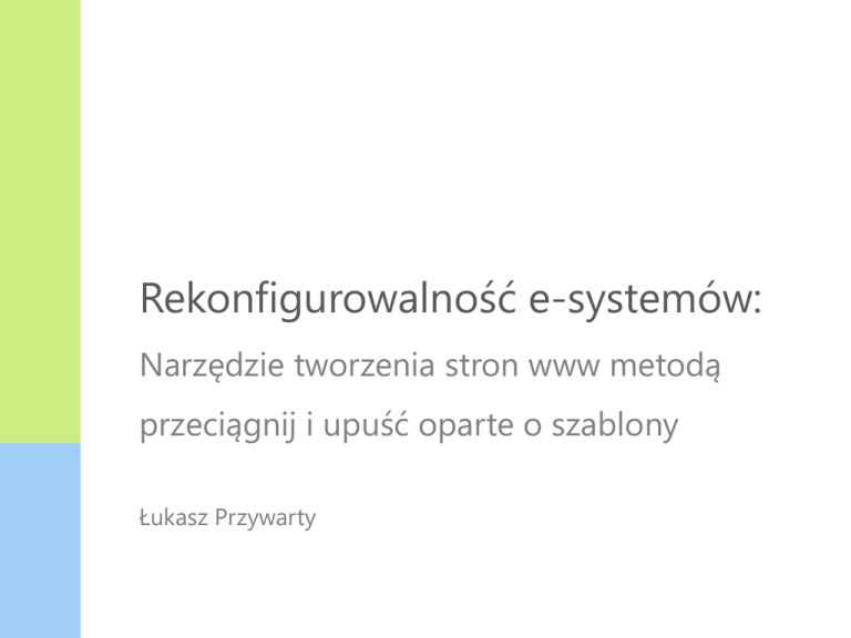 Rekonfigurowalność e-systemów: Narzędzie tworzenia stron www metodą przeciągnij i upuść oparte o szablony Łukasz Przywarty Model warstwowy TCP/IP Optymalizacja aplikacji - założenia Wykorzystywane technologie • PHP (Zend Framework), MySQL, JavaScript, HTML, CSS Pomiary obciążenia, wydajności • Apache – zapytania: ab/siege, JMeter • PHP – pamięd/CPU: memory_get_usage(), memory_get_peak_usage(), XDebug • HTML/CSS/JavaScript – Yslow, Firebug Rekonfigurowalność e-systemów – Slajd 2 Optymalizacja aplikacji Optymalizacja aplikacji • PHP – Opcode cache: APC/Xcache, Zend Optimizer • MySQL - Zend Cache, indeksy, unikanie złączeo, odpowiednie typy kolumn • HTML/CSS – CSS Sprites, kompresja styli, obrazków • JavaScript – kompresja, łączenie skryptów, usuwanie duplikatów Rekonfigurowalność e-systemów – Slajd 3