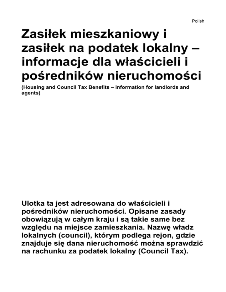 Polish Zasiłek mieszkaniowy i zasiłek na podatek lokalny – informacje dla właścicieli i pośredników nieruchomości (Housing and Council Tax Benefits – information for landlords and agents) Ulotka ta jest adresowana do właścicieli i pośredników nieruchomości. Opisane zasady obowiązują w całym kraju i są takie same bez względu na miejsce zamieszkania. Nazwę władz lokalnych (council), którym podlega rejon, gdzie znajduje się dana nieruchomość można sprawdzić na rachunku za podatek lokalny (Council Tax). Co to jest zasiłek mieszkaniowy (Housing Benefit)? Wiele osób miewa problemy z płaceniem czynszu. Ale osoby o niskich dochodach mogą otrzymać pomoc w formie zasiłku mieszkaniowego. Housing Benefit to zasiłek zapewniany przez państwo, przyznawany i wypłacany przez władze lokalne (council). Kto może się ubiegać o zasiłek mieszkaniowy? O zasiłek mieszkaniowy może się ubiegać każdy, kto ma niskie dochody i płaci czynsz za mieszkanie, w którym zwykle mieszka. Obejmuje to również lokatorów, którzy w ramach umowy najmu otrzymują posiłki. Wniosek może złożyć tylko najemca/lokator. Właściciel lokalu nie może składać wniosków w imieniu swoich lokatorów. Aby otrzymać zasiłek mieszkaniowy najemca musi: • • • mieć obowiązek płacenia czynszu, mieszkać w danym lokalu jako w swoim głównym domu, oraz złożyć wniosek o zasiłek. Właściciel mieszkania i najemca nie powinni zakładać, że zasiłek zostanie przyznany – powinni poczekać, aż władze lokalne powiadomią ich o tym listownie. Kto nie może się ubiegać o zasiłek mieszkaniowy? Najemca nie otrzyma zwykle zasiłku mieszkaniowego, jeśli: • • • • • • • • mieszka u bliskiego krewnego i płaci mu czynsz, mieszkał wcześniej z właścicielem mieszkania jako członek rodziny, wynajmuje od byłej partnerki/byłego partnera mieszkanie, które wcześniej było wspólne, jest odpowiedzialny za dziecko właściciela mieszkania, był wcześniej właścicielem nieruchomości, którą teraz wynajmuje, mieszka w danym mieszkaniu w ramach wykonywanej pracy, mieszka w domu opieki, jest osobą uczącą się w pełnym wymiarze czasu. Jeśli najemca nie jest pewny, czy może otrzymać zasiłek, powinien złożyć wniosek lub zwrócić się o dokładniejszą poradę do władz lokalnych. Co to jest podatek lokalny (Council Tax)? Podatek lokalny to sposób płacenia za usługi świadczone przez władze lokalne. Kto musi płacić podatek lokalny? Za płacenie podatku lokalnego odpowiedzialna jest zwykle osoba, która jest właścicielem zajmowanej nieruchomości lub mieszkający w danym lokalu najemca w wieku lat 18 lub więcej. Co to jest zasiłek na podatek lokalny (Council Tax Benefit)? Osoby o niskich dochodach mogą otrzymać pomoc również w opłatach podatku lokalnego. Jest to zasiłek na podatek lokalny. Kto może się ubiegać o zasiłek na podatek lokalny? O zasiłek na podatek lokalny może się ubiegać każdy, kto jest właścicielem zajmowanej nieruchomości lub najemcą w wieku 18 lat lub więcej i ma obowiązek płacenia podatku lokalnego. Kto nie może się ubiegać o zasiłek na podatek lokalny? W niektórych przypadkach właściciele nieruchomości nie mieszkający w tych nieruchomościach muszą płacić podatek lokalny. Nie mogą się oni ubiegać o Council Tax Benefit. Najczęściej spotykanym przykładem jest tu lokal zajmowany przez więcej niż jednego lokatora. Lokal zajmowany przez więcej niż jednego lokatora to lokal gdzie: • • lokatorzy wynajmują pokoje i wspólnie korzystają ze sprzętów/pomieszczeń, np. łazienki i/lub kuchni oraz każdy lokator ma oddzielną umowę najmu, wystawioną tylko na swoje nazwisko. W przypadku takich nieruchomości obowiązek płacenia podatku lokalnego spoczywa na właścicielu. Jednak może on pobierać od lokatorów opłaty z tytułu podatku lokalnego w ramach czynszu. Dokładniejsze informacje lub porady można uzyskać kontaktując się z władzami lokalnymi. W jaki sposób najemcy mogą się ubiegać o zasiłek mieszkaniowy i zasiłek na podatek lokalny? Osoby ubiegające się o zasiłek dla osób o niskich dochodach (Income Support) lub zasiłek dla osób poszukujących pracy zależny od dochodów (income-based Jobseeker’s Allowance) otrzymują formularz wniosku o zasiłek mieszkaniowy i zasiłek na podatek lokalny (HCTB1) przy składaniu podania. Formularz ten należy wysłać bezpośrednio do wydziału ds. zasiłków przy władzach lokalnych. Jobcentre Plus powiadomi władze, jeśli dana osoba otrzyma zasiłek Income Support lub Jobseeker’s Allowance (zależny od dochodów). W niektórych rejonach Jobcentre Plus wprowadza nowy system, w ramach którego wniosek o Housing Benefit i Council Tax Benefit składa się na tym samym formularzu, co wniosek o Income Support, Jobseeker’s Allowance i Incapacity Benefit (zasiłek chorobowy). W tych przypadkach Jobcentre Plus przekazuje władzom lokalnym stosowne informacje potrzebne do ustalenia uprawnień do zasiłku mieszkaniowego i zasiłku na podatek lokalny. Jeśli najemca składa wniosek o dodatek emerytalny (Pension Credit), zostanie zapytany, czy chce się ubiegać również o zasiłek mieszkaniowy i zasiłek na podatek lokalny na formularzu wniosku o dodatek emerytalny. Jeśli najemca zgłasza wniosek o zasiłek telefonicznie, doradca zapyta, czy chce się również ubiegać o zasiłek mieszkaniowy i/lub zasiłek na podatek lokalny. Wydział ds. emerytur prześle mu wtedy formularz HCTB1(PC). Najemca musi wysłać wypełniony formularz do biura władz lokalnych. Adres można znaleźć na rachunku za Council Tax lub w książce telefonicznej. Jeśli najemca wyśle formularz z powrotem do Jobcentre Plus lub wydziału ds. emerytur, ich pracownicy przekażą formularz władzom lokalnym. Aby otrzymać zasiłek mieszkaniowy i/lub zasiłek na podatek lokalny, najemca nie musi otrzymywać zasiłków Income Support, Jobseeker’s Allowance (zależne