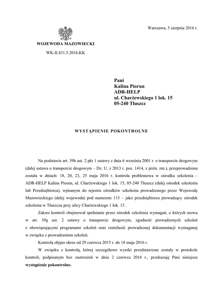 Wystąpienie pokontrolne ADR-HELP z dnia 5 sierpnia 2016 r.