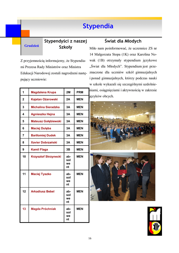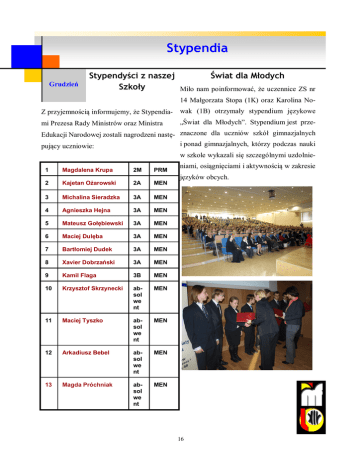 Stypendia Grudzień Stypendyści z naszej Świat dla Młodych Szkoły Miło nam poinformować, że uczennice ZS nr 14 Małgorzata Stopa (1K) oraz Karolina No- Z przyjemnością informujemy, że Stypendia- wak (1B) otrzymały stypendium językowe mi Prezesa Rady Ministrów oraz Ministra „Świat dla Młodych”. Stypendium jest prze- Edukacji Narodowej zostali nagrodzeni nastę- znaczone dla uczniów szkół gimnazjalnych i ponad gimnazjalnych, którzy podczas nauki pujący uczniowie: w szkole wykazali się szczególnymi uzdolnie1 Magdalena Krupa 2M PRM 2 Kajetan Ożarowski 2A MEN 3 Michalina Sieradzka 3A MEN 4 Agnieszka Hejna 3A MEN 5 Mateusz Gołębiewski 3A MEN 6 Maciej Dulęba 3A MEN 7 Bartłomiej Dudek 3A MEN 8 Xavier Dobrzański 3A MEN 9 Kamil Flaga 3B MEN 10 Krzysztof Skrzynecki absol we nt MEN 11 Maciej Tyszko absol we nt MEN 12 Arkadiusz Bebel absol we nt MEN 13 Magda Próchniak absol we nt MEN niami, osiągnięciami i aktywnością w zakresie języków obcych. 16