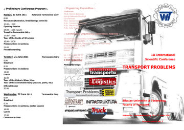 Katowice-Tarnowskie Góry 14.00 - 15.00 (lunch) Travel to Tarnowskie Góry PO LI O AŁ T RANSP .: Conference Organizing Committee Address :. 17.00 - 18.00 Tour of the Castle of Wrochem III International Scientific Conference TRANSPORT PROBLEMS Faculty of Transport, Silesian University of Technology ul. Krasińskiego 8, s.108 40-019 Katowice Poland 18.00 - 20.30 Presentations in sections 21.00 Friendly meeting Tuesday, 21 June 2011 DZ I Y 10.00 - 13.00 Opening Session Chairman: Ph.D. Henryk Bakowski [email protected] Co-chairman: Ph.D. Damian Gaska M.Sc. Tomasz Haniszewski M.Sc. Marcin Bugdol M.Sc. Artur Ryguła W 8.00 Reception (Katowice, Krasińskiego street 8) HNIKA ŚL Tarnowskie Góry 8.00 Breakfast tel. +48 32 603 42 92 fax. +48 32 603 42 92 e-mail: [email protected] Media Patronage: 8.30 Presentations in sections III International Scientific Conference TRANSPORT PROBLEMS . 14.00 Lunch 15.00 Tour of the Historic Silver Mine Tour of the Tarnowskie Góry (palaces, parks, etc) Official Dinner 20.00 Wednesday, 22 June 2011 Tarnowskie Góry 8.00 Breakfast Silesian University of Technology 8.30 Presentations in sections, poster session Faculty of Transport 14.00 Lunch 15.00 Conference close RT U Monday, 20 June 2011 C TE .: Organizing Committee :. KA ĄS .: Preliminary Conference Program :. Katowice – Tarnowskie Góry, 20 – 22 June 2011 Announcement No. 1 .: International Science Committee :. .: Conference topics :. .: Important dates :. Chairman: Prof. Aleksander Sładkowski Registration and submission of summarizes (Poland) 2 April 2011 Conference topics include the following areas: Co-chairman: Prof. Bogusław Łazarz Prof. Henryk Madej Prof. Krystian Wilk Prof. Anvar Adylhodzaev Prof. Rasim Alguliyev Prof. Gerd-Axel Arens Prof. Peteris Balckars Prof. śilwinas Bazaras Prof. Klaus Becker Prof. Roman Bogacz Prof. Tatiana Čorejová Prof. Irina Englezi Prof. Radim Farana Prof. Aleksander Golubenko Prof. Ajay Kapoor Dr Stanisław Krawiec Prof. Leonas Povilas Lingaitis Prof. Mirosław Luft Prof. Gabriele Malavasi Dr Marija Malenkovska Todorova Dr Marin Marinov Prof. Jerzy Mikulski Prof. Leszek Mindur Prof. Andrzej Mitas Prof. Liudvikas Narkaitis Dr Alfonso Orro Prof. Stanislav Pavlin Prof. Paweł Piec Prof. Dmitrij Pogorelov Dr Mihaela Popa Prof. Valery Sapoznikov Prof. Hayrettin Kemal Sezen Prof. Abilio Manuel Pereira da Silva Prof. Janusz Szpytko Dr Nelly Stoytcheva Prof. George Tumanishvili Prof. Robert Tomanek Prof. Antal Veha Prof. Wojciech Wawrzyński Prof. Tomasz Węgrzyn Notification of paper reception (Poland) (Poland) (Poland) (Uzbekistan) (Azerbaijan) (Germany) (Latvia) (Lithuania) (Germany) (Poland) (Slovakia) (Ukraine) (Czech Republic) (Ukraina) (Australia) (Poland) (Lithuania) (Poland) (Italy) (Macedonia) (United Kingdom) (Poland) (Poland) (Poland) (Lithuania) (Spain) (Croatia) (Poland) (Russia) (Romania) (Russia) (Turkey) (Portugalia) (Poland) (Bulgaria) (Georgia) (Poland) (Hungary) (Poland) (Poland) 15 May 2011 - road transport, rail transport, air transport, sea Full paper submission 15 May 2011 transport and inland, - municipal and bicycle transport, Payment of the conference fee 31 May 2011 - industrial transport, All papers will be published in the conference materials; the - load preparation, organization and co-ordination selected ones after positive revision will be published in the International Scientific Journal „Transport Problems” cargo handling, (ISSN 1896 – 0596) or in another journal which patronizes - co-ordination methods and transport logistics the conference. Information for authors is located on the center, integrated transport systems, website: http://www.transportproblems.polsl.pl/en/Info/ - intermodal, multimodal and compound transport, .: Conference fee :. - computer systems aided design of transport facilities, Participation in the conference: 400 € (1600 zł) - means of transport production, Payment for an accompanying person 350 € (1400 zł) - technical diagnostic means of transport, - active and passive vehicles safety, (Students of master’s and PhD studies can receive a discount of 50 € = 200 zł) - transport systems safety, - traffic forecasting and region requirements, Payment includes: full board, accommodation at a hotel, statistical research, integration evening, drinks, publication costs, participation in the conference, conference materials, coach travel, - influence of the law regulations on the road organisation costs. traffic safety, Conference Registration will be made according to - transport management in urban area, the instructions available on the website: - modelling and simulation transport systems, www.konferencje.polsl.pl/tp road traffic controllers, Please transfer money to the account at Bank Śląski S.A. O / - automation in transport, Katowice IBAN PL 30 1050 1214 1000 0007 0000 8022, - ecological problems in transport, SWIFT: INGB PL PW with postscript „Conference TP’11 – - education and instruction in transport. name and surname of participant” During the conference and in the conference materials the possibility of company products and activity presentations is provided. Interested persons are asked to contact with the organizing committee.