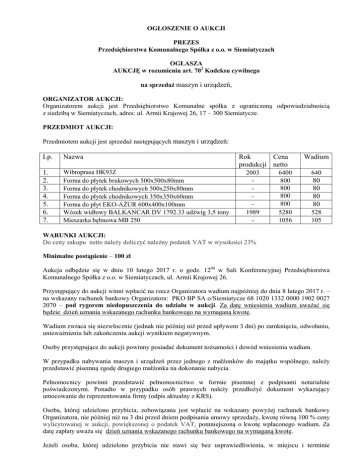 OGŁOSZENIE O AUKCJI PREZES Przedsiębiorstwa Komunalnego Spółka z o.o. w Siemiatyczach OGŁASZA AUKCJĘ w rozumieniu art. 702 Kodeksu cywilnego na sprzedaż maszyn i urządzeń, ORGANIZATOR AUKCJI: Organizatorem aukcji jest Przedsiębiorstwo Komunalne spółka z ograniczoną odpowiedzialnością z siedzibą w Siemiatyczach, adres: ul. Armii Krajowej 26, 17 – 300 Siemiatycze. PRZEDMIOT AUKCJI: Przedmiotem aukcji jest sprzedaż następujących maszyn i urządzeń: Lp. Nazwa 1. 2. 3. 4. 5. 6. 7. Wibroprasa HK93Z Forma do płytek brukowych 500x500x80mm Forma do płytek chodnikowych 500x250x80mm Forma do płytek chodnikowych 350x350x60mm Forma do płyt EKO-AŻUR 600x400x100mm Wózek widłowy BALKANCAR DV 1792.33 udźwig 3,5 tony Mieszarka bębnowa MB 250 Rok Cena produkcji netto 2003 1989 - 6400 800 800 800 800 5280 1056 Wadium 640 80 80 80 80 528 105 WARUNKI AUKCJI: Do ceny zakupu netto należy doliczyć należny podatek VAT w wysokości 23% Minimalne postąpienie – 100 zł Aukcja odbędzie się w dniu 10 lutego 2017 r. o godz. 1200 w Sali Konferencyjnej Przedsiębiorstwa Komunalnego Spółka z o.o. w Siemiatyczach, ul. Armii Krajowej 26. Przystępujący do aukcji winni wpłacić na rzecz Organizatora wadium najpóźniej do dnia 8 lutego 2017 r. – na wskazany rachunek bankowy Organizatora: PKO BP SA o/Siemiatycze 68 1020 1332 0000 1902 0027 2070 – pod rygorem niedopuszczenia do udziału w aukcji. Za datę wniesienia wadium uważać się będzie dzień uznania wskazanego rachunku bankowego na wymaganą kwotę. Wadium zwraca się niezwłocznie (jednak nie później niż przed upływem 3 dni) po zamknięciu, odwołaniu, unieważnieniu lub zakończeniu aukcji wynikiem negatywnym. Osoby przystępujące do aukcji powinny posiadać dokument tożsamości i dowód wniesienia wadium. W przypadku nabywania maszyn i urządzeń przez jednego z małżonków do majątku wspólnego, należy przedstawić pisemną zgodę drugiego małżonka na dokonanie nabycia. Pełnomocnicy powinni przedstawić pełnomocnictwo w formie pisemnej z podpisami notarialnie poświadczonymi. Ponadto w przypadku osób prawnych należy przedłożyć dokument wykazujący umocowanie do reprezentowania firmy (odpis aktualny z KRS). Osoba, której udzielono przybicia, zobowiązana jest wpłacić na wskazany powyżej rachunek bankowy Organizatora, nie później niż na 3 dni przed dniem podpisania umowy sprzedaży, kwotę równą 100 % ceny wylicytowanej w aukcji, powiększonej o podatek VAT, pomniejszoną o kwotę wpłaconego wadium. Za datę zapłaty uważa się dzień uznania wskazanego rachunku bankowego na wymaganą kwotę. Jeżeli osoba, której udzielono przybicia nie stawi się bez usprawiedliwienia, w miejscu i terminie wskazanym przez Organizatora w zawiadomieniu w celu podpisania umowy, Organizator może odstąpić od zawarcia umowy i zatrzymać wpłacone wadium. Koszty związane z zawarciem umowy sprzedaży ponosi nabywca. Maszyny i urządzenia można oglądać w dni robocze w godzinach 700 - 1500 w Zakładzie Produkcyjno Handlowym Przedsiębiorstwa Komunalnego Spółka z o.o. w Siemiatyczach przy ul. Armii Krajowej 26 w Siemiatyczach. Bliższych informacji można zasięgnąć także telefonicznie, pod numerem 085 655 21 53. Zastrzega się prawo unieważnienia aukcji. Zastrzega się prawo zmiany ogłoszenia lub warunków aukcji przed wyznaczonym w ogłoszeniu terminem aukcji. W sprawach nieuregulowanych stosuje się przepisy art. 701-705 Kodeksu cywilnego. Niniejsze ogłoszenie stanowi zaproszenie osób zainteresowanych do wzięcia udziału w aukcji.