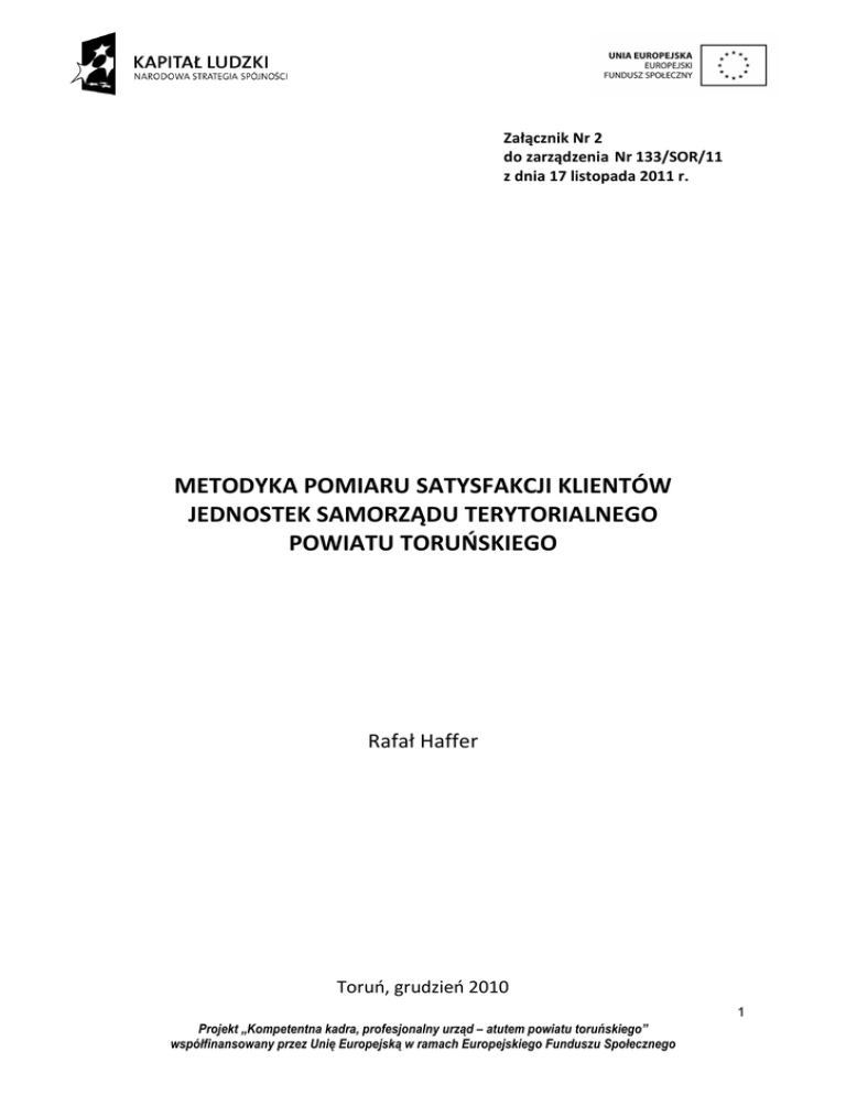 Załącznik Nr 2 do zarządzenia Nr 133/SOR/11 z dnia 17 listopada 2011 r. METODYKA POMIARU SATYSFAKCJI KLIENTÓW JEDNOSTEK SAMORZĄDU TERYTORIALNEGO POWIATU TORUŃSKIEGO Rafał Haffer Toruń, grudzień 2010 1 Projekt „Kompetentna kadra, profesjonalny urząd – atutem powiatu toruńskiego” współfinansowany przez Unię Europejską w ramach Europejskiego Funduszu Społecznego Spis treści 1. Wprowadzenie ………..……………………………………………………………………………………............. 3 2. Pojęcie i istota satysfakcji klienta …………………………………………………………………………….. 5 3. Metody pomiaru satysfakcji klientów ………………………………………………………………..…….. 11 3.1. Model Servqual ……………………………………………………………….……………..………………... 16 3.2. Model Europejskiego Indeksu Satysfakcji Klientów …………………………………………… 19 3.3. Model Pomiaru Satysfakcji Klientów Urzędu …….…………………………………………….... 22 Literatura ……………………………………………………………………………………………………………………… 27 Załączniki …………………………………………………………………………………………………………..…………. 29 Załącznik 1. Kwestionariusz wywiadu przeprowadzonego w Jednostkach Samorządu Terytorialnego powiatu toruńskiego ………………………………………………………………………… 30 Załącznik 2. Cztery pierwsze wersje instrumentu do pomiaru satysfakcji klientów Urzędu ……………………………………………………………………………………………………………………… 35 Załącznik 3. Baner internetowy połączony z kwestionariuszem internetowym do pomiaru satysfakcji klientów Jednostek Samorządu Terytorialnego powiatu toruńskiego ……………………………………………………………………………………………………………… 43 Załącznik 4. Plakat informujący o badaniu satysfakcji klientów w Jednostkach Samorządu Terytorialnego powiatu toruńskiego ………..……………………………………………. 44 Załącznik 5. Notatka na strony internetowe JST informująca o pomiarze satysfakcji klientów w Jednostkach Samorządu Terytorialnego powiatu toruńskiego ……………….. 45 2 Projekt „Kompetentna kadra, profesjonalny urząd – atutem powiatu toruńskiego” współfinansowany przez Unię Europejską w ramach Europejskiego Funduszu Społecznego 1. Wprowadzenie Metodyka pomiaru satysfakcji klientów jest jednym z komponentów systemu pomiaru i monitorowania satysfakcji klientów z jakości usług publicznych świadczonych przez 10 Jednostek Samorządu Terytorialnego powiatu toruńskiego. System ten został zaprojektowany w ramach projektu „Kompetentna kadra, profesjonalny urząd – atutem powiatu toruńskiego”. Pozostałe komponenty systemu to instrument pomiarowy oraz narzędzie generujące zbiorcze wyniki pomiaru satysfakcji klientów. Stanowią one odrębne dokumenty. Metodykę pomiaru satysfakcji klientów scharakteryzowano natomiast w kolejnych punktach niniejszego opracowania. Metodyka badania satysfakcji klientów została oparta na Modelu Pomiaru Satysfakcji Klientów Urzędu. Analityczny Model Pomiaru Satysfakcji Klientów Urzędu (Model PSKU) powstał w oparciu o dogłębne studia literaturowe, wyniki wywiadów w Urzędach, analizę materiałów pozyskanych z Urzędów oraz wytyczne Kodeksu Etyki Pracowników Urzędu. Przeprowadzone studia literaturowe pozwoliły na wyłonienie dwóch modeli, wykorzystywanych w badaniach satysfakcji klientów oraz pomiarze jakości usług, które potraktowano jako podstawę koncepcyjną analitycznego Modelu Pomiaru Satysfakcji Klientów Urzędu. Są to Model Servqual, stosowany do oceny jakości usług oraz Model Europejskiego Indeksu Satysfakcji Klientów (European Customer Satisfaction Index), wykorzystywany w pomiarach satysfakcji klientów dowolnego typu organizacji. W związku z powyższym omówienie metodyki badawczej opartej o Model Pomiaru Satysfakcji Klientów Urzędu (punkt 3.3) zostanie poprzedzone wyłożeniem podstaw teoretycznych dotyczących zjawiska satysfakcji klientów (punkt 2) oraz metod jego pomiaru (punkt 3), w tym Modelu Servqual (punkt 3.1) oraz Modelu Europejskiego Indeksu Satysfakcji Klientów (punkt 3.2). Pomiar satysfakcji klientów Urzędu, zgodnie z Modelem PSKU, odbywa się w oparciu o badanie ankietowe, w którym instrumentem pomiarowym jest kwestionariusz ankiety. Do jego skonstruowania niezbędne było opracowanie listy wyznaczników wartości oferty Urzędu, mających znaczenie dla klienta, umożliwiającej pomiar jakości świadczonych przez Urząd usług. W celu jej utworzenia wykorzystano wytyczne Modelu Servqual, który poddano jednak pewnym modyfikacjom w związku z potrzebą uchwycenia specyfiki funkcjonowania Jednostek Samorządu Terytorialnego (JST). Informacje dotyczące zakresu działalności, oferty i specyfiki funkcjonowania JST gromadzono posiłkując się zarówno źródłami wtórnymi, jak i pierwotnymi. Analizie poddano więc materiały uzyskane bezpośrednio z Urzędów, takie jak: schemat organizacyjny, regulamin organizacyjny, procedura postępowania z dokumentami oraz lista wniosków (druków) dla klientów udostępnianych na stronie internetowej JST. Dane pierwotne pochodziły z wywiadów przeprowadzonych w 10 JST w dniach 25.08-3.09.2010 r. z wykorzystaniem kwestionariusza wywiadu stanowiącego załącznik 1 niniejszego opracowania. Podstawowe cele, jakie postawiono na etapie zapoznawania się z zakresem działalności, ofertą i specyfiką funkcjonowania JST przyjęły następującą postać: 1) rozpoznanie struktury organizacyjnej, zakre