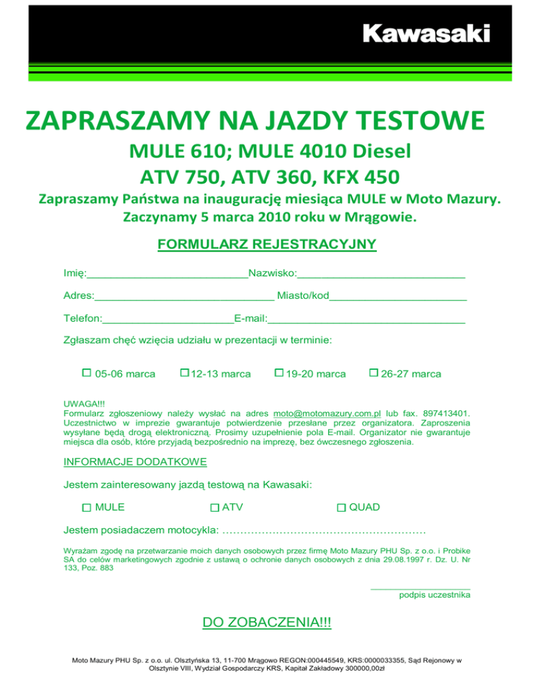ZAPRASZAMY NA JAZDY TESTOWE MULE 610; MULE 4010 Diesel ATV 750, ATV 360, KFX 450 Zapraszamy Państwa na inaugurację miesiąca MULE w Moto Mazury. Zaczynamy 5 marca 2010 roku w Mrągowie. FORMULARZ REJESTRACYJNY Imię:___________________________Nazwisko:____________________________ Adres:______________________________ Miasto/kod_______________________ Telefon:______________________E-mail:_________________________________ Zgłaszam chęć wzięcia udziału w prezentacji w terminie: 05-06 marca 12-13 marca 19-20 marca 26-27 marca UWAGA!!! Formularz zgłoszeniowy należy wysłać na adres [email protected] lub fax. 897413401. Uczestnictwo w imprezie gwarantuje potwierdzenie przesłane przez organizatora. Zaproszenia wysyłane będą drogą elektroniczną. Prosimy uzupełnienie pola E-mail. Organizator nie gwarantuje miejsca dla osób, które przyjadą bezpośrednio na imprezę, bez ówczesnego zgłoszenia. INFORMACJE DODATKOWE Jestem zainteresowany jazdą testową na Kawasaki: MULE ATV QUAD Jestem posiadaczem motocykla: ………………………………………………… Wyrażam zgodę na przetwarzanie moich danych osobowych przez firmę Moto Mazury PHU Sp. z o.o. i Probike SA do celów marketingowych zgodnie z ustawą o ochronie danych osobowych z dnia 29.08.1997 r. Dz. U. Nr 133, Poz. 883 ____________________ podpis uczestnika DO ZOBACZENIA!!! Moto Mazury PHU Sp. z o.o. ul. Olsztyńska 13, 11-700 Mrągowo REGON:000445549, KRS:0000033355, Sąd Rejonowy w Olsztynie VIII, Wydział Gospodarczy KRS, Kapitał Zakładowy 300000,00zł