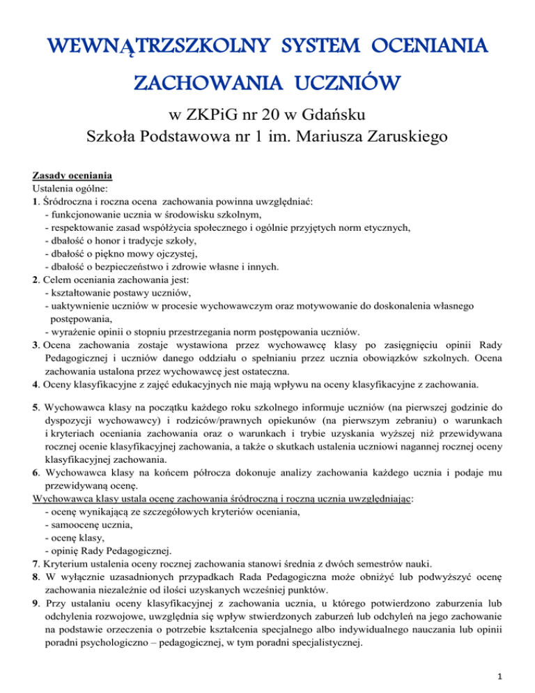 WEWNĄTRZSZKOLNY SYSTEM OCENIANIA ZACHOWANIA UCZNIÓW w ZKPiG nr 20 w Gdańsku Szkoła Podstawowa nr 1 im. Mariusza Zaruskiego Zasady oceniania Ustalenia ogólne: 1. Śródroczna i roczna ocena zachowania powinna uwzględniać: - funkcjonowanie ucznia w środowisku szkolnym, - respektowanie zasad współżycia społecznego i ogólnie przyjętych norm etycznych, - dbałość o honor i tradycje szkoły, - dbałość o piękno mowy ojczystej, - dbałość o bezpieczeństwo i zdrowie własne i innych. 2. Celem oceniania zachowania jest: - kształtowanie postawy uczniów, - uaktywnienie uczniów w procesie wychowawczym oraz motywowanie do doskonalenia własnego postępowania, - wyrażenie opinii o stopniu przestrzegania norm postępowania uczniów. 3. Ocena zachowania zostaje wystawiona przez wychowawcę klasy po zasięgnięciu opinii Rady Pedagogicznej i uczniów danego oddziału o spełnianiu przez ucznia obowiązków szkolnych. Ocena zachowania ustalona przez wychowawcę jest ostateczna. 4. Oceny klasyfikacyjne z zajęć edukacyjnych nie mają wpływu na oceny klasyfikacyjne z zachowania. 5. Wychowawca klasy na początku każdego roku szkolnego informuje uczniów (na pierwszej godzinie do dyspozycji wychowawcy) i rodziców/prawnych opiekunów (na pierwszym zebraniu) o warunkach i kryteriach oceniania zachowania oraz o warunkach i trybie uzyskania wyższej niż przewidywana rocznej ocenie klasyfikacyjnej zachowania, a także o skutkach ustalenia uczniowi nagannej rocznej oceny klasyfikacyjnej zachowania. 6. Wychowawca klasy na końcem półrocza dokonuje analizy zachowania każdego ucznia i podaje mu przewidywaną ocenę. Wychowawca klasy ustala ocenę zachowania śródroczną i roczną ucznia uwzględniając: - ocenę wynikającą ze szczegółowych kryteriów oceniania, - samoocenę ucznia, - ocenę klasy, - opinię Rady Pedagogicznej. 7. Kryterium ustalenia oceny rocznej zachowania stanowi średnia z dwóch semestrów nauki. 8. W wyłącznie uzasadnionych przypadkach Rada Pedagogiczna może obniżyć lub podwyższyć ocenę zachowania niezależnie od ilości uzyskanych wcześniej punktów. 9. Przy ustalaniu oceny klasyfikacyjnej z zachowania ucznia, u którego potwierdzono zaburzenia lub odchylenia rozwojowe, uwzględnia się wpływ stwierdzonych zaburzeń lub odchyleń na jego zachowanie na podstawie orzeczenia o potrzebie kształcenia specjalnego albo indywidualnego nauczania lub opinii poradni psychologiczno – pedagogicznej, w tym poradni specjalistycznej. 1 10. Uczeń lub jego rodzice (opiekunowie prawni) mogą zgłosić zastrzeżenia do dyrektora szkoły, jeżeli uznają, że półroczna/roczna ocena klasyfikacyjna z zachowania została ustalona niezgodnie z przepisami dotyczącymi trybu ustalenia tej oceny. 11. Kryteria oceniania zachowania mogą ulec modyfikacji w trakcie roku szkolnego. 12. Zachowanie ucznia oceniane jest w siedmiu kategoriach, które oznaczone zostały cyframi rzymskimi. Postanowienia końcowe pozwalają na uzyskanie dodatkowych punktów. 13. Wychowawca spośród poszczególnych opisów w każdej kategorii, po konsultacji z nauczycielami, innymi pracownikami szkoły oraz uczniami, wybiera to zdanie , które najlepiej charakteryzuje ucznia. 14. Wychowawca uwzględnia uwagi w dzienniku, spostrzeżenia przekazywane ustnie przez nauczycieli i innych pracowników szkoły oraz wyniki obserwacji ucznia. 15. Cyfra przy wybranym zapisie odpowiada przyznanej w danej kategorii liczbie punktów. Suma punktów uzyskanych we wszystkich kategoriach zamieniana jest na ocenę według zasad wymienionych w postanowieniach końcowych. 16. O przewidywanej ocenie śródrocznej/ rocznej z zachowania wychowawca informuje rodziców za pośrednictwem ucznia ( informacja potwierdzona podpisem ucznia) na co najmniej 5 dni przed zatwierdzeniem oceny przez klasyfikacyjną Radę Pedagogiczną. Warunki i tryb uzyskania wyższej niż przewidywana oceny zachowania 1. Warunki uzyskania wyższej niż przewidywana oceny zachowania: Uczeń jest uprawniony do uzyskania wyższej niż przewidywana oceny zachowania po spełnieniu następujących warunków: a) zaistniały zmiany w sytuacji życiowej, rodzinnej lub wychowawczej ucznia, które mogły mieć wpływ na jego zachowanie, np.: - rozpad rodziny wychowanka;- poważna choroba ucznia lub członka najbliższej rodziny; - śmierć najbliższego członka rodziny; - inna sytuacja traumatyczna; b) uczeń nie popełnił czynu karalnego w rozumieniu zapisów Ustawy o postępowaniu w sprawach nieletnich. 2. Tryb uzyskania wyższej niż przewidywana oceny zachowania: Wychowawca, po zasięgnięciu opinii grona pedagogicznego i dyrekcji szkoły, rozpatruje sytuację wychowawczą ucznia (po spełnieniu przez niego wyżej wymienionych warunków) i w uzasadnionych przypadkach ustala wyższą ocenę zachowania. Warunkiem bezwzględnym wdrożenia powyższej procedury jest posiadanie przez wychowawcę informacji na temat szczególnej sytuacji w życiu ucznia. 3. W pozostałych przypadkach w listopadzie/kwietniu każdego roku szkolnego wychowawca omawia w trakcie godzin wychowawczych sytuację wychowawczą klasy, wskazując możliwości poprawy oceny zachowania uczniów – sygnalizuje problemy, wskazuje obszary trudności, możliwości ich wyrównania. W razie potrzeby przeprowadza rozmowy indywidualne z uczniami i ich rodzicami/prawnymi opiekunami. Procedura odwołania od oceny zachowania 1. Uczeń, rodzice lub prawni opiekunowie mają prawo do odwołania się od wystawionej przez wychowawcę rocznej oceny zachowania, jeżeli stwierdzą, iż została wystawiona ona niezgodnie z procedurami dotyczącymi trybu ustalania tej oceny. Swoje zastrzeżenia w formie pisemnej mogą zgłosić do dyrektora szkoły w terminie od dnia ustalenia tej oceny, nie później jednak niż w ciągu 7 dni od dnia zakończenia zajęć dydaktyczno-wychowawczych. 2. W uzasadnionych przypadkach dyrektor szkoły postępuje zgodnie z obowiązującymi przepisami prawa. 2 3. Ustalona przez komi