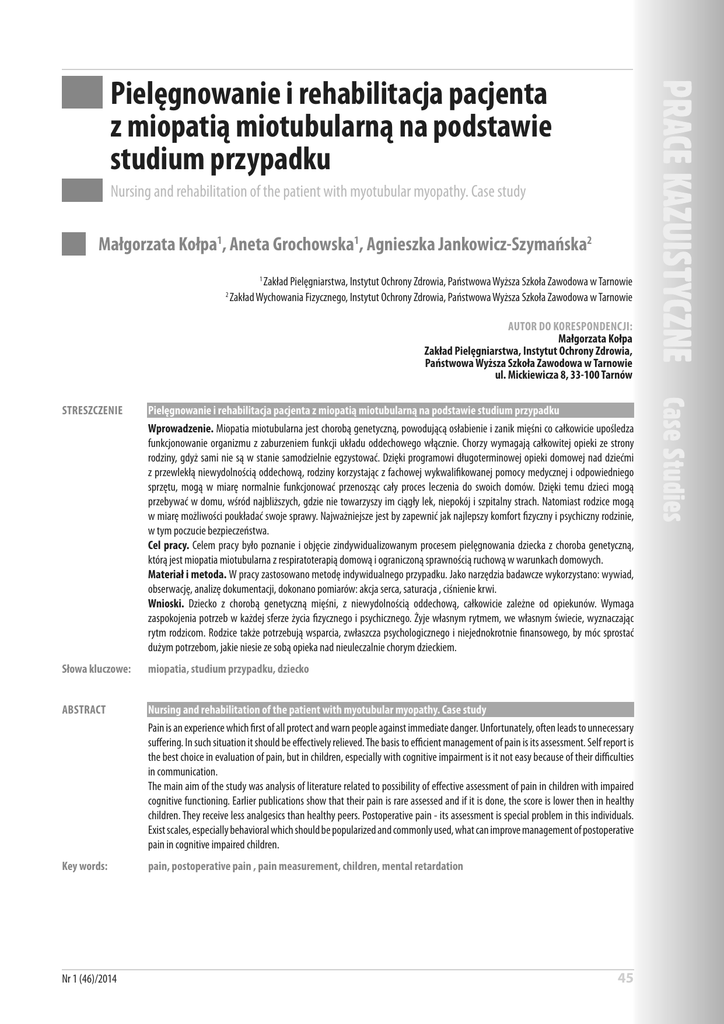 Pielęgnowanie i rehabilitacja pacjenta z miopatią miotubularną na podstawie studium przypadku Nursing and rehabilitation of the patient with myotubular myopathy. Case study Małgorzata Kołpa1, Aneta Grochowska1, Agnieszka Jankowicz-Szymańska2 1 2 Zakład Pielęgniarstwa, Instytut Ochrony Zdrowia, Państwowa Wyższa Szkoła Zawodowa w Tarnowie Zakład Wychowania Fizycznego, Instytut Ochrony Zdrowia, Państwowa Wyższa Szkoła Zawodowa w Tarnowie AUTOR DO KORESPONDENCJI: Małgorzata Kołpa Zakład Pielęgniarstwa, Instytut Ochrony Zdrowia, Państwowa Wyższa Szkoła Zawodowa w Tarnowie ul. Mickiewicza 8, 33-100 Tarnów STRESZCZENIE Pielęgnowanie i rehabilitacja pacjenta z miopatią miotubularną na podstawie studium przypadku Wprowadzenie. Miopatia miotubularna jest chorobą genetyczną, powodującą osłabienie i zanik mięśni co całkowicie upośledza funkcjonowanie organizmu z zaburzeniem funkcji układu oddechowego włącznie. Chorzy wymagają całkowitej opieki ze strony rodziny, gdyż sami nie są w stanie samodzielnie egzystować. Dzięki programowi długoterminowej opieki domowej nad dziećmi z przewlekłą niewydolnością oddechową, rodziny korzystając z fachowej wykwalifikowanej pomocy medycznej i odpowiedniego sprzętu, mogą w miarę normalnie funkcjonować przenosząc cały proces leczenia do swoich domów. Dzięki temu dzieci mogą przebywać w domu, wśród najbliższych, gdzie nie towarzyszy im ciągły lek, niepokój i szpitalny strach. Natomiast rodzice mogą w miarę możliwości poukładać swoje sprawy. Najważniejsze jest by zapewnić jak najlepszy komfort fizyczny i psychiczny rodzinie, w tym poczucie bezpieczeństwa. Cel pracy. Celem pracy było poznanie i objęcie zindywidualizowanym procesem pielęgnowania dziecka z choroba genetyczną, którą jest miopatia miotubularna z respiratoterapią domową i ograniczoną sprawnością ruchową w warunkach domowych. Materiał i metoda. W pracy zastosowano metodę indywidualnego przypadku. Jako narzędzia badawcze wykorzystano: wywiad, obserwację, analizę dokumentacji, dokonano pomiarów: akcja serca, saturacja , ciśnienie krwi. Wnioski. Dziecko z chorobą genetyczną mięśni, z niewydolnością oddechową, całkowicie zależne od opiekunów. Wymaga zaspokojenia potrzeb w każdej sferze życia fizycznego i psychicznego. Żyje własnym rytmem, we własnym świecie, wyznaczając rytm rodzicom. Rodzice także potrzebują wsparcia, zwłaszcza psychologicznego i niejednokrotnie finansowego, by móc sprostać dużym potrzebom, jakie niesie ze sobą opieka nad nieuleczalnie chorym dzieckiem. Słowa kluczowe: miopatia, studium przypadku, dziecko ABSTRACT Nursing and rehabilitation of the patient with myotubular myopathy. Case study Pain is an experience which first of all protect and warn people against immediate danger. Unfortunately, often leads to unnecessary suffering. In such situation it should be effectively relieved. The basis to efficient management of pain is its assessment. Self report is the best choice in evaluation of pain, but in children, especially with cognitive impairment is it not easy because of their difficulties in communication. The main aim of the study was analysis of literature related to possibility of effective assessment of pain in children with impaired cognitive functioning. Earlier publications show that their pain is rare assessed and if it is done, the score is lower then in healthy children. They receive less analgesics than healthy peers. Postoperative pain - its assessment is special problem in this individuals. Exist scales, especially behavioral which should be popularized and commonly used, what can improve management of postoperative pain in cognitive impaired children. Key words: pain, postoperative pain , pain measurement, children, mental retardation Nr 1 (46)/2014 45 Pielęgnowanie i rehabilitacja pacjenta z miopatią miotubularną na podstawie studium przypadku WPROWADZENIE indywidualne. Istnieje wiele wzorców reagowania na stratę, a ich zewnętrzne okazywanie zależy od wielu czynniChoroba genetyczna, jaką jest miopatia miotubularna, ków kulturowych, społecznych, religijnych [5]. jest chorobą nieuleczalną, nie dającą nadziei na wyleczenie, czy dobre rokowanie. Pomimo rozwoju medycyny CEL PRACY w diagnozowaniu tej choroby, nie wynaleziono lekarstwa, Celem pracy było poznanie i objęcie zindywidualiktóre mogłoby odwrócić defekt genetyczny, lub usprawnić funkcję organizmu. W dobie XXI w. przy olbrzymim po- zowanym procesem pielęgnowania dziecka z chorobą stępie techniki chore dzieci mają jednak możliwość prze- genetyczną, którą jest miopatia miotubularna z respirabywania w domu pod troskliwą opieką rodziców, która toterapią domową i ograniczoną sprawnością ruchową wymaga całkowitego zaangażowania i oddania się chore- w warunkach domowych. mu dziecku o każdej porze dnia i nocy. Jest to możliwe dzięki zapoczątkowanemu w 2000 r. programowi rozwoju METODYKA BADAŃ opieki długoterminowej w Polsce, nad dziećmi z przewlekłą niewydolnością oddechową. Miopatia miotubularna W pracy posłużono się metodą indywidualnego przyw dużym stopniu upośledza funkcjonowanie mięśni padku. Zastosowano następujące techniki wywiad pielęw tym również oddechowych doprowadzając do niewy- gniarski, obserwację, analizę dokumentacji, historię chodolności oddechowej, wymagającej ciągłej respiratotera- roby indywidualną kartę zleceń kartę obserwacyjną histopii. rię pielęgnowania i wyniki badań diagnostycznych. Pielęgnowanie dziecka wentylowanego mechanicznie w domu jest procesem złożonym, w którym oprócz pielę- Epikryza gniarki biorą udział pozostali członkowie zespołu terapeuAdam J urodził się 31 lipca 2006 roku. Była to pierwsza tycznego. Jednak najważniejszą rolę w opiece nad dziec- ciąża matki o przebiegu prawidłowym, rozwiązana drokiem sprawuje przede wszystkim rodzina. gą cięcia cesarskiego w 35-tym tyg