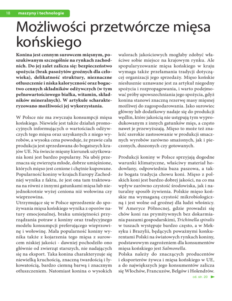 18 maszyny i technologie Możliwości przetwórcze mięsa końskiego Konina jest cennym surowcem mięsnym, poszukiwanym szczególnie na rynkach zachodnich. Do jej zalet zalicza się: bezpieczeństwo spożycia (brak pasożytów groźnych dla człowieka), delikatność struktury, nieznaczne otłuszczenie i niska kaloryczność oraz bogactwo cennych składników odżywczych (w tym pełnowartościowego białka, witamin, składników mineralnych). W artykule scharakteryzowano możliwości jej wykorzystania. W Polsce nie ma zwyczaju konsumpcji mięsa końskiego. Niewiele jest także działań promocyjnych informujących o wartościach odżywczych tego mięsa oraz uzyskanych z niego wyrobów, a wysoka cena powoduje, że prawie cała produkcja jest sprzedawana do bogatszych krajów UE. Na świecie mięsny kierunek użytkowania koni jest bardzo popularny. Na ubój przeznacza się zwierzęta młode, dobrze umięśnione, których mięso jest cenione i chętnie kupowane. Popularność koniny w krajach Europy Zachodniej wynika z faktu, że jest ona tam traktowana na równi z innymi gatunkami mięsa lub niejednokrotnie wyżej ceniona niż wołowina czy wieprzowina. Utrzymujące się w Polsce uprzedzenie do spożywania mięsa końskiego wynika z oporów natury emocjonalnej, braku umiejętności przyrządzania potraw z koniny oraz tradycyjnego modelu konsumpcji preferującego wieprzowinę i wołowinę. Mała popularność koniny wynika także z kojarzenia tego mięsa z surowcem niskiej jakości - dawniej pochodziło ono głównie od zwierząt starszych, nie nadających się na eksport. Taka konina charakteryzuje się niewielką kruchością, znaczną twardością i łykowatością, bardzo ciemną barwą i znacznym otłuszczeniem. Natomiast konina o wysokich walorach jakościowych mogłaby zdobyć właściwe sobie miejsce na krajowym rynku. Ale spopularyzowanie mięsa końskiego w kraju wymaga także przełamania tradycji dotyczącej organizacji jego sprzedaży. Mięso końskie niesłusznie uznawane jest za artykuł niegodny spożycia i rozpropagowania, i warto podejmować próby upowszechniania jego spożycia, gdyż konina stanowi znaczną rezerwę masy mięsnej możliwej do zagospodarowania. Jako surowiec główny lub dodatkowy nadaje się do produkcji wędlin, które jakością nie ustępują tym wyprodukowanym z innych gatunków mięs, a często nawet je przewyższają. Mięso to może też znaleźć szerokie zastosowanie w produkcji smacznych wyrobów zarówno smażonych, jak i pieczonych, duszonych czy gotowanych. Produkcji koniny w Polsce sprzyjają dogodne warunki klimatyczne, właściwy materiał hodowlany, odpowiednia baza paszowa, a także bogata tradycja chowu koni. Mięso z polskich koni jest bardzo dobrej jakości, na co ma wpływ zarówno czystość środowiska, jak i naturalny sposób żywienia. Polskie mięso końskie ma wymaganą czystość mikrobiologiczną i jest wolne od groźnej dla ludzi włośnicy. W Ameryce Północnej, gdzie prowadzi się chów koni ras prymitywnych bez dokarmiania paszami gospodarskimi, Trichinella spiralis w tuszach występuje bardzo często, a w Meksyku i Brazylii, będących poważnymi konkurentami Polski na światowych rynkach koniny, podstawowym zagrożeniem dla konsumentów mięsa końskiego jest Salmonella. Polska należy do znaczących producentów i eksporterów żywca i mięsa końskiego w UE, a do największych jego konsumentów zalicza się Włochów, Francuzów, Belgów i Holendrów. cd. str. 20 20 maszyny i technologie Poza Europą konsumpcja koniny utrzymała się głównie w Japonii i Chinach. Włosi, dyktujący gust i ton wśród amatorów mięsa końskiego w Europie, cenią mięso z koni zimnokrwistych i twierdzą, że polska konina ma wyjątkowy smak oraz aromat. Podobną opinią cieszy się ona wśród smakoszy z Japonii. Charakterystyka mięsa końskiego Z technologicznego punktu widzenia konina nie ustępuje innym gatunkom mięs. Jest surowcem delikatnym, cennym, bezpiecznym w spożyciu ze zdrowotnego punktu widzenia. Składem chemicznym i obrazem histologicznym zbliżona jest do wołowiny. W porównaniu z innymi gatunkami mięs odznacza się jednak intensywną czerwoną barwą, ciemniejącą przy dostępie światła oraz większą spoistością i jędrnością, wynikającą z typu włókien mięśniowych. Włókna mięśniowe są cienkie, poprzetykane tkanką tłuszczową, co daje pożądany efekt marmurkowatości. Mięso młodych osobników ma delikatniejszą strukturę i jest lepiej przyswajalne od wołowiny czy wieprzowiny. Wartość kaloryczna koniny, dzięki niewielkiej zawartości tłuszczu śródmięśniowego, jest niska (średnio 470 kJ/100g). Do niskokalorycznych wyrębów z tuszy końskiej zalicza się zwłaszcza łopatkę (4,8% tłuszczu) i udziec (6,3% tł.). Wyższą zawartością tłuszczu charakteryzuje się karkówka (8,6%) oraz rostbef (13,0%). Tłuszcz pochodzący z koni młodych jest biały, ewentualnie z lekkim żółtawym odcieniem, a ze zwierząt starszych - intensywnie żółty. Złogi tkanki tłuszczowej podskórnej lub wypełniającej jamy ciała nie są cennym surowcem dla kuchni, ale mogą być wykorzystywane w przemyśle spożywczym oraz w celach technicznych. Tłuszcz śródmięśniowy występuje w znikomych ilościach i wyraźnie różni się od tłuszczu innych gatunków zwierząt - w konsystencji jest oleisty i łatwo topliwy, a w związku z tym lepiej przyswajalny. Ze względu na dużą zawartość niezbędnych nienasyconych kwasów tłuszczowych odznacza się wysoką wartością biologiczną. W smaku przypomina tłuszcz gęsi, a ze względu na półpłynną konsystencję nadaje się po stopieniu do smażenia. Konina zawiera średnio 20,1% białka, 8,5% tłuszczu, 0,4% węglowodanów. Wartości wymienionych składników są oczywiście zmienne i uzależnione od elementów tuszy, z których zostały pozyskane. Najwyższą zawartością białka charakteryzuje się mięso z łopatki i udźca. Dodatkowo mięso