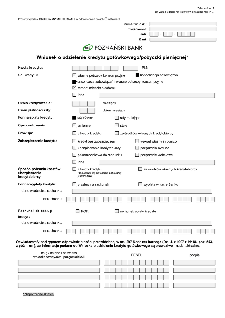 Załącznik nr 1 do Zasad udzielania kredytów konsumenckich … Prosimy wypełnić DRUKOWANYMI LITERAMI, a w odpowiednich polach wstawić X. numer wniosku: miejscowość: data: - - Bank: Wniosek o udzielenie kredytu gotówkowego/pożyczki pieniężnej* Kwota kredytu: PLN , własne potrzeby konsumpcyjne Cel kredytu: konsolidacja zobowiązań konsolidacja zobowiązań i własne potrzeby konsumpcyjne remont mieszkania/domu inne Okres kredytowania: miesięcy Dzień płatności raty: dzień miesiąca Forma spłaty kredytu: raty równe raty malejące Oprocentowanie: zmienne stałe Prowizja: z kwoty kredytu ze środków własnych kredytobiorcy Zabezpieczenie kredytu: kredyt bez zabezpieczeń weksel własny in blanco ubezpieczenie kredytobiorcy poręczenie cywilne pełnomocnictwo do rachunku poręczenie wekslowe inne Sposób pobrania kosztów ubezpieczenia kredytobiorcy Forma wypłaty kredytu: ze środków własnych kredytobiorcy z kwoty kredytu (dopuszcza się dla składki pobieranej jednorazowo) wypłata w kasie Banku przelew na rachunek dane właściciela rachunku: nr rachunku: Rachunek do obsługi ROR rachunek spłaty kredytu kredytu: dane właściciela rachunku: nr rachunku: Oświadczam/y pod rygorem odpowiedzialności przewidzianej w art. 297 Kodeksu karnego (Dz. U. z 1997 r. Nr 88, poz. 553, z późn. zm.), że informacje podane we Wniosku o udzielenie kredytu gotówkowego są prawdziwe i nadal aktualne. imię / imiona i nazwisko wnioskodawcy/ów poręczyciela/li * Niepotrzebne skreślić PESEL podpis