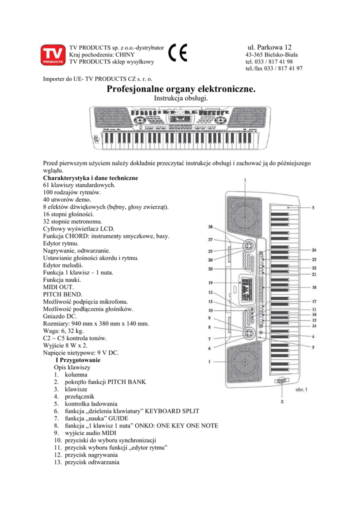 TV PRODUCTS sp. z o.o.-dystrybutor Kraj pochodzenia: CHINY TV PRODUCTS sklep wysyłkowy ul. Parkowa 12 43-365 Bielsko-Biała tel. 033 / 817 41 98 tel./fax 033 / 817 41 97 Importer do UE- TV PRODUCTS CZ s. r. o. Profesjonalne organy elektroniczne. Instrukcja obsługi. Przed pierwszym użyciem należy dokładnie przeczytać instrukcje obsługi i zachować ją do późniejszego wglądu. Charakterystyka i dane techniczne 61 klawiszy standardowych. 100 rodzajów rytmów. 40 utworów demo. 8 efektów dźwiękowych (bębny, głosy zwierząt). 16 stopni głośności. 32 stopnie metronomu. Cyfrowy wyświetlacz LCD. Funkcja CHORD: instrumenty smyczkowe, basy. Edytor rytmu. Nagrywanie, odtwarzanie. Ustawianie głośności akordu i rytmu. Edytor melodii. Funkcja 1 klawisz – 1 nuta. Funkcja nauki. MIDI OUT. PITCH BEND. Możliwość podpięcia mikrofonu. Możliwość podłączenia głośników. Gniazdo DC. Rozmiary: 940 mm x 380 mm x 140 mm. Waga: 6, 32 kg. C2 ~ C5 kontrola tonów. Wyjście 8 W x 2. Napięcie nietypowe: 9 V DC. I Przygotowanie Opis klawiszy 1. kolumna 2. pokrętło funkcji PITCH BANK 3. klawisze 4. przełącznik 5. kontrolka ładowania 6. funkcja „dzielenia klawiatury” KEYBOARD SPLIT 7. funkcja „nauka” GUIDE 8. funkcja „1 klawisz 1 nuta” ONKO: ONE KEY ONE NOTE 9. wyjście audio MIDI 10. przyciski do wyboru synchronizacji 11. przycisk wyboru funkcji „edytor rytmu” 12. przycisk nagrywania 13. przycisk odtwarzania 14. kasowanie przeniesienia tonów 15. 16. 17. 18. 19. 20. 21. 22. 23. 24. 25. 26. 27. 28. przeniesienie tonów RHY VOL- regulacja głośności rytmów CHORD VOL- regulacja głośności 8 grup efektów bębnowych wyświetlacz LCD numerki wybierania klawiszy obsługa głośności kontrolne przyciski wyboru tempa przycisk do pokazywania kompozycji przycisk STOP możliwość zabarwienia tonu głosy zwierząt- przełączanie ustawianie rytmów odtwarzanie rytmu Źródło ładowania A. Otworzyć schowek na baterie na spodniej części organów. Włożyć 6 baterii 1,5 V. zwrócić uwagę na właściwą biegunowość. Zamknąć schowek. Uwaga! jeśli urządzenie będzie przez dłuższy czas nieużywane, należy wyjąć z niego baterie. Używać tylko wysokiej jakości baterii alkalicznych. Nie mieszać różnych typów baterii czy nowych ze starymi. Nie wyrzucać baterii do kosza na śmieci ale oddać je do miejsca recyklacji baterii. B. Gniazdo AC: konektor adaptera podłączyć do styku 9V DC. Potem podłączyć wtyczkę adaptera do styków do konektorów głośników. L= lewy głośnik, P= prawy głośnik. Głośniki ulepszą efekty grania, i efekt ogólny. Użycie pedałów Do organów można podłączyć pedały (nie są częścią przesyłki). Konektor pedałów podłączyć do styku przeznaczonego na pedały. Funkcja MIDI OUT: Wcisnąć przycisk MIDI OUT ON/OFF (włączone/ wyłączone). Urządzenie podłączyć do styku MIDI. Funkcja SLEEP Jeśli organy są nieużywane dłużej niż 3 min., organy automatycznie przejdą do funkcji „zaśnięcia” SLEEP a zarazem wyłączy się wyświetlacz. Tryb SLEEP przerywamy wciśnięciem któregokolwiek klawisza. II Opis wyświetlacza LCD 1. ikony włączonych funkcji. 2. nazwa tonu/ rytmu. 3. numer tonu/ rytmu. 4. głośność. 5. instrukcja układania palców. 6. ikona tempa rytmu. 7. plan nut. III Granie Podłączenie organów Wcisnąć przycisk przełącznika POWER. Zaświeci się czerwona lampka i wyświetlacz. Nastawić wybrany poziom dźwięku, który pokaże się na wyświetlaczu. 100 rodzajów barw tonów. Wcisnąć SELECT TONE(25). Na przyciskach numerycznych wybrać numer barwy tonu. Wybrany numer i nazwa tonu pokaże się na wyświetlaczu. Jeśli trzeba dalej wybierać instrumenty uzupełniające za pomocą grupy przycisków(10): SUSTAIN- przedłużenie tonu, VIBRATION- wibracja tonu, lub użyć funkcji pedała tembr- zabarwienie tonu. 100 rodzajów rytmów muzycznych Wcisnąć przycisk SELECT RYTM(27). Na wyświetlaczu pokaże się STYLE. Na przyciskach numerycznych wybrać numer rytmu. Wybrany numer i nazwa rytmu pokaże się na wyświetlaczu. Za pomocą przycisku RHY VOL(16) wybrać poziom głośności danego rytmu. Wcisnąć PLAY (28)- rozpocznie się odtwarzanie danego rytmu. Po zakończeniu odtwarzania wcisnąć przycisk STOP. Następnie można włączyć funkcję DEMO lub RECORD- objaśnienie tych 2 funkcji nastąpi dalej. 40 utworów muzycznych A. wcisnąć przycisk DEMO(23)- wybór DEMO A- utwór jest odtwarzany w kółko. B. wcisnąć przycisk DEMO(23)- wybór DEMO B- utwory odtwarzane są w kolejności. Na wyświetlaczu pokazuje się nazwa i numer utworu. C. w odtwarzanym utworze można zmienić barwy tonów. Najpierw zatrzymać odtwarzanie przyciskiem STOP(24). 16 stopni głośności. Stopień głośności nastawić przyciskiem VOLUME(21). Przyciskiem ^ zwiększa się głośność, odwrotnym obniża. Poziom głośności pojawia się na wyświetlaczu. 32 stopnie kontroli tempa. Stopień kontroli metronomem ustawić za pomocą przycisków TEMPO. Przycisk ^ zwiększa stopień, odwrotny zmniejsza. Stopień ustawienia tempa pokaże się na wyświetlaczu. Funkcja EDYTOR RYTMU Dla klawiszy można ustawić własny rytm. Wcisnąć przycisk wyboru funkcji EDYTOR RYTMU- RYTHM EDIT(11). Na wyświetlaczu pojawi się PROG. Teraz wybrać instrument, głośność rytmu (możliwość zaznaczenia 16 nut), wcisnąć przycisk REC(13). PLAY, na wyświetlaczu pojawi się potwierdzenie, że odtwarzany rytm został wybrany REPLAY. Wybrany rytm potwierdzić przyciskiem RYTHM EDIT(11). Funkcja nagrywania / dźwiękowa reprodukcja Wcisnąć przycisk nagrywania RECORD(12). Na wyświetlaczu pojawi się RECORD. Odtworzyć utwór (można wybrać 64 nuty). Aby odtworzyć- reprodukcja dźwięku, wcisnąć przycisk REC.PLAY(13), na wyświetlaczu pojawi się REPLAY i utwór zacznie się odtwarzać. Potem wcisnąć STOP. Funkcja 1 klawisz 1 nuta a. wcisnąć przycisk OKON(8), na wyświetlaczu pojawi się ONEKEY. b. Po wciśnięci