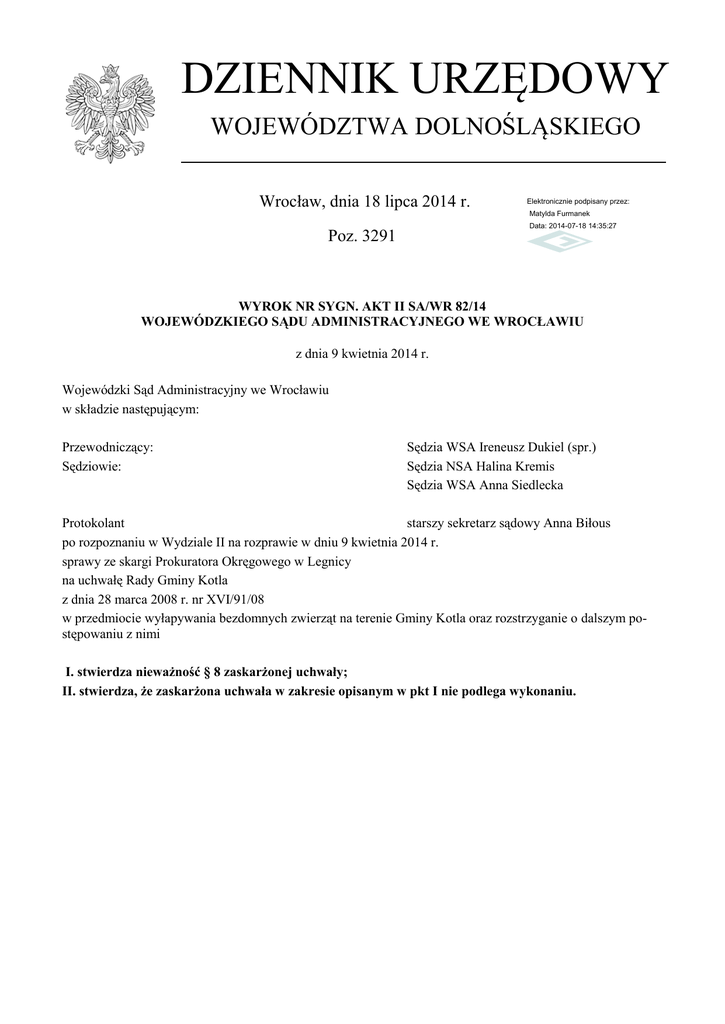 DZIENNIK URZĘDOWY WOJEWÓDZTWA DOLNOŚLĄSKIEGO Wrocław, dnia 18 lipca 2014 r. Elektronicznie podpisany przez: Matylda Furmanek Data: 2014-07-18 14:35:27 Poz. 3291 WYROK NR SYGN. AKT II SA/WR 82/14 WOJEWÓDZKIEGO SĄDU ADMINISTRACYJNEGO WE WROCŁAWIU z dnia 9 kwietnia 2014 r. Wojewódzki Sąd Administracyjny we Wrocławiu w składzie następującym: Przewodniczący: Sędziowie: Sędzia WSA Ireneusz Dukiel (spr.) Sędzia NSA Halina Kremis Sędzia WSA Anna Siedlecka Protokolant starszy sekretarz sądowy Anna Biłous po rozpoznaniu w Wydziale II na rozprawie w dniu 9 kwietnia 2014 r. sprawy ze skargi Prokuratora Okręgowego w Legnicy na uchwałę Rady Gminy Kotla z dnia 28 marca 2008 r. nr XVI/91/08 w przedmiocie wyłapywania bezdomnych zwierząt na terenie Gminy Kotla oraz rozstrzyganie o dalszym postępowaniu z nimi I. stwierdza nieważność § 8 zaskarżonej uchwały; II. stwierdza, że zaskarżona uchwała w zakresie opisanym w pkt I nie podlega wykonaniu. Dziennik Urzędowy Województwa Dolnośląskiego –2– Poz. 3291 Uzasadnienie Prokurator Okręgowy w Legnicy, działając na podstawie art. 5 ustawy z dnia 20 czerwca 1985 r. o prokuraturze (t. jedn. Dz. U. z 2008 r., Nr 7, poz. 39 ze zm.) oraz art. 101 ustawy z dnia 8 marca 1990 r. o samorządzie gminnym (t.jedn. Dz. U. z 2001 r. Nr 142, poz. 1591 ze zm.) złożył do Wojewódzkiego Sądu Administracyjnego we Wrocławiu skargę na uchwałę nr XVI/91/08 Rady Gminy Kotla z dnia 28 marca 2008 r. w sprawie wyłapywania bezdomnych zwierząt na terenie Gminy Kotla oraz rozstrzygania o dalszym postępowaniu z nimi. W złożonej skardze Prokurator wniósł o stwierdzenie nieważności § 8 tejże uchwały z powodu istotnego naruszenia przepisu art. 11 ust. 3 ustawy z dnia 21 sierpnia 1997 r. o ochronie zwierząt (t.jedn. Dz. U. z 2013 r., poz. 856, dalej w skrócie u.o.z.), polegającego na przekroczeniu przez gminę upoważnienia ustawowego poprzez wprowadzenie w zaskarżonym przepisie zapisu, iż „w przypadku ustalenia właściciela lub opiekuna złapanego zwierzęcia ponosi on koszty jego wyłapania, przewiezienia i umieszczenia w schronisku, w tym również opieki weterynaryjnej”. W uzasadnieniu skarżący wskazał, że podstawę prawną do podjęcia zaskarżonej uchwały stanowi art. 11 ust. 3 u.o.z., wedle którego „wyłapywanie bezdomnych zwierząt oraz rozstrzyganie o dalszym postępowaniu z tymi zwierzętami odbywa się wyłącznie na mocy uchwały rady gminy podjętej po uzgodnieniu z powiatowym lekarzem weterynarii oraz po zasięgnięciu opinii upoważnionego przedstawiciela organizacji społecznej, której statutowym celem działania jest ochrona zwierząt.”. Zdaniem Prokuratora powyższy przepis przyznaje organowi gminy kompetencje do stanowienia aktu prawa miejscowego i jednocześnie zakreśla granice tej regulacji. W ramach przyznanego upoważnienia ustawowego gmina uprawniona była zatem regulować kwestie w zakresie wyłapywania bezdomnych zwierząt i rozstrzygania o dalszym postępowaniu z tymi zwierzętami. Brak jest podstaw, aby w oparciu o wymieniony przepis ustanawiać wobec właściciela lub opiekuna obowiązek uiszczania opłat. Podniesiono również, iż zgodnie z art. 11 ust. 1 u.o.z. zapewnienie opieki bezdomnym zwierzętom oraz ich wyłapywanie należy do zadań własnych gminy. Zadania te są więc finansowane ze środków budżetu gminy, która w całości ponosi koszty realizacji tych zadań. Zwrócono także uwagę, że zaskarżony akt został wydany na podstawie przepisu art. 11 ust. 3 u.o.z., który w takim brzmieniu obowiązywał do 31 grudnia 2011 r. Przepis ten z dniem 1 stycznia 2012 r. uległ zmianie na mocy ustawy z dnia 16 września 2011 r. o zmianie ustawy o ochronie zwierząt oraz ustawy o utrzymaniu czystości i porządku w gminach (Dz. U. Nr 230, poz. 1372), w ten sposób, że odławianie bezdomnych zwierząt odbywa się wyłącznie na podstawie uchwały, o której mowa w art. 11a, a więc w sprawie określenia programu opieki nad zwierzętami bezdomnymi. Utrata mocy obowiązującej przepisu ustawy – zgodnie z regułą walidacyjną – spowodowała utratę mocy obowiązującej wydanego na jej podstawie aktu prawa miejscowego. Nieobowiązywanie aktu prawnego nastąpiło z dniem wejścia w życie przepisu zmieniającego. Przepisy te mają zatem nadal zastosowanie do sytuacji zaistniały do czasu wejścia w życie ustawy zmieniającej. Dlatego zasadne jest wyeliminowanie z obrotu prawnego wadliwego prawa w drodze stwierdzenia jego nieważności. W odpowiedzi na skargę Rada Gminy Kotla, reprezentowana przez Przewodniczącą Rady, uwzględniła w całości zawarte w skardze zarzuty, jednakże podniosła, iż nie ma możliwości zmiany przedmiotowej uchwały ze względu na brak podstaw prawnych do jej uchylenia. Uzasadniając swoje stanowisko organ uchwałodawczy wskazał, że nowelizacja u.o.z. dokonana ustawą o zmianie ustawy o ochronie zwierząt oraz ustawy o utrzymaniu czystości i porządku w gminach (Dz. U. Nr 230, poz. 1373 z 2011 r.) wprowadziła w art. 11a obligatoryjny obowiązek uchwalania przez gminy programu opieki nad zwierzętami bezdomnymi oraz zapobiegania bezdomności zwierząt w terminie do 31 marca każdego roku kalendarzowego. Oznacza to, że z chwilą uchwalenia uchwałą nr XVII/91/12 Rady Gminy Kotla z dnia 28 marca 2012 r. pierwszego Programu opieki nad zwierzętami bezdomnymi oraz zapobiegania bezdomności zwierząt na terenie Gminy Kotla, uchwała nr XVI/91/08 Rady Gminy Kotla z dnia 28 marca 2008 r. w sprawie wyłapywania bezdomnych zwierząt na terenie Gminy Kotla oraz rozstrzygania o dalszym postępowaniu z nimi utraciła byt prawny, zgodnie z zasadą „lex posterior derogat legi priori” – przepis późniejszy uchyla przepis wcześniejszy. Zdaniem organu w tym stanie rzeczy nie ma podstaw prawnych do stwierdzenia nieważności zaskarżonego § 8 tejże uchwały, albowiem utracił on moc obowiązującą, tak jak cała uchwała, z chwilą wejścia w ży