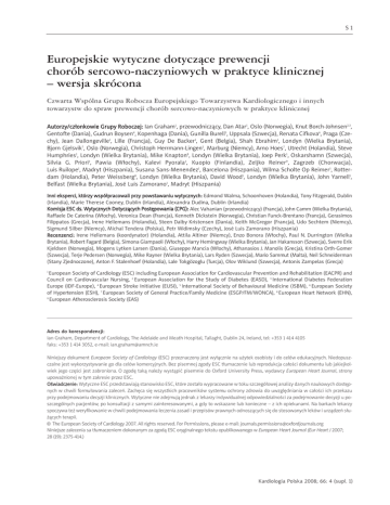 S1 Europejskie wytyczne dotyczące prewencji chorób sercowo-naczyniowych w praktyce klinicznej – wersja skrócona Czwarta Wspólna Grupa Robocza Europejskiego Towarzystwa Kardiologicznego i innych towarzystw do spraw prewencji chorób sercowo-naczyniowych w praktyce klinicznej Autorzy/członkowie Grupy Roboczej: Ian Graham1, przewodniczący, Dan Atar1, Oslo (Norwegia), Knut Borch-Johnsen2,3, Gentofte (Dania), Gudrun Boysen4, Kopenhaga (Dania), Gunilla Burell5, Uppsala (Szwecja), Renata Cifkova6, Praga (Czechy), Jean Dallongeville1, Lille (Francja), Guy De Backer1, Gent (Belgia), Shah Ebrahim1, Londyn (Wielka Brytania), Bjørn Gjelsvik7, Oslo (Norwegia), Christoph Herrmann-Lingen5, Marburg (Niemcy), Arno Hoes7, Utrecht (Holandia), Steve Humphries1, Londyn (Wielka Brytania), Mike Knapton8, Londyn (Wielka Brytania), Joep Perk1, Oskarshamn (Szwecja), Silvia G. Priori1, Pawia (Włochy), Kalevi Pyorala1, Kuopio (Finlandia), Zeljko Reiner9, Zagrzeb (Chorwacja), Luis Ruilope1, Madryt (Hiszpania), Susana Sans-Menendez1, Barcelona (Hiszpania), Wilma Scholte Op Reimer1, Rotterdam (Holandia), Peter Weissberg8, Londyn (Wielka Brytania), David Wood1, Londyn (Wielka Brytania), John Yarnell1, Belfast (Wielka Brytania), José Luis Zamorano1, Madryt (Hiszpania) Inni eksperci, którzy współpracowali przy powstawaniu wytycznych: Edmond Walma, Schoonhoven (Holandia), Tony Fitzgerald, Dublin (Irlandia), Marie Therese Cooney, Dublin (Irlandia), Alexandra Dudina, Dublin (Irlandia) Komisja ESC ds. Wytycznych Dotyczących Postępowania (CPG): Alec Vahanian (przewodniczący) (Francja), John Camm (Wielka Brytania), Raffaele De Caterina (Włochy), Veronica Dean (Francja), Kenneth Dickstein (Norwegia), Christian Funck-Brentano (Francja), Gerasimos Filippatos (Grecja), Irene Hellemans (Holandia), Steen Dalby Kristensen (Dania), Keith McGregor (Francja), Udo Sechtem (Niemcy), Sigmund Silber (Niemcy), Michal Tendera (Polska), Petr Widimsky (Czechy), José Luis Zamorano (Hiszpania) Recenzenci: Irene Hellemans (koordynator) (Holandia), Attila Altiner (Niemcy), Enzo Bonora (Włochy), Paul N. Durrington (Wielka Brytania), Robert Fagard (Belgia), Simona Giampaoli (Włochy), Harry Hemingway (Wielka Brytania), Jan Hakansson (Szwecja), Sverre Erik Kjeldsen (Norwegia), Mogens Lytken Larsen (Dania), Giuseppe Mancia (Włochy), Athanasios J. Manolis (Grecja), Kristina Orth-Gomer (Szwecja), Terje Pedersen (Norwegia), Mike Rayner (Wielka Brytania), Lars Ryden (Szwecja), Mario Sammut (Malta), Neil Schneiderman (Stany Zjednoczone), Anton F. Stalenhoef (Holandia), Lale Tokgözoglu (Turcja), Olov Wiklund (Szwecja), Antonis Zampelas (Grecja) European Society of Cardiology (ESC) including European Association for Cardiovascular Prevention and Rehabilitation (EACPR) and Council on Cardiovascular Nursing, 2 European Association for the Study of Diabetes (EASD), 3 International Diabetes Federation Europe (IDF-Europe), 4 European Stroke Initiative (EUSI), 5 International Society of Behavioural Medicine (ISBM), 6 European Society of Hypertension (ESH), 7 European Society of General Practice/Family Medicine (ESGP/FM/WONCA), 8 European Heart Network (EHN), 9 European Atherosclerosis Society (EAS) 1 Adres do korespondencji: Ian Graham, Department of Cardiology, The Adelaide and Meath Hospital, Tallaght, Dublin 24, Ireland, tel: +353 1 414 4105 faks: +353 1 414 3052, e-mail: [email protected] Niniejszy dokument European Society of Cardiology (ESC) przeznaczony jest wyłącznie na użytek osobisty i do celów edukacyjnych. Niedopuszczalne jest wykorzystywanie go dla celów komercyjnych. Bez pisemnej zgody ESC tłumaczenie lub reprodukcja całości dokumentu lub jakiejkolwiek jego części jest zabroniona. O zgodę taką należy wystąpić pisemnie do Oxford University Press, wydawcy European Heart Journal, strony upoważnionej w tym zakresie przez ESC. Oświadczenie: Wytyczne ESC przedstawiają stanowisko ESC, które zostało wypracowane w toku szczegółowej analizy danych naukowych dostępnych w chwili formułowania zaleceń. Zachęca się wszystkich pracowników systemu ochrony zdrowia do uwzględniania w całości ich przekazu przy podejmowaniu decyzji klinicznych. Wytyczne nie zdejmują jednak z lekarzy indywidualnej odpowiedzialności za podejmowanie decyzji u poszczególnych pacjentów, po konsultacji z samymi zainteresowanymi, a gdy to wskazane lub konieczne – z ich opiekunami. Na barkach lekarzy spoczywa też weryfikowanie w chwili podejmowania leczenia zasad i przepisów prawnych odnoszących się do stosowanych leków i urządzeń służących terapii. The European Society of Cardiology 2007. All rights reserved. For Permissions, please e-mail: [email protected] Niniejsze zalecenia sa tłumaczeniem dokonanym za zgodą ESC oryginalnego tekstu opublikowanego w European Heart Journal (Eur Heart J 2007; 28 (19): 2375-414.) Kardiologia Polska 2008; 66: 4 (supl. 1) S2 Europejskie wytyczne dotyczące prewencji chorób sercowo-naczyniowych w praktyce klinicznej – wersja skrócona Spis treści Wprowadzenie Wstęp Zakres problemu: przeszłość i przyszłość Podstawy naukowe Aspekty praktyczne: choroba wieńcowa Niewydolność serca Tętniak i rozwarstwienie aorty Choroba tętnic obwodowych Udar Aspekty praktyczne: postępowanie i zapobieganie udarowi Strategie zapobiegawcze i polityka prewencyjna Podstawy naukowe Aspekty praktyczne: polityka prewencyjna Prewencja w praktyce klinicznej Jak oceniać dowody naukowe Podstawy naukowe Co to są „dowody naukowe”? Poziomy wiarygodności danych Problemy związane z dowodami naukowymi i wytycznymi Aspekty praktyczne Priorytety, ocena ryzyka całkowitego oraz cele Wstęp Priorytety Ocena ryzyka całkowitego Jak ocenić ryzyko? Wnioski Zasady modyfikacji zachowań i postępowanie wobec czynników ryzyka wynikających z zachowania Podstawy naukowe Wzajemne relacje lekarz/opiekun – chory jako narzędzie zmiany nawyków Interwencje specjalistyczne i wielomodalne Aspekty praktyczne: postępowanie