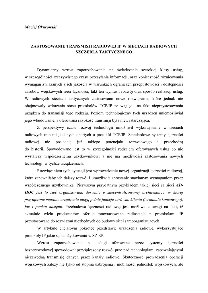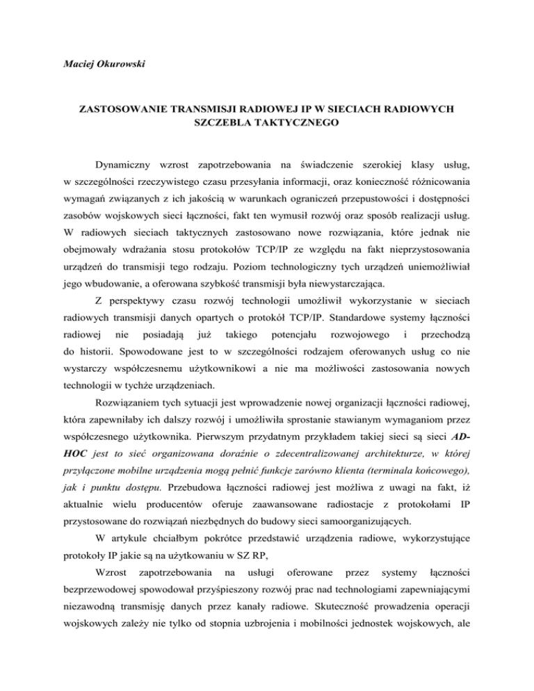 Maciej Okurowski ZASTOSOWANIE TRANSMISJI RADIOWEJ IP W SIECIACH RADIOWYCH SZCZEBLA TAKTYCZNEGO Dynamiczny wzrost zapotrzebowania na świadczenie szerokiej klasy usług, w szczególności rzeczywistego czasu przesyłania informacji, oraz konieczność różnicowania wymagań związanych z ich jakością w warunkach ograniczeń przepustowości i dostępności zasobów wojskowych sieci łączności, fakt ten wymusił rozwój oraz sposób realizacji usług. W radiowych sieciach taktycznych zastosowano nowe rozwiązania, które jednak nie obejmowały wdrażania stosu protokołów TCP/IP ze względu na fakt nieprzystosowania urządzeń do transmisji tego rodzaju. Poziom technologiczny tych urządzeń uniemożliwiał jego wbudowanie, a oferowana szybkość transmisji była niewystarczająca. Z perspektywy czasu rozwój technologii umożliwił wykorzystanie w sieciach radiowych transmisji danych opartych o protokół TCP/IP. Standardowe systemy łączności radiowej nie posiadają już takiego potencjału rozwojowego i przechodzą do historii. Spowodowane jest to w szczególności rodzajem oferowanych usług co nie wystarczy współczesnemu użytkownikowi a nie ma możliwości zastosowania nowych technologii w tychże urządzeniach. Rozwiązaniem tych sytuacji jest wprowadzenie nowej organizacji łączności radiowej, która zapewniłaby ich dalszy rozwój i umożliwiła sprostanie stawianym wymaganiom przez współczesnego użytkownika. Pierwszym przydatnym przykładem takiej sieci są sieci ADHOC jest to sieć organizowana doraźnie o zdecentralizowanej architekturze, w której przyłączone mobilne urządzenia mogą pełnić funkcje zarówno klienta (terminala końcowego), jak i punktu dostępu. Przebudowa łączności radiowej jest możliwa z uwagi na fakt, iż aktualnie wielu producentów oferuje zaawansowane radiostacje z protokołami IP przystosowane do rozwiązań niezbędnych do budowy sieci samoorganizujących. W artykule chciałbym pokrótce przedstawić urządzenia radiowe, wykorzystujące protokoły IP jakie są na użytkowaniu w SZ RP, Wzrost zapotrzebowania na usługi oferowane przez systemy łączności bezprzewodowej spowodował przyśpieszony rozwój prac nad technologiami zapewniającymi niezawodną transmisję danych przez kanały radiowe. Skuteczność prowadzenia operacji wojskowych zależy nie tylko od stopnia uzbrojenia i mobilności jednostek wojskowych, ale również od dostępu do informacji gromadzonych przez różne podsystemy działające na obszarze prowadzonych działań. Do osiągnięcia założonego celu działań wskazane jest, aby dowódcy różnych szczebli dowodzenia mieli zapewniony wspólny i aktualny obraz sytuacji taktycznej. Wymagania, jakim muszą sprostać współczesne systemy łączności wskazują, że rozwój wojskowych systemów telekomunikacyjnych ukierunkowany jest na technologie szerokopasmowe, najczęściej bazujące na protokole IP. Dotychczasowe sieci radiowe szczebla taktycznego były budowane w oparciu o radiostacje wąskopasmowe pracujące w zakresie częstotliwości UKF i KF. Z uwagi na ograniczenia wynikające z szerokości pasma oraz dość duży poziom zakłóceń w kanałach radiowych, usługi czasu rzeczywistego i wymagające prędkości większych niż 64 kbit/s np. transmisja wideo, nie były zapewniane przez podsystem radiowy, natomiast oferowana usługa transmisji krótkich wiadomości (tzw. chat), transmisja grafiki i nieruchomych obrazów, poczty elektronicznej mogły być realizowane za pomocą taktycznych sieci radiowych. W celu realizacji wybranych usług opartych na protokole TCP/IP, opracowano różnego rodzaju punkty dostępowe, czy bramy GATEWAY’E, których głównym zadaniem była integracja systemów radiowego i radioliniowo – przewodowego. Jako przykład tego typu rozwiązania można wskazać Radiowy Punkt Dostępowy (RPD) UKF/KF. RPD umożliwia użytkownikom sieci, wyposażonych w odpowiednie terminale oraz radiostacje, wymianę danych i połączeń głosowych z abonentami sieci LAN/WLAN, gdzie realizowane mogą być następujące usługi: 1. simpleksową transmisję głosu, 2. transmisję danych: a) raportów GPS; b) transmisję plików; c) pocztę elektroniczna; d) komunikator „chat”. W systemie STORCZYK wykorzystywany jest Blok Sprzężenia Radiowego (BSR), który jest elementem podsystemu dostępu radiowego zakresu KF/UKF. Integruje on usługi systemu radioliniowo-przewodowego i systemu radiowego, zapewniając usługi foniczne i transmisję danych opartych o protokół TCP/IP. Od kilku lat do Sił Zbrojnych RP wdrożono Sieć Wymiany Danych Związku Taktycznego (SWD ZT w oparciu o radiostacje rodziny PR4G, wykorzystujące pasmo UKF), która ma za zadanie zapewnienie wymiany danych operacyjnych pomiędzy zarówno abonentami przewodowymi jak i radiowymi. Urządzeniem peryferyjnym oferowane przez firmę HARRIS do rozwiązania integracji sieci radioliniowo-przewodowe z sieciami radiowymi jest koncentrator taktyczny Tactical Network Access HUB RF – 6010, który realizuje radiowy dostęp wielokanałowy w oparciu o cztery współpracujące z nim radiostacje (pasma KF lub UKF). Rozwój technologii spowodowany zapotrzebowaniem na usługi, umożliwił wykorzystanie w sieciach radiowych transmisji danych opartych o protokół TCP/IP, co pozwala na rezygnację ze stosowania urządzeń integrujących typu punkty dostępowe. Powszechne stosowanie protokołu IP związane jest zarówno z potrzebami użytkowników jak i z postępami zmniejszenia rozmiarów urządzeń przy zachowaniu ich włącznie zaawansowaną z pełnej użyteczności, techniką oraz cyfryzacji mikroprocesorową oraz urządzeń rozwojem radiowych koncepcji bezprzewodowych sieci ad-hoc. Aktualnie w Wojsku Polskim użytkuje się kilka typów urządzeń radiowych różnych producentów posiadających możliwość pracy w radiowej sieci IP, Podstawowymi urządzeniami zakresu częstotliwości UKF stosowanymi w SZ RP są radiostacje z rodziny PR4G, natomia