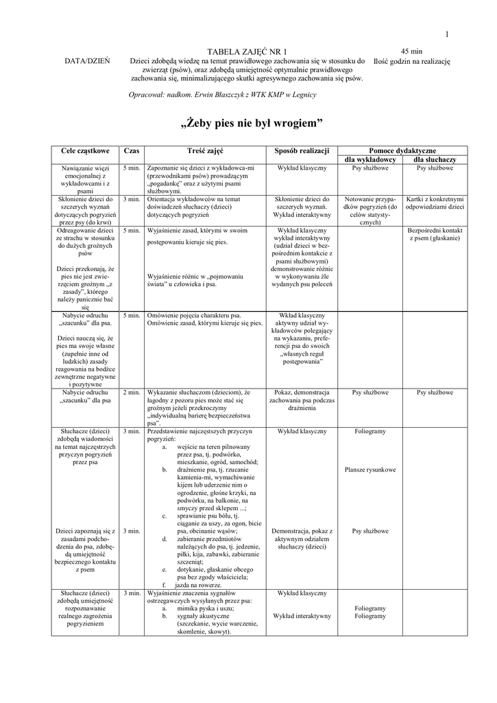 1 TABELA ZAJĘĆ NR 1 DATA/DZIEŃ Dzieci zdobędą wiedzę na temat prawidłowego zachowania się w stosunku do zwierząt (psów), oraz zdobędą umiejętność optymalnie prawidłowego zachowania się, minimalizującego skutki agresywnego zachowania się psów. 45 min Ilość godzin na realizację Opracował: nadkom. Erwin Błaszczyk z WTK KMP w Legnicy „Żeby pies nie był wrogiem” Cele cząstkowe Czas Nawiązanie więzi emocjonalnej z wykładowcami i z psami Skłonienie dzieci do szczerych wyznań dotyczących pogryzień przez psy (do krwi) Odreagowanie dzieci ze strachu w stosunku do dużych groźnych psów 5 min. Dzieci przekonają, że pies nie jest zwierzęciem groźnym „z zasady”, którego należy panicznie bać się Nabycie odruchu „szacunku” dla psa. Dzieci nauczą się, że pies ma swoje własne (zupełnie inne od ludzkich) zasady reagowania na bodźce zewnętrzne negatywne i pozytywne Nabycie odruchu „szacunku” dla psa Słuchacze (dzieci) zdobędą wiadomości na temat najczęstrzych przyczyn pogryzień przez psa Dzieci zapoznają się z zasadami podchodzenia do psa, zdobędą umiejętność bezpiecznego kontaktu z psem Słuchacze (dzieci) zdobędą umiejętność rozpoznawanie realnego zagrożenia pogryzieniem 3 min. 5 min. Treść zajęć Zapoznanie się dzieci z wykładowca-mi (przewodnikami psów) prowadzącym „pogadankę” oraz z użytymi psami służbowymi. Orientacja wykładowców na temat doświadczeń słuchaczy (dzieci) dotyczących pogryzień Wyjaśnienie zasad, którymi w swoim postępowaniu kieruje się pies. Wyjaśnienie różnic w „pojmowaniu świata” u człowieka i psa. 5 min. Omówienie pojęcia charakteru psa. Omówienie zasad, którymi kieruje się pies. Wykazanie słuchaczom (dzieciom), że łagodny z pozoru pies może stać się groźnym jeżeli przekroczymy „indywidualną barierę bezpieczeństwa psa”. 3 min. Przedstawienie najczęstszych przyczyn pogryzień: a. wejście na teren pilnowany przez psa, tj. podwórko, mieszkanie, ogród, samochód; b. drażnienie psa, tj. rzucanie kamienia-mi, wymachiwanie kijem lub uderzenie nim o ogrodzenie, głośne krzyki, na podwórku, na balkonie, na smyczy przed sklepem ...; c. sprawianie psu bólu, tj. ciąganie za uszy, za ogon, bicie psa, obcinanie wąsów; 3 min. d. zabieranie przedmiotów należących do psa, tj. jedzenie, piłki, kija, zabawki, zabieranie szczeniąt; e. dotykanie, głaskanie obcego psa bez zgody właściciela; f. jazda na rowerze. 3 min. Wyjaśnienie znaczenia sygnałów ostrzegawczych wysyłanych przez psa: a. mimika pyska i uszu; b. sygnały akustyczne (szczekanie, wycie warczenie, skomlenie, skowyt). 2 min. Sposób realizacji Pomoce dydaktyczne dla wykładowcy dla słuchaczy Wykład klasyczny Psy służbowe Psy służbowe Skłonienie dzieci do szczerych wyznań. Wykład interaktywny Notowanie przypadków pogryzień (do celów statystycznych) Kartki z konkretnymi odpowiedziami dzieci Bezpośredni kontakt z psem (głaskanie) Wykład klasyczny wykład interaktywny (udział dzieci w bezpośrednim kontakcie z psami służbowymi) demonstrowanie różnic w wykonywaniu źle wydanych psu poleceń Wkład klasyczny aktywny udział wykładowców polegający na wykazaniu, preferencji psa do swoich „własnych reguł postępowania” Pokaz, demonstracja zachowania psa podczas drażnienia Psy służbowe Wykład klasyczny Foliogramy Plansze rysunkowe Demonstracja, pokaz z aktywnym odziałem słuchaczy (dzieci) Psy służbowe Wykład klasyczny Wykład interaktywny Foliogramy Foliogramy Psy służbowe 2 Słuchacze (dzieci) zdobędą umiejętność optymalnie prawidłowego zachowania się w przypadku realnego zagrożenia (ataku psa). 5 min. Sprawdzenie czy słuchacze (dzieci) przyswoiły i utrwaliły w sposób wystarczający przekazaną wiedzę 3 min. Utrwalenie zdobytych wiadomości. Zachęcenie do udziału w konkursie plastycznym ogłoszonym przez „Głos Koszalinski” 3 min. Nawiązanie więzi emocjonalnej słuchaczy (dzieci) z użytymi do zajęć psami, a poprzez to, utrwalenie zdobytych wiadomości i umiejętności. Zakończenie zajęć Praktyczne pokazanie dzieciom sposobów uniknięcia, lub minimalizowania skutków ataku psa: a. ucieczka na drzewo, drabinę, za zamykane drzwi, za zamykaną furtkę (pod warunkiem, że pies jest daleko i możemy zdążyć uciec); b. zatrzymać się, nie krzyczeć, nie machać rękami, nie patrzeć psu w oczy; c. podsunąć psu coś do gryzienia, np. torbę, reklamówkę, plecak, teczkę, parasolkę, worek z kapciami, odgrodzić się od psa rowerem ...” Jeżeli pies nas już przewrócił to: a. zwinąć się w kłębek twarzą i brzuchem do ziemi (skulić się); b. zasłonić uszy, twarz, kark. 1. 1. 2. 7 min. Jak należy zachować się, aby nie prowokować psa do ataku i pogryzienia 2. Jak należy zachować się jeżeli już pies zaatakuje. Jak należy zachować się, aby nie prowokować psa do ataku i pogryzienia; Jak należy zachować się jeżeli już pies zaatakuje. Wykład klasyczny. Wykład interaktywny. Pies służbowy Kartki z wydrukowanymi pytaniami Kartki z wydrukoanymi pytaniami Demonstracja. Aktywny udział dzieci w demonstrowaniu optymalnych pozycji Swobodne wypowiedzi słuchaczy (dzieci) na piśmie Kserokopie założeń konkursu ogłoszonego prze „Głos Koszaliński” Swobodne ustne wypowiedzi słuchaczy (dzieci). Wykład interaktywny. Przedstawienie założeń konkursu oraz nagród Wykład klasyczny. Krótki pokaz tresury psów. Agresja. Sposoby zachowania się osoby prowokującej psa i osoby atakowanej przez psa. Wykład w postaci pokazu. Pożegnanie się z dziećmi Foliogramy Przewodniki Pies służbowy Bezpośredni kontakt dzieci z psami. Podanie łapy Kostium ochronny. Psy służbowe. Psy służbowe. 3 CO MA ROBIĆ DZIECKO, KIEDY PIES ZAATAKUJE Nie wolno zbliżać się do obcego psa. i Nawet jeśli wydaje się przyjazny, nie wolno go głaskać Na widok zbliżającego się groźnego psa trzeba stanąć nieruchomo, z j 