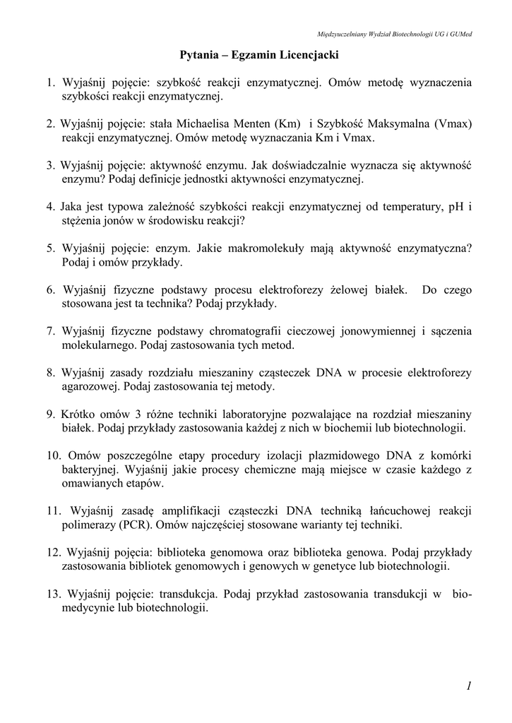 Międzyuczelniany Wydział Biotechnologii UG i GUMed Pytania – Egzamin Licencjacki 1. Wyjaśnij pojęcie: szybkość reakcji enzymatycznej. Omów metodę wyznaczenia szybkości reakcji enzymatycznej. 2. Wyjaśnij pojęcie: stała Michaelisa Menten (Km) i Szybkość Maksymalna (Vmax) reakcji enzymatycznej. Omów metodę wyznaczania Km i Vmax. 3. Wyjaśnij pojęcie: aktywność enzymu. Jak doświadczalnie wyznacza się aktywność enzymu? Podaj definicje jednostki aktywności enzymatycznej. 4. Jaka jest typowa zależność szybkości reakcji enzymatycznej od temperatury, pH i stężenia jonów w środowisku reakcji? 5. Wyjaśnij pojęcie: enzym. Jakie makromolekuły mają aktywność enzymatyczna? Podaj i omów przykłady. 6. Wyjaśnij fizyczne podstawy procesu elektroforezy żelowej białek. stosowana jest ta technika? Podaj przykłady. Do czego 7. Wyjaśnij fizyczne podstawy chromatografii cieczowej jonowymiennej i sączenia molekularnego. Podaj zastosowania tych metod. 8. Wyjaśnij zasady rozdziału mieszaniny cząsteczek DNA w procesie elektroforezy agarozowej. Podaj zastosowania tej metody. 9. Krótko omów 3 różne techniki laboratoryjne pozwalające na rozdział mieszaniny białek. Podaj przykłady zastosowania każdej z nich w biochemii lub biotechnologii. 10. Omów poszczególne etapy procedury izolacji plazmidowego DNA z komórki bakteryjnej. Wyjaśnij jakie procesy chemiczne mają miejsce w czasie każdego z omawianych etapów. 11. Wyjaśnij zasadę amplifikacji cząsteczki DNA techniką łańcuchowej reakcji polimerazy (PCR). Omów najczęściej stosowane warianty tej techniki. 12. Wyjaśnij pojęcia: biblioteka genomowa oraz biblioteka genowa. Podaj przykłady zastosowania bibliotek genomowych i genowych w genetyce lub biotechnologii. 13. Wyjaśnij pojęcie: transdukcja. Podaj przykład zastosowania transdukcji w biomedycynie lub biotechnologii. 1 Międzyuczelniany Wydział Biotechnologii UG i GUMed 14. Wyjaśnij pojęcie: organizm modelowy. Podaj przykłady przynajmniej trzech organizmów modelowych. W każdym przypadku wyjaśnij znaczenie omawianego organizmu modelowego w biomedycynie lub biotechnologii. 15. Wyjaśnij pojęcie: klonowanie genu. Omów na przykładzie procedurę klonowania genu prokariotycznego lub eukariotycznego. 16. Wyjaśnij różnicę pomiędzy pojęciami selekcja (selection) i przesiewanie (screen). Podaj konkretny przykład zastosowania tych technik w bio-medycynie lub biotechnologii. 17. Wyjaśnij pojęcie: gen. Omów różnice w budowie genów prokariotycznych i eukariotycznych. 18. Wyjaśnij pojęcie: genom. Omów różnice w strukturze i zawartości genowej genomów prokariotycznych i eukariotycznych. 19. Wyjaśnij pojęcie: ruchomy element genetyczny. Na przykładzie omów mechanizm powielania ruchomych elementów genetycznych w komórce. 20. Wyjaśnij pojęcie: mutacja. Podaj przykłady czynników mutagennych. Opisz mechanizm działania jednego takiego czynnika. 21. Wyjaśnij pojęcie bio-reaktor (fermentor). Omów schemat budowy bio-reaktora oraz podaj przykłady produktów o znaczeniu medycznym lub przemysłowym otrzymywanych w bio-reaktorach. 22. Wyjaśnij pojęcie: pierwsze prawo Mendla. Podaj konkretny przykład rozdziału genów zgodnie z tym mechanizmem genetycznym. 23. Wyjaśnij pojęcie: cecha sprzężona z płcią. Podaj przykład dziedziczenia takiej cechy. 24. Wyjaśnij pojęcie: mapa genetyczna. Na przykładach omów przynajmniej dwie techniki stosowane do mapowania genów w obrębie chromosomów. 25. Omów kilka metod pozwalających na przechowywanie materiału biologicznego w tym preparatów DNA, białek, szczepów bakteryjnych i drożdżowych oraz komórek eukariotycznych. 26. Omów na przykładach znaczenie technik molekularnych w medycynie sądowej. 27. Wyjaśnij pojęcie: dziedziczenie cytoplazmatyczne. Podaj konkretny przykład cechy dziedziczonej w ten sposób. 2 Międzyuczelniany Wydział Biotechnologii UG i GUMed 28. Krótko omów budowę mitochondriów i wyjaśnij znaczenie tych organelli dla biologii komórki i organizmu. Wyjaśnij ewolucyjne pochodzenie mitochondriów. 29. Krótko omów budowę rybosomu i wyjaśnij rolę poszczególnych elementów rybosomu w procesie translacji. 30. Wyjaśnij pojęcie: promotor. Podaj prokariotycznych i eukariotycznych. różnice w budowie promotorów 31. Krótko omów strukturę cząsteczki DNA. Jak struktura wpływa na stabilność i replikację DNA? 32. Krótko omów strukturę cząsteczki białka. Wyjaśnij pojęcia struktura I,II,III i IV rzędowa. 33. Podaj przykłady technik umożliwiających analizę I, II, III, i IV rzędowej struktury białka. 34. Opisz drogę regulacji ekspresji genów przez hormon sterydowy. Podaj powód dla którego receptory hormonów sterydowych są bardzo użytecznym celem terapii lekami. 35. Jakie typy uszkodzeń DNA są powodowane przez promienie UV? Omów mechanizm naprawy tych uszkodzeń. 36. Krótko omów strukturę błony komórkowej. Jakie techniki mogą być stosowane w analizie błon komórkowych? 37. Jakie mogą być przyczyny awitaminoz? Jak można leczyć awitaminozy używając metod biotechnologicznych? 38. Jaka jest podstawowa strategia obrony komórek przed uszkodzeniami spowodowanymi przez reaktywne formy tlenu (RFT)? Czy ma to znaczenie w biotechnologii roślin? 39. Omów budowę komórki roślinnej. Jakie cechy odróżniają ją od komórki zwierzęcej. 40. Zdefiniuj pojęcie totipotencja. Omów jego znaczenie w biotechnologii roślin. 41. Co to są regulatory wzrostu roślin? Omów ich praktyczne zastosowanie w biotechnologii. 3 Międzyuczelniany Wydział Biotechnologii UG i GUMed 42. Omów mechanizm wiązania azotu atmosferycznego. Wyjaśnij zainteresowanie biotechnologów tym zjawiskiem. 43. Co to są biopaliwa? Jakie organizmy znalazły się w polu zainteresowania biotechnologów pracujących nad tym zagadnieniem? 44. Omów proces fotosyntezy i chemosyntezy. Przedstaw znaczenie obu tych procesów. 45. Wymień 3 choroby o znanym pod