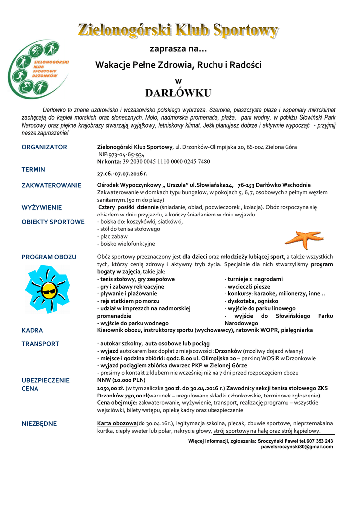 zaprasza na… Wakacje Pełne Zdrowia, Ruchu i Radości w DARŁÓWKU Darłówko to znane uzdrowisko i wczasowisko polskiego wybrzeża. Szerokie, piaszczyste plaże i wspaniały mikroklimat zachęcają do kąpieli morskich oraz słonecznych. Molo, nadmorska promenada, plaża, park wodny, w pobliżu Słowiński Park Narodowy oraz piękne krajobrazy stwarzają wyjątkowy, letniskowy klimat. Jeśli planujesz dobrze i aktywnie wypocząć - przyjmij nasze zaproszenie! ORGANIZATOR TERMIN ZAKWATEROWANIE WYŻYWIENIE OBIEKTY SPORTOWE PROGRAM OBOZU KADRA TRANSPORT UBEZPIECZENIE CENA NIEZBĘDNE Zielonogórski Klub Sportowy, ul. Drzonków-Olimpijska 20, 66-004 Zielona Góra NIP:973-04-65-934 Nr konta: 39 2030 0045 1110 0000 0245 7480 27.06.-07.07.2016 r. Ośrodek Wypoczynkowy „ Urszula” ul.Słowiańska14, 76-153 Darłówko Wschodnie Zakwaterowanie w domkach typu bungalow, w pokojach 5, 6, 7, osobowych z pełnym węzłem sanitarnym.(50 m do plaży) Cztery posiłki dziennie (śniadanie, obiad, podwieczorek , kolacja). Obóz rozpoczyna się obiadem w dniu przyjazdu, a kończy śniadaniem w dniu wyjazdu. - boiska do: koszykówki, siatkówki, - stół do tenisa stołowego - plac zabaw - boisko wielofunkcyjne Obóz sportowy przeznaczony jest dla dzieci oraz młodzieży lubiącej sport, a także wszystkich tych, którzy cenią zdrowy i aktywny tryb życia. Specjalnie dla nich stworzyliśmy program bogaty w zajęcia, takie jak: - tenis stołowy, gry zespołowe - turnieje z nagrodami - gry i zabawy rekreacyjne - wycieczki piesze - pływanie i plażowanie - konkursy: karaoke, milionerzy, inne… - rejs statkiem po morzu - dyskoteka, ognisko - udział w imprezach na nadmorskiej - wyjście do parku linowego promenadzie - wyjście do Słowińskiego Parku - wyjście do parku wodnego Narodowego Kierownik obozu, instruktorzy sportu (wychowawcy), ratownik WOPR, pielęgniarka - autokar szkolny, auta osobowe lub pociąg - wyjazd autokarem bez dopłat z miejscowości: Drzonków (możliwy dojazd własny) - miejsce i godzina zbiórki: godz.8.00 ul. Olimpijska 20 – parking WOSiR w Drzonkowie - wyjazd pociągiem zbiórka dworzec PKP w Zielonej Górze - prosimy o kontakt z klubem nie wcześniej niż na 7 dni przed rozpoczęciem obozu NNW (10.000 PLN) 1050,00 zł. (w tym zaliczka 300 zł. do 30.04.2016 r.) Zawodnicy sekcji tenisa stołowego ZKS Drzonków 750,00 zł(warunek – uregulowane składki członkowskie, terminowe zgłoszenie) Cena obejmuje: zakwaterowanie, wyżywienie, transport, realizację programu – wszystkie wejściówki, bilety wstępu, opiekę kadry oraz ubezpieczenie Karta obozowa(do 30.04.16r.), legitymacja szkolna, plecak, obuwie sportowe, nieprzemakalna kurtka, ciepły sweter lub polar, nakrycie głowy, strój sportowy na halę oraz strój kąpielowy. Więcej informacji, zgłoszenia: Sroczyński Paweł tel.607 353 243 [email protected]