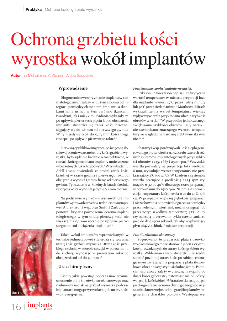Praktyka _ Ochrona ko∂ci grzbietu wyrostka Ochrona grzbietu kości wyrostka wokół implantów Autor _ dr Mohammed A. Alshehri, Arabia Saudyjska _Wprowadzenie Długoterminowe utrzymanie implantów stomatologicznych zależy w dużym stopniu od integracji pomiędzy elementami implantu a tkankami jamy ustnej, w tym zarówno tkankami twardymi, jak i miękkimi. Badania wykazały, że po upływie pierwszych pięciu lat od obciążenia implantu stwierdza się zanik kości brzeżnej sięgający 0,9 do 1,6 mm od pierwszego gwintu. W tym jedynie 0,05 do 0,13 mm kości ulega resorpcji po upływie pierwszego roku.1–3 Pierwszą opublikowaną pracą, poświęconą ilościowej ocenie wczesnej utraty kości grzbietu wyrostka, było 15-letnie badanie retrospektywne, w ramach którego oceniano implanty umieszczone w bezzębnych łukach zębowych.1 W tym badaniu Adell i wsp. stwierdzili, że średni zanik kości brzeżnej w czasie gojenia i pierwszego roku od obciążenia wynosił 1,2 mm, licząc od pierwszego gwintu. Tymczasem w kolejnych latach średnia resorpcja kości wynosiła jedynie 0,1 mm rocznie. Na podstawie wyników uzyskanych dla implantów wprowadzanych w technice dwuetapowej, Albrektsson i wsp. oraz Smith i Zarb zaproponowali kryteria powodzenia leczenia implantologicznego, w tym utratę pionową kości nie większą niż 0,2 mm rocznie po upływie pierwszego roku od obciążenia implantu.4, 5 Także wokół implantów wprowadzanych w technice jednoetapowej stwierdza się wczesną utratę kości grzbietu wyrostka. Utrata kości przebiega szybciej w obrębie szczęki w porównaniu do żuchwy, wynosząc w pierwszym roku od obciążenia od 0,6 do 1,1 mm.6-8 _Uraz chirurgiczny Ciepło, jakie powstaje podczas nawiercania, unoszenie płata śluzówkowo-okostnowego oraz nadmierny nacisk na grzbiet wyrostka podczas implantacji mogą przyczyniać się do utraty kości w okresie gojenia. Ryc. 1 16 implants 3_ 2011 Powstawanie ciepła i nadmierny nacisk Eriksson i Albrektsson napisali, że krytyczna wartość temperatury w miejscu preparacji łoża dla implantu wynosi 47°C przez jedną minutę lub 40°C przez siedem minut.9 Matthews i Hirsch wykazali, że na wzrost temperatury większy wpływ wywierała przykładana siła niż szybkość obrotów wiertła.10 W przypadku jednoczesnego zwiększania szybkości obrotów i siły nacisku, nie stwierdzano znaczącego wzrostu temperatury ze względu na bardziej efektywne skrawanie.10, 11 Sharawy i wsp. porównywali ilość ciepła generowanego przez wiertła należące do czterech różnych systemów implantologicznych przy szybkości obrotów 1225, 1667 i 2500 rpm.12 Wszystkie wiertła pozwalały na preparację łoża wielkości 8 mm, wywołując wzrost temperatury nie przekraczający 4°C (do 41°C). W każdym z systemów wiertło pracujące z prędkością 1225 rpm wymagało o 30 do 40% dłuższego czasu preparacji w porównaniu do 2500 rpm. Natomiast normalizacja temperatury kości trwała o 20 do 40% krócej. W przypadku większej głębokości preparacji i niezachowania odpowiedniego czasu pomiędzy pracą kolejnymi wiertłami, można osiągnąć lub przekroczyć szkodliwą temperaturę 47°C. Autorzy zalecają przerywanie cyklu nawiercania co pięć do dziesięciu sekund, tak aby wypływający płyn zdążył schłodzić miejsce preparacji. Płat śluzówkowo-okostnowy Sugerowano, że preparacja płata śluzówkowo-okostnowego może stanowić jeden z czynników prowadzących do utraty kości grzbietu wyrostka. Wilderman i wsp. stwierdzili, że średni stopień poziomej utraty kości po zabiegu chirurgicznym związanym z preparacją płata śluzówkowo-okostnowego wynosi około 0,8 mm. Potencjał naprawczy zależy w znacznym stopniu od ilości kości gąbczastej, natomiast nie od pokrywającej ją kości zbitej.13 Utrata kości, następująca po drugiej fazie leczenia chirurgicznego po uzyskaniu skutecznej osteointegracji implantów, ma generalnie charakter pionowy. Występuje wy- Praktyka _ Ochrona ko∂ci grzbietu wyrostka łącznie wokół implantów i ma kształt miseczki – nie dotyczy kości położonej dalej, mimo że jest ona także obnażana podczas zabiegu. Tak więc nie ma dowodów potwierdzających wspomnianą wyżej hipotezę. _Nadmierne obciążenie w zwarciu Badania wykazały, że przeciążenia zwarciowe często prowadzą do utraty kości brzeżnej lub cofnięcia procesu osteointegracji implantów, mimo jej wcześniejszego powodzenia.1, 3, 14-20 Grzbiet kości wyrostka wokół implantów stomatologicznych może stanowić punkt podparcia dźwigni, jeśli przykładane są siły zginające. Sugeruje to, że działanie sił mechanicznych może zwiększać podatność na utratę kości grzbietu wyrostka zębodołowego. Czynniki związane z przeciążeniami i siłami wyginającymi implanty: _Uzupełnienia protetyczne oparte na jednym lub dwóch implantach w odcinku bocznym (Rangert i wsp. 1995); _Proste ustawienie implantów; _Znaczne odchylenie osi implantu od kierunku działania sił; _Duży stosunek długości korony do implantu; _Zbyt długie przęsło dowieszone (> 15 mm w żuchwie, Shackleton i wsp. 1994; > 10-12 mm w szczęce, Rangert i wsp. 1989; Taylor 1991); _Rozbieżność pomiędzy wielkością powierzchni żującej i główką implantu; _Parafunkcje, silne zagryzanie i mocne kontakty przedwczesne (> 180 μm w badaniach na małpach, Miyata i wsp. 2000; > 100 μm w badaniach na ludziach, Falk i wsp. 1990); _Duże nachylenie guzków; _Niska jakość/gęstość kości; _Niewłaściwa liczba implantów. Kość zbita jest najmniej odporna na działanie sił ścinających, które znacznie wzrastają w przypadku wyginania spowodowanego przeciążeniem. Największą utratę kości obserwowano po stronie poddawanej pociąganiu.29 Według Von Recum, jeśli złoży się razem dwa materiały o różnym module elastyczności i jeden z nich zostanie poddany obciążeniu, dochodzi do wzrostu naprężenia w miejscu, gdzie te materiały po raz 
