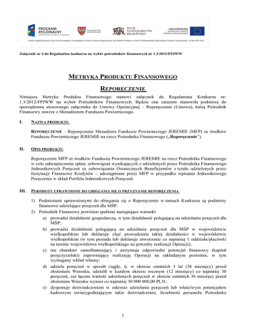 Załącznik nr 4 do Regulaminu konkursu na wybór pośredników finansowych nr 1.3/2012/FPJWW METRYKA PRODUKTU FINANSOWEGO REPORĘCZENIE Niniejsza Metryka Produktu Finansowego stanowi załącznik do Regulaminu Konkursu nr: 1.3/2012/FPJWW na wybór Pośredników Finansowych. Będzie ona zarazem stanowiła podstawę do sporządzenia stosownego załącznika do Umowy Operacyjnej – Reporęczenie (Umowa), którą Pośrednik Finansowy zawrze z Menadżerem Funduszu Powierniczego. I. NAZWA PRODUKTU REPORĘCZENIE – Reporęczenie Menadżera Funduszu Powierniczego JEREMIE (MFP) ze środków Funduszu Powierniczego JEREMIE na rzecz Pośrednika Finansowego („Reporęczenie”). II. OPIS PRODUKTU Reporęczenie MFP ze środków Funduszu Powierniczego JEREMIE na rzecz Pośrednika Finansowego w celu zabezpieczenia spłaty zobowiązań wynikających z udzielonych przez Pośrednika Finansowego Jednostkowych Poręczeń za zobowiązania Ostatecznych Beneficjentów z tytułu udzielonych przez Instytucje Finansowe Kredytów – udostępniane przez MFP w przypadku wpisania Jednostkowego Poręczenia w skład Portfela Jednostkowych Poręczeń. III. PODMIOTY UPRAWNIONE DO UBIEGANIA SIĘ O PRZYZNANIE REPORĘCZENIA 1) Podmiotami uprawnionymi do ubiegania się o Reporęczenie w ramach Konkursu są podmioty finansowe udzielające poręczeń dla MŚP. 2) Pośrednik Finansowy powinien spełniać następujące warunki: a) prowadzi działalność gospodarczą, w tym działalność polegającą na udzielaniu poręczeń dla MŚP; b) prowadzi działalność polegającą na udzielaniu poręczeń dla MŚP w województwie wielkopolskim lub deklaruje chęć prowadzenia takiej działalności w województwie wielkopolskim (w tym posiada lub deklaruje utworzenie co najmniej 1 oddziału/placówki na terenie województwa wielkopolskiego na potrzeby realizacji Operacji); c) ma charakter samofinansujący i utrzymuje odpowiedni potencjał finansowy (kapitał poręczycielski) zapewniający realizację Operacji na zakładanym poziomie, w tym wymagany wkład własny; d) udziela poręczeń w sposób ciągły, tj. w okresie ostatnich 3 lat (36 miesięcy) przed złożeniem Wniosku, udzielił w każdym okresie rocznym (12 miesięcy) co najmniej 30 poręczeń, zaś łączna wartość udzielonych poręczeń w okresie ostatnich 36 miesięcy przed złożeniem Wniosku wynosi co najmniej 30 000 000,00 PLN; e) dysponuje doświadczeniem w zakresie udzielania poręczeń lub właściwym potencjałem kadrowym uwiarygodniającym takie doświadczenie; liczebność personelu Pośrednika 1 Finansowego powinna być dostosowana do zamierzonej skali realizowanej Operacji oraz potencjału finansowego Pośrednika Finansowego; f) zarządza kapitałem z uwzględnieniem bezpieczeństwa lokat/inwestycji kapitałowych, tj. przechowuje wolne środki na rachunkach bankowych lub lokuje je na lokatach bankowych lub inwestuje je w papiery wartościowe emitowane przez Skarb Państwa, lub jednostki samorządu terytorialnego, bądź inwestuje je w jednostki uczestnictwa funduszy rynku pieniężnego g) posiada wdrożony standard organizacyjny oraz standard świadczenia usług poręczeniowych, w tym działa na podstawie regulaminu działalności poręczeniowej; h) posiada regulamin lub określone zasady tworzenia rezerw, w tym na ryzyko ogólne i celowe; i) prowadzi ewidencję udzielonych poręczeń, umożliwiającą sporządzenie okresowych (miesięcznych, kwartalnych i rocznych) raportów o aktualnej wartości poręczeń, a także o poręczeniach wypłaconych na rzecz Instytucji Finansowej oraz o należnościach dochodzonych przez niego w związku z wypłaconymi poręczeniami; j) przyjął akceptowane w sektorze finansowym metody oceny ryzyka, które umożliwiają przyporządkowanie właściwych stawek przedsiębiorcom (zgodnie z Obwieszczeniem Komisji w sprawie zastosowania art. 87 i 88 Traktatu WE do pomocy państwa w formie gwarancji – Dz. Urz. UE C 155 z 20.6.2008r.). 3) Ponadto Pośrednik Finansowy nie jest podmiotem, który: a) podlega wykluczeniu z ubiegania się o otrzymanie środków na podstawie art. 207 ustawy z dnia 27 sierpnia 2009 r. o finansach publicznych (Dz. U. z 2009 r., nr 157, poz. 1240 z późn. zm.) tj. o Reporęczenie nie może ubiegać się podmiot, na którym ciąży obowiązek zwrotu środków publicznych; b) pozostaje w toku likwidacji, postępowania upadłościowego, naprawczego lub pod zarządem komisarycznym; c) zakłada udzielenie pomocy przedsiębiorstwom zagrożonym w rozumieniu pkt 9-11 komunikatu Komisji w sprawie wytycznych wspólnotowych dotyczących pomocy państwa w celu ratowania i restrukturyzacji zagrożonych przedsiębiorstw (Dz. Urz. UE C 244 z 1.10.2004 r.) lub przedsiębiorstwom wykluczonym stosownie do Rozporządzenia Komisji (WE) nr 1998/2006 z dnia 15 grudnia 2006 r. w sprawie stosowania art. 87 i 88 Traktatu do pomocy de minimis, a także; d) na którym ciąży obowiązek zwrotu pomocy, wynikający z decyzji Komisji Europejskiej uznającej pomoc za niezgodną z prawem oraz ze wspólnym rynkiem. IV. PODSTAWOWE PARAMETRY PRODUKTU 1) Całkowita wysokość środków przeznaczona w ramach ogłoszonego Konkursu na produkt Reporęczenie wynosi 120 000 000,00 PLN. 2) Limit środków przyznanych pojedynczemu Pośrednikowi Finansowemu w ramach ogłoszonego Konkursu wynosi 40 000 000,00 PLN (Limit Reporęczenia). 3) MFP zastrzega prawo do zmiany wysokości kwot wskazanych powyżej w pkt 1-2, w przypadku gdy postępowanie konkursowe uzasadni taką decyzję. 4) MFP obejmie Reporęczeniem zobowiązania Pośrednika Finansowego wynikające z udzielonych przez niego Jednostkowych Poręczeń dla Instytucji Finansowych z tytułu udzielonych Ostatecznym Beneficjentom Kredytów, wpisywanych do Portfela Jednostkowych Poręczeń, w ramach Limitu Reporęczenia, do łącznej wartości określonej w Umowie, nie wyższej niż wskazana w pkt 2, z zastrzeżeniem pkt. X.4 niniejszej Metryki; 5) Jednostkowe Poręczenie jest obejmowane Reporęczeniem M