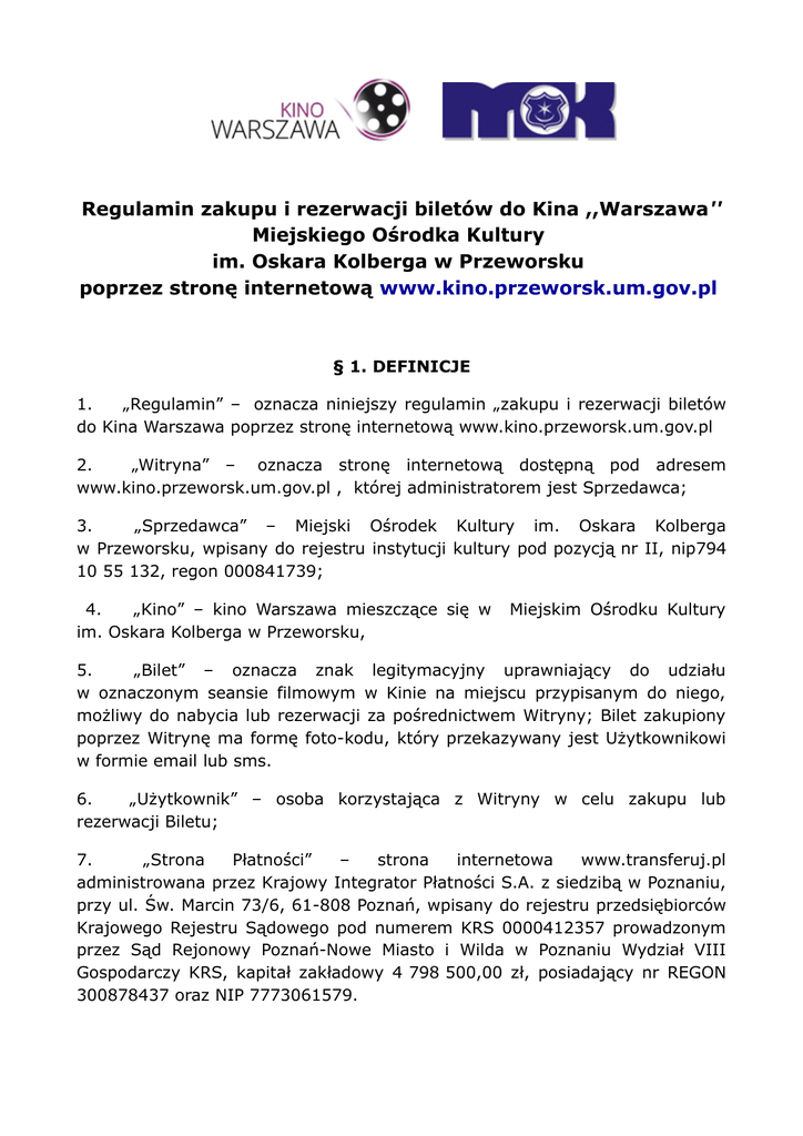 Regulamin zakupu i rezerwacji biletów do Kina ,,Warszawa'' Miejskiego Ośrodka Kultury im. Oskara Kolberga w Przeworsku poprzez stronę internetową www.kino.przeworsk.um.gov.pl § 1. DEFINICJE 1. „Regulamin” – oznacza niniejszy regulamin „zakupu i rezerwacji biletów do Kina Warszawa poprzez stronę internetową www.kino.przeworsk.um.gov.pl 2. „Witryna” – oznacza stronę internetową dostępną pod adresem www.kino.przeworsk.um.gov.pl , której administratorem jest Sprzedawca; 3. „Sprzedawca” – Miejski Ośrodek Kultury im. Oskara Kolberga w Przeworsku, wpisany do rejestru instytucji kultury pod pozycją nr II, nip794 10 55 132, regon 000841739; 4. „Kino” – kino Warszawa mieszczące się w im. Oskara Kolberga w Przeworsku, Miejskim Ośrodku Kultury 5. „Bilet” – oznacza znak legitymacyjny uprawniający do udziału w oznaczonym seansie filmowym w Kinie na miejscu przypisanym do niego, możliwy do nabycia lub rezerwacji za pośrednictwem Witryny; Bilet zakupiony poprzez Witrynę ma formę foto-kodu, który przekazywany jest Użytkownikowi w formie email lub sms. 6. „Użytkownik” – osoba korzystająca z Witryny w celu zakupu lub rezerwacji Biletu; 7. „Strona Płatności” – strona internetowa www.transferuj.pl administrowana przez Krajowy Integrator Płatności S.A. z siedzibą w Poznaniu, przy ul. Św. Marcin 73/6, 61-808 Poznań, wpisany do rejestru przedsiębiorców Krajowego Rejestru Sądowego pod numerem KRS 0000412357 prowadzonym przez Sąd Rejonowy Poznań-Nowe Miasto i Wilda w Poznaniu Wydział VIII Gospodarczy KRS, kapitał zakładowy 4 798 500,00 zł, posiadający nr REGON 300878437 oraz NIP 7773061579. § 2. POSTANOWIENIA OGÓLNE 1. Niniejszy Regulamin określa zasady zakupu Użytkowników Biletów za pośrednictwem Witryny. i rezerwacji przez 2. Użytkownik przyjmuje zobowiązanie do zapoznania się z treścią niniejszego Regulaminu przed zakupem lub rezerwacją Biletu za pośrednictwem Witryny. 3. Użytkownik jest zobowiązany do korzystania z Witryny oraz rezerwacji, zakupu oraz realizacji Biletów w sposób zgodny z Regulaminem i przepisami obowiązującego prawa. 4. Korzystanie z Witryny wymaga spełnienia następujących minimalnych warunków technicznych: a) oprogramowanie: dowolna przeglądarka internetowa obsługująca aplikację JavaScript, program umożliwiający podgląd i wydruk biletów zapisanych w formacie PDF. b) wymagania sprzętowe: komputer z dostępem do Internetu, procesor Pentium 233 Mhz lub lepszy, pamięć RAM: min 128 MB, karta wideo i monitor o rozdzielczości Super VGA (800 x 600) lub wyższej, § 3. ZŁOŻENIE ZAMÓWIENIA NA BILET 1. Zakup Biletu następuje poprzez złożenie za pomocą Witryny zamówienia na Bilet oraz dokonanie za pośrednictwem Strony Płatności zapłaty należności wynikającej z zamówienia, na zasadach określonych w Regulaminie. 2. Złożenie zamówienia możliwe jest poprzez kliknięcie w ikonę „ Kup bilet” przy wybranym wydarzeniu w zakładce ,,Repertuar''. Złożenie zamówienia następuje poprzez wykonanie w kolejnych podstronach Witryny następujących czynności: a) wybór ilości i rodzaju Biletów oraz przypisanych im miejsc na sali kinowej dla danego wydarzenia, b) złożenie zamówienia) potwierdzenia dokonanego zamówienia (podsumowanie c) podanie danych osobowych Użytkownika (imię, nazwisko, adres email, numer telefonu komórkowego) d) złożenie oświadczenia o akceptacji warunków niniejszego Regulaminu oraz oświadczeń związanych z przetwarzaniem danych osobowych Użytkownika o treści wskazanej na podstronie Witryny e) złożenie zamówienia poprzez kliknięcie w ikonę „Kup bilety” 3. Złożenie zamówienia powinno nastąpić nie później niż w terminie 5 minut od momentu zaznaczenia miejsc na sali kinowej, których ma dotyczyć Bilet. Upływ powyższego terminu powoduje wygaśnięcie Witryny i konieczność ponownego rozpoczęcia procedury składania zamówienia. 4. Użytkownik ma prawo zamówić Bilety na seanse filmowe z bieżącego repertuaru Kina, których sprzedaż umożliwi Sprzedawca za pośrednictwem Witryny. 5. Sprzedawcy przysługuje prawo do swobodnego decydowania o momencie rozpoczęcia i zakończenia sprzedaży Biletów na dany seans filmowy za pośrednictwem Witryny który może różnić się od okresu sprzedaży biletów w kasach Kina. Jeżeli Sprzedawca nie postanowi inaczej złożenie zamówienia będzie możliwe nie później niż na godzinę (60 minut) przed godziną rozpoczęcia seansu filmowego, którego dotyczyć ma zamawiany Bilet. 6. Użytkownik ma prawo do zamówienia nie więcej niż 10 Biletów w jednym zamówieniu. 7. Użytkownik zamawiając Bilet ulgowy przyjmuje do wiadomości i akceptuje, że jego realizacja w Kinie jest możliwa wyłącznie za okazaniem stosownego dokumentu potwierdzającego uprawnienie do ulgi. Sprzedawca zastrzega, że może odmówić zamiany Biletu na Bilet normalny lub zwrotu Biletu w przypadku nieokazania powyższych dokumentów. 8. Użytkownik, który złożył zamówienie otrzyma potwierdzenie jego przyjęcia w formie wiadomości email, która zostanie wysłana na adres podany podczas składania zamówienia. Potwierdzenie przyjęcia zamówienia zostanie wysłane w czasie 5 minut od otrzymania zamówienia przez Sprzedawcę. Potwierdzenie przyjęcia zamówienia będzie zawierać: a) dane seansu, na który obowiązywać ma Bilet tub Bilety (kino, data) b) dane zamówionego Biletu lub Biletów (rodzaj, cena) c) informację o kosztach transakcji za zakup Biletów d) informację o dodatkowych kosztach transakcji w przypadku wyboru opcji SMS e) numer transakcji f) termin płatności, po którego bezskutecznym upływie zamówienie zostanie anulowane 9. Koszt transakcji za zakup Biletów wskazany zostanie na podstronie Witryny podczas składania zamówienia oraz w potwierdzeniu przyjęcia zamówienia. Koszt transakcji w wysokości 0,50 złotych brutto pokrywa Użytkownik. § 4. PŁATNOŚCI 1. Płatnoś