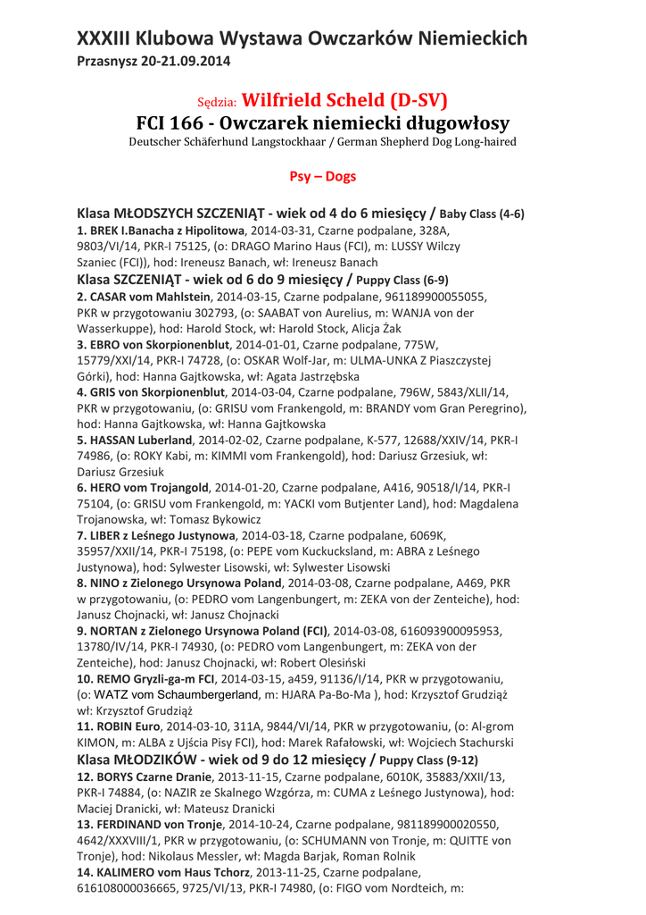 XXXIII Klubowa Wystawa Owczarków Niemieckich Przasnysz 20-21.09.2014 Wilfrield Scheld (D-SV) FCI 166 - Owczarek niemiecki długowłosy Sędzia: Deutscher Schäferhund Langstockhaar / German Shepherd Dog Long-haired Psy – Dogs Klasa MŁODSZYCH SZCZENIĄT - wiek od 4 do 6 miesięcy / Baby Class (4-6) 1. BREK I.Banacha z Hipolitowa, 2014-03-31, Czarne podpalane, 328A, 9803/VI/14, PKR-I 75125, (o: DRAGO Marino Haus (FCI), m: LUSSY Wilczy Szaniec (FCI)), hod: Ireneusz Banach, wł: Ireneusz Banach Klasa SZCZENIĄT - wiek od 6 do 9 miesięcy / Puppy Class (6-9) 2. CASAR vom Mahlstein, 2014-03-15, Czarne podpalane, 961189900055055, PKR w przygotowaniu 302793, (o: SAABAT von Aurelius, m: WANJA von der Wasserkuppe), hod: Harold Stock, wł: Harold Stock, Alicja Żak 3. EBRO von Skorpionenblut, 2014-01-01, Czarne podpalane, 775W, 15779/XXI/14, PKR-I 74728, (o: OSKAR Wolf-Jar, m: ULMA-UNKA Z Piaszczystej Górki), hod: Hanna Gajtkowska, wł: Agata Jastrzębska 4. GRIS von Skorpionenblut, 2014-03-04, Czarne podpalane, 796W, 5843/XLII/14, PKR w przygotowaniu, (o: GRISU vom Frankengold, m: BRANDY vom Gran Peregrino), hod: Hanna Gajtkowska, wł: Hanna Gajtkowska 5. HASSAN Luberland, 2014-02-02, Czarne podpalane, K-577, 12688/XXIV/14, PKR-I 74986, (o: ROKY Kabi, m: KIMMI vom Frankengold), hod: Dariusz Grzesiuk, wł: Dariusz Grzesiuk 6. HERO vom Trojangold, 2014-01-20, Czarne podpalane, A416, 90518/I/14, PKR-I 75104, (o: GRISU vom Frankengold, m: YACKI vom Butjenter Land), hod: Magdalena Trojanowska, wł: Tomasz Bykowicz 7. LIBER z Leśnego Justynowa, 2014-03-18, Czarne podpalane, 6069K, 35957/XXII/14, PKR-I 75198, (o: PEPE vom Kuckucksland, m: ABRA z Leśnego Justynowa), hod: Sylwester Lisowski, wł: Sylwester Lisowski 8. NINO z Zielonego Ursynowa Poland, 2014-03-08, Czarne podpalane, A469, PKR w przygotowaniu, (o: PEDRO vom Langenbungert, m: ZEKA von der Zenteiche), hod: Janusz Chojnacki, wł: Janusz Chojnacki 9. NORTAN z Zielonego Ursynowa Poland (FCI), 2014-03-08, 616093900095953, 13780/IV/14, PKR-I 74930, (o: PEDRO vom Langenbungert, m: ZEKA von der Zenteiche), hod: Janusz Chojnacki, wł: Robert Olesiński 10. REMO Gryzli-ga-m FCI, 2014-03-15, a459, 91136/I/14, PKR w przygotowaniu, (o: WATZ vom Schaumbergerland, m: HJARA Pa-Bo-Ma ), hod: Krzysztof Grudziąż wł: Krzysztof Grudziąż 11. ROBIN Euro, 2014-03-10, 311A, 9844/VI/14, PKR w przygotowaniu, (o: Al-grom KIMON, m: ALBA z Ujścia Pisy FCI), hod: Marek Rafałowski, wł: Wojciech Stachurski Klasa MŁODZIKÓW - wiek od 9 do 12 miesięcy / Puppy Class (9-12) 12. BORYS Czarne Dranie, 2013-11-15, Czarne podpalane, 6010K, 35883/XXII/13, PKR-I 74884, (o: NAZIR ze Skalnego Wzgórza, m: CUMA z Leśnego Justynowa), hod: Maciej Dranicki, wł: Mateusz Dranicki 13. FERDINAND von Tronje, 2014-10-24, Czarne podpalane, 981189900020550, 4642/XXXVIII/1, PKR w przygotowaniu, (o: SCHUMANN von Tronje, m: QUITTE von Tronje), hod: Nikolaus Messler, wł: Magda Barjak, Roman Rolnik 14. KALIMERO vom Haus Tchorz, 2013-11-25, Czarne podpalane, 616108000036665, 9725/VI/13, PKR-I 74980, (o: FIGO vom Nordteich, m: WARRINKA vom Haus Tchorz), hod: Mirosław Tchorz, wł: Alicja Żak 15. KOSMO vom Haus Tchorz, 2013-11-25, Czarne podpalane, 616108000036657, 28130/VII/13, PKR-I 74783, (o: FIGO vom Nordteich, m: WARRINKA vom Haus Tchorz), hod: Miroslaw Tchorz, wł: Miroslaw Tchorz, Dominika Bruch Klasa MŁODZIEŻY - wiek od 12 do 18 miesięcy / Youth Class (12-18) 16. BLACK JACK Urban Team, 2013-07-22, Wilczaste, 616093900039423, 6917/XXVII/13, PKR-I 73971, (o: YONATHAN Temperton, m: BJORK Liquido), hod: Bartosz Urbanik, wł: Joanna Janusz 17. BOSTON von Skorpionenblut, 2013-06-03, Czarne podpalane, 616009390010554, 5747/XLII/13, PKR-I 74444, (o: OSKAR Wolf-Jar, m: ZERAPHINA vom Zellwaldrand), hod: Hanna Gajtkowska, wł: Hanna Gajtkowska 18. CZECZEN Kleine Werder, 2013-03-24, Wilczaste, 001L, 13319/XIX/13, PKR-I 72930, (o: XAMBO Kalupus, m: Brawos Bis PLOTKA), hod: Jarosław Grenda, wł: Jarosław Grenda 19. KABASKO Mavic Poland, 2013-05-16, Czarne podpalane, 463S, 15626/XXI/13, PKR-I 73276, (o: ORION Mavic Poland, m: ANKA Mavic Poland), hod: Adrian Dobrzanski, wł: Marcin Tuzinkiewicz 20. KING z Zielonego Ursynowa Poland, 2013-05-07, Czarne podpalane, A163, 519/I/14, PKR-I 75295, (o: XAMBO Kalupus, m: RICKE von der Piste Trophe), hod: Janusz Chojnacki, wł: Nasser Naji 21. SOLO Eskorta, 2013-06-06, Czarne podpalane, A233, 89548/I/13, PKR-I 73450, (o: COUNT USTINOV van de Ybajo Hoeve, m: CANDY Eskorta), hod: Małgorzata Gietka, wł: Małgorzata Gietka Klasa JUNIORÓW - wiek od 18 do 24 miesiecy / Junior Class (18-24) 22. ALEX I.Banacha z Hipolitowa, 2013-02-13, Czarne podpalane, 108A, 9752/VI/13, PKR-I 74855, (o: FELIX vom Nordteich, m: LUSSY Wilczy Szaniec (FCI)), hod: Ireneusz Banach, wł: Ireneusz Banach 23. BASCO z Piorenu, 2012-12-02, 5865K, 35161/XXII/12, PKR-I -7225, (o: UMBERTO Tensor, m: CODI z Hetmanskiej Sfory), hod: Piotr Niedzielski, wł: Anna Lewandowska 24. ELOI vom Trompetersprung, 2013-03-15, Czarne podpalane, 981189900038075, 28089/VII/13, PKR-I 74257, (o: Conbhairean UNO, m: ODUSCHA vom Trompetersprung), hod: Hans-Ludger Goke, wł: Dorota Pikulska 25. ENZO vom Trojangold, 2012-12-31, Czarne podpalane, A042, 88894/I/12, PKR-I 72747, (o: ORION Mavic Poland, m: YACKI vom Butjenter Land), hod: Magdalena Trojanowska, wł: Dorota Dembowska 26. ESKO Mavic Poland, 2012-07-07, Czarne podpalane, 415S, 15/XXVIII/12, PKR-I 73727, (o: LEO Mavic Poland, m: MARIT v Haus Galli), hod: A.K. Dobrzanski, wł: Josef Bugos 27. HEKTOR z Zielonego Ursynowa Poland, 2013-02-01, Czarne podpalane, 967000009670307, 88950/I/13, PKR-I 72767, (o: XAMBO Kalupus, m: ZISKA von der Zenteiche), hod: Janusz Chojnacki, wł: Janusz Chojnacki 28. LEON Nova Jamina, 2012-10-14, Czarne podpalane, 66371, 12642/XXIV/12, PKR-I 72183, (o: LABO vom Schollweiher, m: GERTA Nova Jamina), hod: Milan Hulo, wł: Karol Trebnio 29. MERO Vom Cinderhof, 2013-02-07, Czarne podpalane, 981100002870329, 90832/I/13, PKR-I 753