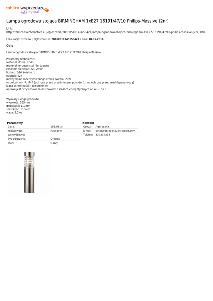 Lampa ogrodowa stojąca BIRMINGHAM 1xE27 16191/47/10 Philips-Massive (2nr) Link: http://tablica.tiointeractive.eu/ogloszenia/20160510145650421/lampa-ogrodowa-stojaca-birmingham-1xe27-16191/47/10-philips-massive-(2nr).html Lokalizacja: Rzeszów, | Ogłoszenie nr. 20160510145650421 z dnia: 10-05-2016 Opis Lampa ogrodowa stojąca BIRMINGHAM 1xE27 16191/47/10 Philips-Massive Parametry techniczne: materiał klosza: szkło materiał korpusu: stal nierdzewna zasilanie sieciowe: 220-240V liczba źródeł światła: 1 trzonek: E27 maksymalna moc wymiennego źródła światła: 20W współczynnik IP: IP44 (ochrona przed przedmiotami powyżej 1mm, ochrona przed rozchlapaną wodą) klasa ochronności: I (uziemienie) oprawa jest przystosowana do żarówek o klasach energetycznych od A++ do E Wymiary i waga produktu: wysokość: 395mm głębokość: 110mm szerokość: 110mm waga: 1,2kg Parametry Kontakt Cena: 158,99 zł Osoba: Agnieszka Miejscowość: Rzeszów E-mail: [email protected] Telefon: 537337333 Województwo: Typ ogłoszenia: Oferuję Stan: Nowy