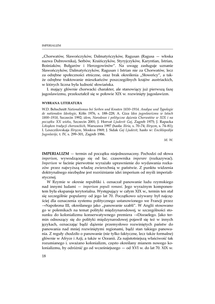 IMPERIALIZM „Chorwatów, Slawończyków, Dalmatyńczyków, Ragusan (Ragusa — włoska nazwa Dubrownika), Serbów, Kraińczyków, Styryjczyków, Karyntian, Istrian, Bośniaków, Bułgarów i Hercegowinów”. Na uwagę zasługuje uznanie Slawończyków, Dalmatyńczyków, Ragusan i Istrian nie za Chorwatów, lecz za odrębne społeczności etniczne, oraz brak określenia „Słoweńcy”, a także odrębne traktowanie mieszkańców poszczególnych krajów austriackich, w których liczna była ludność słowiańska. I. mający głównie chorwacki charakter, ale stanowiący już pierwszą fazę jugoslawizmu, przekształcił się w połowie XIX w. rozwinięty jugoslawizm. WYBRANA LITERATURA W.D. Behschni Nationalismus bei Serben und Kroaten 1830–1914. Analyse und Typologie de nationalen Ideologie, Köln 1976, s. 188–228; A. Giza Idea jugoslawizmu w latach 1800–1918, Szczecin 1992; idem, Narodowe i polityczne dążenia Chorwatów w XIX i na początku XX wieku, Szczecin 2001; J. Horvat Ljudevit Gaj, Zagreb 1975; J. Rapacka Leksykon tradycji chorwackich, Warszawa 1997 (hasła: Iliria, s. 70–74; Iliryzm, s. 74–81); I. Leszczilovskaja Iliryzm, Moskva 1969; J. Sidak Gaj Ljudevit, hasło w: Enciklopedija Jugoslavije, t. IV, s. 299–301, Zagreb 1986. M. W. IMPERIALIZM — termin od początku niejednoznaczny. Pochodzi od słowa imperium, wywodzącego się od łac. czasownika imperare (rozkazywać). Imperium w łacinie pierwotnie wyrażało uprawnienie do wydawania rozkazów przez najwyższą władzę zwierzchnią w państwie. Z punktu widzenia doktrynalnego niezbędne jest rozróżnianie idei imperium od myśli imperialistycznej. W Rzymie w okresie republiki i. oznaczał panowanie ludu rzymskiego nad innymi ludami — imperium populi romani. Jego wyraźnym komponentem była ekspansja terytorialna. Występujący w całym XIX w., termin ten stał się szczególnie popularny od jego lat 70. Początkowo używany był najczęściej dla oznaczenia systemu politycznego ustanowionego we Francji przez →Napoleona III, określanego jako „panowanie szabli”. W Anglii stosowano go w polemikach na temat polityki międzynarodowej, w szczególności stosunku do kolonializmu konserwatywnego premiera →Disraelego. Jako termin odnoszący się do polityki międzynarodowej pojawił się też w innych językach, oznaczając bądź dążenie przemysłowo rozwiniętych państw do panowania nad mniej rozwiniętymi regionami, bądź stan takiego panowania. Z reguły chodziło o panowanie (nie tylko faktyczne, lecz także formalne) głównie w Afryce i Azji, a także w Oceanii. Za najistotniejszą właściwość tak rozumianego i. uważano kolonializm, często określany mianem nowego kolonializmu, by odróżnić go od wcześniejszego — od XVI w. do lat 70. XIX w. 18 IMPERIALIZM Znamionowały go głównie następujące cechy: 1) jego obiektem stały się wszystkie obszary w Azji, Afryce i Oceanii, które nie były jeszcze posiadłościami któregoś z państw europejskich; 2) o opanowanie tych obszarów toczyła się ostra rywalizacja głównie między państwami zachodniej Europy, a także w pewnej mierze między Anglią a Rosją; 3) ponieważ obszarów takich było coraz mniej, nasilały się dążenia (przede wszystkim Niemiec) do nowego podziału kolonii, co powodowało wyścig zbrojeń i rozwój militaryzmu; 4) według przeważającej opinii jego główną bezpośrednią i pośrednią przyczyną były głębokie przemiany ekonomiczne. W publicystyce, a nawet w nauce, utrzymało się jednak także utożsamianie i. z wszelkimi dążeniami do ekspansji terytorialnej, a także określanie wszelkich takich dążeń występujących w dziejach jako i. Znany ekonomista austriacki -Niemiec →Joseph A. Schumpeter — twierdził w 1918 r., że ich przyczyną są psychiczne właściwości rządzących warstw, zwłaszcza arystokracji, ich irracjonalne skłonności wojownicze i predyspozycja do dokonywanej przemocą ekspansji. Jest on więc zjawiskiem spotykanym w różnych czasach, a nie wytworem pewnego stadium →kapitalizmu. Wprawdzie kapitał przemysłowy i bankowy może w pewnych okolicznościach przejawiać dążenia imperialistyczne, ale kapitalizm, będąc systemem racjonalnym, z natury swej jest antyimperialistyczny. Termin i. z czasem stawał się coraz bardziej wieloznaczny. Przyczyniały się do tego zwłaszcza dwie okoliczności: jego bardzo silny komponent ocenny, przybierający coraz bardziej pejoratywny charakter, oraz radykalne przemiany polityczne i ekonomiczne w skali światowej, zwłaszcza w stosunkach międzynarodowych. Nie nabrał on znaczenia czysto historycznego, odnoszącego się wyłącznie do przeszłości, także po zakończeniu procesu formalnej dekolonizacji. Jednak coraz częściej, zwłaszcza w ostatnich dziesięcioleciach, występuje obok niego termin „neoimperializm”. Od końca XIX w. i. stał się przedmiotem coraz bardziej intensywnych kontrowersji teoretycznych, ukształtowały się myśl proimperialistyczna i myśl antyimperialistyczna. Jednym z głównych obiektów sporów były motywy prowadzenia imperialistycznej polityki. Dopatrywano się ich w sferze ekonomicznej, we względach polityki wewnętrznej, w strategii militarnej i w czynnikach psychologicznych. Do wczesnych rzeczników polityki imperialistycznej należy profesor uniwersytetu w Cambridge John Robert Seeley, autor książki The expansion of England (London 1883). Mając na uwadze zwłaszcza opanowanie Indii, eksponował on motywy humanitarne i cywilizatorskie. Wskazywał też, że Anglia potrzebuje kolonii jako terenów osiedlania się jej szybko rosnącej ludności. Cecil Rhodes mówił w ostatnim dziesięcioleciu XIX w., że wielką ideą i. jest rozwiązanie problemu społecznego, więc „jeśli nie chcecie wojny domowej, musicie stać się imperialistami”. Podobną opinię wyrażało wielu rzeczników kolonializmu. 19 IMPERIALIZM W Niemczech do spotęgowania dążeń do posiadania kolonii znacznie pr