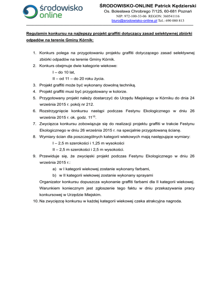 ŚRODOWISKO-ONLINE Patrick Kędzierski Os. Bolesława Chrobrego 7/125, 60-681 Poznań NIP: 972-100-33-06 REGON: 360541116 [email protected] Tel.: 690 080 813 _________________________________________________________________________________ Regulamin konkursu na najlepszy projekt graffiti dotyczący zasad selektywnej zbiórki odpadów na terenie Gminy Kórnik: 1. Konkurs polega na przygotowaniu projektu graffiti dotyczącego zasad selektywnej zbiórki odpadów na terenie Gminy Kórnik. 2. Konkurs obejmuje dwie kategorie wiekowe: I – do 10 lat, II – od 11 – do 20 roku życia. 3. Projekt graffiti może być wykonany dowolną techniką. 4. Projekt graffiti musi być przygotowany w kolorze. 5. Przygotowany projekt należy dostarczyć do Urzędu Miejskiego w Kórniku do dnia 24 września 2015 r. pokój nr 212. 6. Rozstrzygnięcie konkursu nastąpi podczas Festynu Ekologicznego w dniu 26 września 2015 r. ok. godz. 1115. 7. Zwycięzca konkursu zobowiązuje się do realizacji projektu graffiti w trakcie Festynu Ekologicznego w dniu 26 września 2015 r. na specjalnie przygotowaną ścianę. 8. Wymiary ścian dla poszczególnych kategorii wiekowych mają następujące wymiary: I – 2,5 m szerokości i 1,25 m wysokości II – 2,5 m szerokości i 2,5 m wysokości. 9. Przewiduje się, że zwycięski projekt podczas Festynu Ekologicznego w dniu 26 września 2015 r.: a) w I kategorii wiekowej zostanie wykonany farbami, b) w II kategorii wiekowej zostanie wykonany sprayami Organizator konkursu dopuszcza wykonanie graffiti farbami dla II kategorii wiekowej. Warunkiem koniecznym jest zgłoszenie tego faktu w dniu przekazywania pracy konkursowej w Urzędzie Miejskim. 10. Na zwycięzcę konkursu w każdej kategorii wiekowej czeka atrakcyjna nagroda. Regulamin konkursu na najlepszy komiks dotyczący zasad selektywnej zbiórki odpadów na terenie Gminy Kórnik: 1. Konkurs polega na przygotowaniu komiksu dotyczącego zasad selektywnej zbiórki odpadów na terenie Gminy Kórnik. 2. Konkurs obejmuje dwie kategorie wiekowe: I – do 10 lat, II – od 11 – do 20 roku życia. 3. Komiks musi być przygotowany w kolorze. 4. Przygotowany projekt należy dostarczyć do Urzędu Miejskiego w Kórniku do dnia 24 września 2015 r. pokój nr 212. 5. Rozstrzygnięcie konkursu nastąpi podczas Festynu Ekologicznego w dniu 26 września 2015 r. ok. godz. 1115. 6. Na zwycięzcę konkursu w każdej kategorii wiekowej czeka atrakcyjna nagroda.