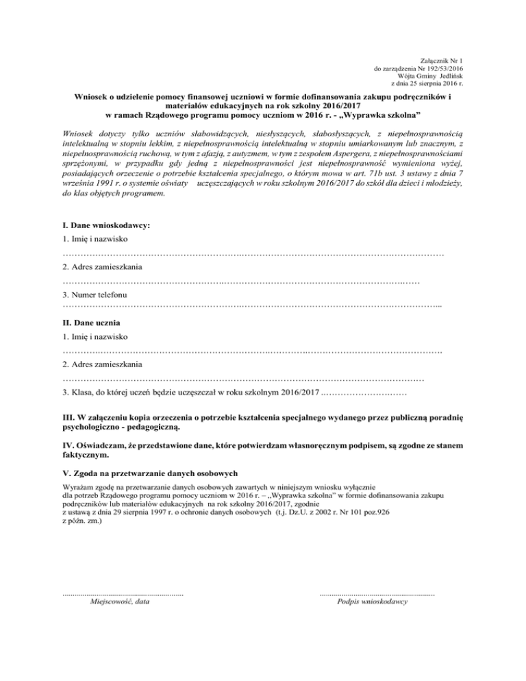 Załącznik Nr 1 do zarządzenia Nr 192/53/2016 Wójta Gminy Jedlińsk z dnia 25 sierpnia 2016 r. Wniosek o udzielenie pomocy finansowej uczniowi w formie dofinansowania zakupu podręczników i materiałów edukacyjnych na rok szkolny 2016/2017 w ramach Rządowego programu pomocy uczniom w 2016 r. - „Wyprawka szkolna” Wniosek dotyczy tylko uczniów słabowidzących, niesłyszących, słabosłyszących, z niepełnosprawnością intelektualną w stopniu lekkim, z niepełnosprawnością intelektualną w stopniu umiarkowanym lub znacznym, z niepełnosprawnością ruchową, w tym z afazją, z autyzmem, w tym z zespołem Aspergera, z niepełnosprawnościami sprzężonymi, w przypadku gdy jedną z niepełnosprawności jest niepełnosprawność wymieniona wyżej, posiadających orzeczenie o potrzebie kształcenia specjalnego, o którym mowa w art. 71b ust. 3 ustawy z dnia 7 września 1991 r. o systemie oświaty uczęszczających w roku szkolnym 2016/2017 do szkół dla dzieci i młodzieży, do klas objętych programem. I. Dane wnioskodawcy: 1. Imię i nazwisko …………………………………………………….…………………………………………………………… 2. Adres zamieszkania ……………………………………………….…………………………………………………….…… 3. Numer telefonu …………………………………………………….…………………………………………………………... II. Dane ucznia 1. Imię i nazwisko ………….………………………………………………….………….………………………………………. 2. Adres zamieszkania …………………………………………………………………………………………………………… 3. Klasa, do której uczeń będzie uczęszczał w roku szkolnym 2016/2017 ..………………….…… III. W załączeniu kopia orzeczenia o potrzebie kształcenia specjalnego wydanego przez publiczną poradnię psychologiczno - pedagogiczną. IV. Oświadczam, że przedstawione dane, które potwierdzam własnoręcznym podpisem, są zgodne ze stanem faktycznym. V. Zgoda na przetwarzanie danych osobowych Wyrażam zgodę na przetwarzanie danych osobowych zawartych w niniejszym wniosku wyłącznie dla potrzeb Rządowego programu pomocy uczniom w 2016 r. – „Wyprawka szkolna” w formie dofinansowania zakupu podręczników lub materiałów edukacyjnych na rok szkolny 2016/2017, zgodnie z ustawą z dnia 29 sierpnia 1997 r. o ochronie danych osobowych (t.j. Dz.U. z 2002 r. Nr 101 poz.926 z późn. zm.) ............................................................. Miejscowość, data .......................................................... Podpis wnioskodawcy