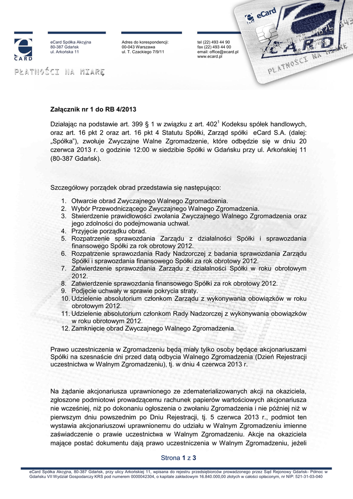 eCard Spółka Akcyjna 80-387 Gdańsk ul. Arkońska 11 Adres do korespondencji: 00-043 Warszawa ul. T. Czackiego 7/9/11 tel (22) 493 44 90 fax (22) 493 44 00 email: [email protected] www.ecard.pl Załącznik nr 1 do RB 4/2013 Działając na podstawie art. 399 § 1 w związku z art. 4021 Kodeksu spółek handlowych, oraz art. 16 pkt 2 oraz art. 16 pkt 4 Statutu Spółki, Zarząd spółki eCard S.A. (dalej: „Spółka”), zwołuje Zwyczajne Walne Zgromadzenie, które odbędzie się w dniu 20 czerwca 2013 r. o godzinie 12:00 w siedzibie Spółki w Gdańsku przy ul. Arkońskiej 11 (80-387 Gdańsk). Szczegółowy porządek obrad przedstawia się następująco: 1. Otwarcie obrad Zwyczajnego Walnego Zgromadzenia. 2. Wybór Przewodniczącego Zwyczajnego Walnego Zgromadzenia. 3. Stwierdzenie prawidłowości zwołania Zwyczajnego Walnego Zgromadzenia oraz jego zdolności do podejmowania uchwał. 4. Przyjęcie porządku obrad. 5. Rozpatrzenie sprawozdania Zarządu z działalności Spółki i sprawozdania finansowego Spółki za rok obrotowy 2012. 6. Rozpatrzenie sprawozdania Rady Nadzorczej z badania sprawozdania Zarządu Spółki i sprawozdania finansowego Spółki za rok obrotowy 2012. 7. Zatwierdzenie sprawozdania Zarządu z działalności Spółki w roku obrotowym 2012. 8. Zatwierdzenie sprawozdania finansowego Spółki za rok obrotowy 2012. 9. Podjęcie uchwały w sprawie pokrycia straty. 10. Udzielenie absolutorium członkom Zarządu z wykonywania obowiązków w roku obrotowym 2012. 11. Udzielenie absolutorium członkom Rady Nadzorczej z wykonywania obowiązków w roku obrotowym 2012. 12. Zamknięcie obrad Zwyczajnego Walnego Zgromadzenia. Prawo uczestniczenia w Zgromadzeniu będą miały tylko osoby będące akcjonariuszami Spółki na szesnaście dni przed datą odbycia Walnego Zgromadzenia (Dzień Rejestracji uczestnictwa w Walnym Zgromadzeniu), tj. w dniu 4 czerwca 2013 r. Na żądanie akcjonariusza uprawnionego ze zdematerializowanych akcji na okaziciela, zgłoszone podmiotowi prowadzącemu rachunek papierów wartościowych akcjonariusza nie wcześniej, niż po dokonaniu ogłoszenia o zwołaniu Zgromadzenia i nie później niż w pierwszym dniu powszednim po Dniu Rejestracji, tj. 5 czerwca 2013 r., podmiot ten wystawia akcjonariuszowi uprawnionemu do udziału w Walnym Zgromadzeniu imienne zaświadczenie o prawie uczestnictwa w Walnym Zgromadzeniu. Akcje na okaziciela mające postać dokumentu dają prawo uczestniczenia w Walnym Zgromadzeniu, jeżeli Strona 1 z 3 eCard Spółka Akcyjna, 80-387 Gdańsk, przy ulicy Arkońskiej 11, wpisana do rejestru przedsiębiorców prowadzonego przez Sąd Rejonowy Gdańsk- Północ w Gdańsku VII Wydział Gospodarczy KRS pod numerem 0000042304, o kapitale zakładowym 16.840.000,00 złotych w całości opłaconym, nr NIP: 521-31-03-040 eCard Spółka Akcyjna 80-387 Gdańsk ul. Arkońska 11 Adres do korespondencji: 00-043 Warszawa ul. T. Czackiego 7/9/11 tel (22) 493 44 90 fax (22) 493 44 00 email: [email protected] www.ecard.pl dokumenty akcji, lub zaświadczenie wydane na dowód złożenia akcji u notariusza, w banku lub firmie inwestycyjnej, zostaną złożone w Spółce nie później niż w Dniu Rejestracji uczestnictwa w Walnym Zgromadzeniu i nie będą odebrane przed zakończeniem tego dnia. Lista akcjonariuszy uprawnionych do uczestnictwa w Walnym Zgromadzeniu, wraz ze wskazaniem liczby głosów i akcji im przysługujących, będzie wyłożona w lokalu Zarządu przy ul. Arkońskiej 11 w Gdańsku na trzy dni powszednie przed odbyciem Walnego Zgromadzenia. Akcjonariusze mogą przeglądać listę akcjonariuszy w lokalu Zarządu oraz żądać odpisu listy za zwrotem kosztów jego sporządzenia. Akcjonariusz uprawniony do udziału w Walnym Zgromadzeniu może przenosić akcje w okresie między wyżej określonym Dniem Rejestracji uczestnictwa w Zgromadzeniu, tj. począwszy od dnia 5 czerwca 2013 roku, do dnia zakończenia Walnego Zgromadzenia. Akcjonariusz lub akcjonariusze reprezentujący co najmniej jedną dwudziestą kapitału zakładowego mogą żądać najpóźniej do dnia 30 maja 2013 roku umieszczenia określonych spraw w porządku obrad Walnego Zgromadzenia. Żądanie może zostać złożone na piśmie, faksem lub w pocztą elektroniczną i powinno zawierać uzasadnienie lub projekt uchwały dotyczącej proponowanego punktu porządku obrad. Akcjonariusz lub akcjonariusze reprezentujący co najmniej jedną dwudziestą kapitału zakładowego mogą przed terminem Walnego Zgromadzenia zgłaszać spółce na piśmie, faksem lub pocztą elektroniczną projekty uchwał dotyczące spraw wprowadzonych do porządku obrad Zgromadzenia lub spraw, które mają zostać wprowadzone do porządku obrad. Spółka niezwłocznie będzie ogłaszała projekty uchwał na swojej stronie internetowej www.ecard.pl. Do oświadczeń i wniosków składanych na piśmie, faksem lub pocztą elektroniczną należy dołączyć kserokopię lub skan zaświadczenia podmiotu lub podmiotów prowadzących rachunek lub rachunki papierów wartościowych akcjonariusza potwierdzające liczbę posiadanych przezeń akcji. Każdy z akcjonariuszy może podczas Walnego Zgromadzenia zgłaszać projekty uchwał dotyczące spraw wprowadzonych do porządku obrad. Strona 2 z 3 eCard Spółka Akcyjna, 80-387 Gdańsk, przy ulicy Arkońskiej 11, wpisana do rejestru przedsiębiorców prowadzonego przez Sąd Rejonowy Gdańsk- Północ w Gdańsku VII Wydział Gospodarczy KRS pod numerem 0000042304, o kapitale zakładowym 16.840.000,00 złotych w całości opłaconym, nr NIP: 521-31-03-040 eCard Spółka Akcyjna 80-387 Gdańsk ul. Arkońska 11 Adres do korespondencji: 00-043 Warszawa ul. T. Czackiego 7/9/11 tel (22) 493 44 90 fax (22) 493 44 00 email: [email protected] www.ecard.pl Akcjonariusze mogą uczestniczyć w Walnym Zgromadzeniu, w tym wykonywać prawo głosu, osobiście lub przez pełnomocnika. Pełnomocnictwo do uczestniczenia w Walnym Zgromadzeniu i wykonywania prawa głosu wymaga udzielenia na