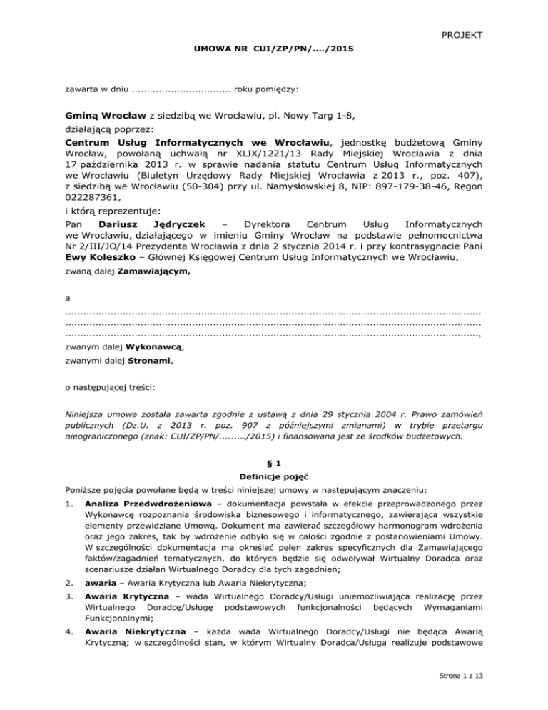 PROJEKT UMOWA NR CUI/ZP/PN/..../2015 zawarta w dniu ................................. roku pomiędzy: Gminą Wrocław z siedzibą we Wrocławiu, pl. Nowy Targ 1-8, działającą poprzez: Centrum Usług Informatycznych we Wrocławiu, jednostkę budżetową Gminy Wrocław, powołaną uchwałą nr XLIX/1221/13 Rady Miejskiej Wrocławia z dnia 17 października 2013 r. w sprawie nadania statutu Centrum Usług Informatycznych we Wrocławiu (Biuletyn Urzędowy Rady Miejskiej Wrocławia z 2013 r., poz. 407), z siedzibą we Wrocławiu (50-304) przy ul. Namysłowskiej 8, NIP: 897-179-38-46, Regon 022287361, i którą reprezentuje: Pan Dariusz Jędryczek – Dyrektora Centrum Usług Informatycznych we Wrocławiu, działającego w imieniu Gminy Wrocław na podstawie pełnomocnictwa Nr 2/III/JO/14 Prezydenta Wrocławia z dnia 2 stycznia 2014 r. i przy kontrasygnacie Pani Ewy Koleszko – Głównej Księgowej Centrum Usług Informatycznych we Wrocławiu, zwaną dalej Zamawiającym, a .......................................................................................................................................... .......................................................................................................................................... ........................................................................................................................................., zwanym dalej Wykonawcą, zwanymi dalej Stronami, o następującej treści: Niniejsza umowa została zawarta zgodnie z ustawą z dnia 29 stycznia 2004 r. Prawo zamówień publicznych (Dz.U. z 2013 r. poz. 907 z późniejszymi zmianami) w trybie przetargu nieograniczonego (znak: CUI/ZP/PN/........./2015) i finansowana jest ze środków budżetowych. §1 Definicje pojęć Poniższe pojęcia powołane będą w treści niniejszej umowy w następującym znaczeniu: 1. Analiza Przedwdrożeniowa – dokumentacja powstała w efekcie przeprowadzonego przez Wykonawcę rozpoznania środowiska biznesowego i informatycznego, zawierająca wszystkie elementy przewidziane Umową. Dokument ma zawierać szczegółowy harmonogram wdrożenia oraz jego zakres, tak by wdrożenie odbyło się w całości zgodnie z postanowieniami Umowy. W szczególności dokumentacja ma określać pełen zakres specyficznych dla Zamawiającego faktów/zagadnień tematycznych, do których będzie się odwoływał Wirtualny Doradca oraz scenariusze działań Wirtualnego Doradcy dla tych zagadnień; 2. awaria – Awaria Krytyczna lub Awaria Niekrytyczna; 3. Awaria Krytyczna – wada Wirtualnego Doradcy/Usługi uniemożliwiająca realizację przez Wirtualnego Doradcę/Usługę podstawowych funkcjonalności będących Wymaganiami Funkcjonalnymi; 4. Awaria Niekrytyczna – każda wada Wirtualnego Doradcy/Usługi nie będąca Awarią Krytyczną; w szczególności stan, w którym Wirtualny Doradca/Usługa realizuje podstawowe Strona 1 z 13 PROJEKT funkcjonalności, lecz może pracować z mniejszą wydajnością, z wykorzystaniem rozwiązań zastępczych zaproponowanych przez Wykonawcę; 5. awatar – graficzna prezentacja postaci Wirtualnego Doradcy (wizerunek postaci); 6. Baza Wiedzy – połączona Baza Wiedzy Ogólnej i Specjalistycznej; 7. Baza Wiedzy Ogólnej – bogaty zbiór ogólnych zagadnień tematycznych do których będzie odnosił się Wirtualny Doradca; 8. Baza Wiedzy Specjalistycznej – zbiór specyficznych dla Zamawiającego zagadnień tematycznych, do których będzie się odnosił Wirtualny Doradca, stworzony w oparciu o przeprowadzoną u Zamawiającego Analizę Przedwdrożeniową; 9. całkowite wynagrodzenie umowne brutto – wynagrodzenie, o którym mowa w § 15 ust. 1 zd. 1 Umowy; 10. dni robocze – przez dni robocze rozumie się dni od poniedziałku do piątku z wyłączeniem dni w Polsce ustawowo wolnych od pracy; 11. fakt – pojedynczy zapis w Bazie Wiedzy zawierający treść odpowiedzi, którą udziela Wirtualny Doradca; fakty są skojarzone z pytaniami, słowami kluczowymi, adresami stron i innymi informacjami w zależności od zastosowanego rozwiązania informatycznego i potrzeb Zamawiającego; 12. HelpDesk – system informatyczny działający u Zamawiającego, za pośrednictwem którego Zamawiający będzie zgłaszał wszystkie awarie i uwagi do działania Systemu. Wykonawca będzie miał wgląd do systemu HelpDesk i będzie realizował zadania w nim zgłoszone; 13. Licencja – prawo korzystania z Wirtualnego Doradcy; 14. Odbiór Końcowy – odbiór realizacji przez System funkcjonalności będących Wymaganiami Funkcjonalnymi; 15. Panel Administracyjny – narzędzie administracyjne Wirtualnego Doradcy umożliwiające bieżącą kontrolę pracy programu poprzez podgląd zapisów rozmów, przegląd statystyk, raportowanie a także edycję Bazy Wiedzy (dodawanie, modyfikacja, usuwanie faktów). 16. Projekt – całokształt prac podjętych przez Wykonawcę i Zamawiającego, których celem jest wdrożenie i uruchomienie Wirtualnego Doradcy zgodnie z postanowieniami Umowy; 17. Protokół Odbioru – protokół, który po podpisaniu bez zastrzeżeń przez upoważnionych przedstawicieli obu Stron, stanowi potwierdzenie wykonania prac w nim określonych; 18. Protokół Odbioru Końcowego – formalne pisemne przyjęcie przez Zamawiającego realizacji przez Wirtualnego Doradcę funkcjonalności będących Wymaganiami Funkcjonalnymi; 19. Reklamacja – żądanie ponownego rozpatrzenia zadania wcześniej zgłoszonego w systemie HelpDesk i rozwiązanego przez Wykonawcę – w sytuacji, gdy podane rozwiązanie nie jest wystarczające dla Zamawiającego; 20. Serwis lub Serwis Gwarancyjny – serwis prowadzony na warunkach opisanych Załączniku nr 2; 21. Umowa – niniejsza umowa; 22. Usługa – usługa informacyjna realizowana przez Wykonawcę w oparciu o Wirtualnego Doradcę; 23. Utrzymanie lub Utrzymanie Usługi – całość prac realizowanych przez Wykonawcę w celu zapewnienia poprawnego działania Usługi w sposób nieprzerwany, w 