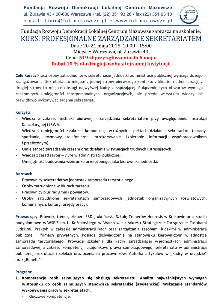 Fundacja Rozwoju Demokracji Lokalnej Centrum Mazowsze zaprasza na szkolenie: KURS: PROFESJONALNE ZARZĄDZANIE SEKRETARIATEM Data: 20-21 maja 2015, 10:00 - 15:00 Miejsce: Warszawa, ul. Żurawia 43 Cena: 519 zł przy zgłoszeniu do 6 maja. Rabat 10 % dla drugiej osoby z tej samej Instytucji. Cele kursu: Praca osoby zatrudnionej w sekretariacie jednostki administracji publicznej wymaga dużego zaangażowania. Sekretariat to miejsce z jednej strony pierwszego kontaktu z klientem administracji, z drugiej strony to miejsce obsługi najwyższej kadry zarządzającej. Połączenie tych obszarów wymaga znakomitych umiejętności interpersonalnych, organizacyjnych, ale przede wszystkim wiedzy jak prawidłowo wykonywać zadania sekretariatu. Korzyści: - Wiedza z zakresu techniki biurowej i zarządzania sekretariatem przy uwzględnieniu Instrukcji Kancelaryjnej i JRWA. - Wiedza i umiejętności z zakresu komunikacji w różnych aspektach działania sekretariatu (narady, spotkania, rozmowy telefoniczne, przekazywanie i zbieranie informacji współpracownikom i przełożonym). - Umiejętność zarządzania czasem oraz działania w sytuacjach trudnych i stresujących. - Wiedza z zasad savoir – vivre w administracji publicznej. - Umiejętność budowania wizerunku przełożonego, jako kierownika jednostki. Adresaci: - Pracownicy sekretariatów jednostek samorządu terytorialnego. - Osoby zatrudnione w biurach zarządu. - Pracownicy biur rad gmin i powiatów. - Osoby zatrudnione sekretariatach samorządowych jednostek organizacyjnych komunalnych, kultury, urzędy pracy). (oświatowych, Prowadzący: Prawnik, trener, ekspert FRDL, ukończyła Szkołę Trenerów Heuresis w Krakowie oraz studia podyplomowe w WSPiZ im. L. Koźmińskiego w Warszawie z zakresu Strategiczne Zarządzanie Zasobami Ludzkimi. Praktyk w zakresie administracji kadr oraz zarządzania zasobami ludzkimi w administracji publicznej i firmach prywatnych. Posiada doświadczenie na stanowisku kierowniczym w jednostce samorządu terytorialnego. Prowadzi szkolenia dla kadry zarządzającej w jednostkach administracji samorządowej z zakresu kompetencji urzędników, prawa samorządowego, sekretariatu w administracji publicznej, rekrutacji i selekcji oraz oceniania pracowników. Autorka artykułów w „Kadry w urzędzie” oraz „Benefit”. Program: 1. Kompetencje osób zajmujących się obsługą sekretariatu. Analiza najważniejszych wymagań w stosunku do osób zajmujących stanowiska sekretarskie (asystenckie). Wskazanie standardów wykonywania pracy w sekretariatach. - Kluczowe kompetencje. 2. 3. 4. 5. 3. - Rola i funkcja sekretariatu. Komunikacja werbalna i pozawerbalna: Moduł, w którym zostaną poruszone najważniejsze elementy sprawnej komunikacji interpersonalnej. W trakcie tej części podczas pracy w grupach, parach i indywidualnie uczestnicy nabędą umiejętności w zakresie słuchania, dopytywania oraz formułowania precyzyjnych wypowiedzi. - Aktywne słuchanie, precyzyjne formułowanie wypowiedzi, informacje zwrotne do współpracowników i klientów. - Komunikacja pozawerbalna - dlaczego taka ważna? - Błędy i bariery komunikacyjne, na co należy uważać, czego unikać. Technika biurowa tradycyjna oraz prowadzenie korespondencji e - mailowej: W tym module zostaną omówione najważniejsze zagadnienia prawidłowego prowadzenia korespondencji danej instytucji. - Jak napisać dobre pismo? - Rodzaje pism. - Zasady redagowania pism. - Elementy składowe pisma. - Części pisma. - Protokoły, sprawozdania, notatki. - Instrukcja kancelaryjna, obieg korespondencji. - Jak poprawnie konstruować wiadomości e – mailowe? Zarządzanie czasem: Czas to najcenniejszy element pracy w sekretariacie, od umiejętności zarządzania nim zależy bardzo często dobra organizacja całej instytucji. W tym module uczestnicy dowiedzą się jak planować swój czas pracy oraz jak nadzorować - monitorować czas pracy przełożonych. - Gdzie gubię cenny czas? Organizacja pracy własnej i biura. - Sprawy pilne, ważne, nieważne i mniej pilne. - Zarządzanie pocztą elektroniczną i tradycyjną, delegowanie zadań do komórek merytorycznych, elektroniczny kalendarz przełożonych. - Jak pracować, gdy większość działań jest nieplanowanych? Savoir – vivre: Część szkolenia poświęcona budowaniu wizerunku danej instytucji, poprzez prawidłowe przygotowanie spotkań z uszanowaniem należnego miejsca dla gości i gospodarzy. Uczestnicy dowiedzą się jak profesjonalne załatwienie spraw, ubiór, sposób prowadzenia rozmów telefonicznych, zachowanie uprzejmości w codziennej pracy wpływają na pozytywny odbiór administracji publicznej. - Etykieta administracji publicznej z uwzględnieniem ubioru. - Powitanie, dbanie o dobry wizerunek instytucji. - Rozmowy telefoniczne. - Precedencja – hierarchia stanowisk i funkcji. - Organizacja spotkań z osobami o różnym statusie społecznym. Trudne sytuacje w pracy sekretariatu, czyli jak zmierzyć się z codziennymi wyzwaniami stawianymi przed osobami zatrudnionymi w sekretariatach, jak asertywnie reagować na zastrzeżenia klientów i radzić sobie w trudnych sytuacjach: - Jak radzić sobie z emocjami w stresujących sytuacjach? - Trudni ludzie czy trudne zadania? - Asertywność w pracy. ZGŁOSZENIE KURS: PROFESJONALNE ZARZĄDZANIE SEKRETARIATEM Data: 20-21 maja 2015, 10:00 - 15:00 Miejsce: Warszawa, ul. Żurawia 43 Cena: 519 zł przy zgłoszeniu do 6 maja. Rabat 10 % dla drugiej osoby z tej samej Instytucji. Instytucja (dane do faktury): ................................................................................................ Adres: ................................................................................................................................. NIP: ..................................................................................................................................... L.p. Imię i nazwisko Wydział tel. e-mail 1............................................