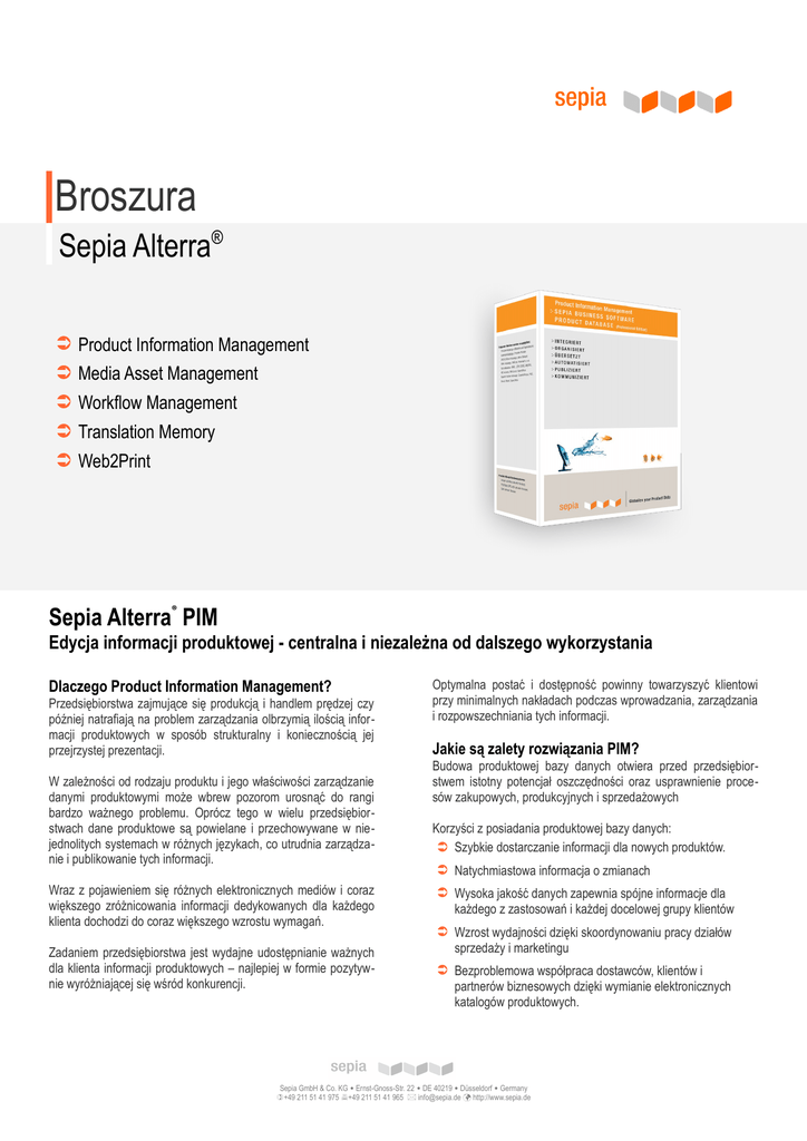 Broszura Sepia Alterra® Product Information Management Media Asset Management Workflow Management Translation Memory Web2Print Sepia Alterra® PIM Edycja informacji produktowej - centralna i niezależna od dalszego wykorzystania Dlaczego Product Information Management? Przedsiębiorstwa zajmujące się produkcją i handlem prędzej czy później natrafiają na problem zarządzania olbrzymią ilością informacji produktowych w sposób strukturalny i koniecznością jej przejrzystej prezentacji. W zależności od rodzaju produktu i jego właściwości zarządzanie danymi produktowymi może wbrew pozorom urosnąć do rangi bardzo ważnego problemu. Oprócz tego w wielu przedsiębiorstwach dane produktowe są powielane i przechowywane w niejednolitych systemach w różnych językach, co utrudnia zarządzanie i publikowanie tych informacji. Wraz z pojawieniem się różnych elektronicznych mediów i coraz większego zróżnicowania informacji dedykowanych dla każdego klienta dochodzi do coraz większego wzrostu wymagań. Zadaniem przedsiębiorstwa jest wydajne udostępnianie ważnych dla klienta informacji produktowych – najlepiej w formie pozytywnie wyróżniającej się wśród konkurencji. Optymalna postać i dostępność powinny towarzyszyć klientowi przy minimalnych nakładach podczas wprowadzania, zarządzania i rozpowszechniania tych informacji. Jakie są zalety rozwiązania PIM? Budowa produktowej bazy danych otwiera przed przedsiębiorstwem istotny potencjał oszczędności oraz usprawnienie procesów zakupowych, produkcyjnych i sprzedażowych Korzyści z posiadania produktowej bazy danych: Szybkie dostarczanie informacji dla nowych produktów. Natychmiastowa informacja o zmianach Wysoka jakość danych zapewnia spójne informacje dla każdego z zastosowań i każdej docelowej grupy klientów Wzrost wydajności dzięki skoordynowaniu pracy działów sprzedaży i marketingu Bezproblemowa współpraca dostawców, klientów i partnerów biznesowych dzięki wymianie elektronicznych katalogów produktowych. Sepia GmbH & Co. KG • Ernst-Gnoss-Str. 22 • DE 40219 • Düsseldorf • Germany +49 211 51 41 975 +49 211 51 41 965 [email protected] http://www.sepia.de Tworzenie drukowanych publikacji w oparciu o bazę danych redukuje czas i koszty. Szybkie wdrożenie bazujące na rozbudowanych podstawowych funkcjach, łatwej konfiguracji i integracji. Dzięki internetowej architekturze bezproblemowy i niezależny od miejsca dostęp do wszystkich zapisanych w bazie informacji. Rozwiązaniem jest Sepia Alterra PIM Rodzina produktów Sepia z Sepia Alterra PIM na czele oferuje platformę programową do zarządzania informacją produktową i katalogową. Centralne zarządzanie informacją produktową Sercem Sepia Alterra Product Information Management jest scentralizowane, neutralne medialnie zarządzanie danymi produktowymi. Baza danych produktowych synchronizuje się przy tym z częściowymi zasobami w innych systemach (np. ERP) w celu zagwarantowania jednolitego stanu informacji w całym przedsiębiorstwie. Z drugiej strony udostępnia dalej informacje produktowe w ulepszonej formie celem wykorzystania w różnych zastosowaniach. Może to być na przykład e-commerce, strona internetowa, prezentacja na cd-rom lub wydruk katalogów. Dynamiczne struktury informacji Aby zapewnić wyszukiwanie i prezentowanie powiązań między informacjami produktowymi, niezbędna jest możliwość dynamicznej strukturyzacji tych informacji. Schemat funkcjonowania Sepia Alterra PIM Platforma ta umożliwia scentralizowaną organizację strukturalnych informacji produktowych i dzięki wydajnym modułom spełniają następujące zadania: Centralne zarządzanie informacją produktową Import i synchronizacja danych podstawowych z systemów ERP takich jak:SAP, MS Dynamics ERP/CRM, Sage Elastyczna struktura informacji Drzewo produktowe Sepia Alterra PIM oferuje możliwość wielowymiarowej strukturyzacji zasobów danych. Jest to możliwe dzięki obiektowej architekturze wewnętrznego zarządzania informacją. Wersjonowanie Zarządzanie klasyfikacjami Wersjonowanie Rozbudowane funkcje wyszukiwania Zarządzanie dokumentami i materiałem zdjęciowym Zarządzanie tłumaczeniami Workflow-Management Poprzez świetnie dopracowane mechanizmy punktów przywracania (snapshots) oraz zarządzanie wersjami można uzyskać dostęp zarówno do wcześniejszy wersji poszczególnych danych produktowych jak również ad hoc do wcześniejszych wersji całego zasobu danych. Wpływa to korzystnie na szybsze usuwanie błędów oraz przywracania wcześniejszych właściwości produktów (re-staging). Zarządzanie klasyfikacjami Konfiguracji aplikacji poprzez XML Klasyfikowanie danych produktowych pomaga przy przyporządkowaniu informacji Państwa produktów w systemach: e-commerce, portalach zakupowych i innych mediach elektronicznych. Dostęp poprzez przeglądarkę internetową Zarządzanie podmiotami i użytkownikami Automatyczna produkcja katalogów drukowanych Sepia GmbH & Co. KG • Ernst-Gnoss-Str. 22 • DE 40219 • Düsseldorf • Germany +49 211 51 41 975 +49 211 51 41 965 [email protected] http://www.sepia.de PIM-Software firmy Sepia wspiera najważniejsze międzynarodowe systemy klasyfikacji danych produktowych. Z poziomu intuicyjnego panelu użytkownika dla każdego produktu można podać kryteria określone przez dany system klasyfikacyjny. Obecnie rozwiązanie Sepia wspiera systemy eClass, ETIM, Proficlass i UNSPSC. Zarządzanie dokumentami i plikami graficznymi Katalogi poprzez Adobe InDesign Poza tym formaty te można tworzyć selektywnie. Oznacza to, że poszczególne media są definiowane w systemie, produkty przyporządkowywane do tych mediów a następnie publikowane zgodnie z tym przyporządkowaniem. W ten sposób dane produktowe są dostępne dla klientów i kontrahentów w każdej aktualizowanej na bieżąco formie. Rozwiązanie Sepia PIM dysponuje rozbudowanym systemem zapisywania, wzbogacania, przyporządkowywan