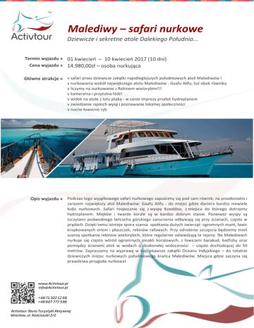 Malediwy – safari nurkowe Dziewicze i sekretne atole Dalekiego Południa... Termin wyjazdu » 01 kwiecień – 10 kwiecień 2017 (10 dni) Cena wyjazdu » 14.980,00zł – osoba nurkująca Główne atrakcje » v safari przez dziewicze zakątki najodleglejszych południowych atoli Malediwów ! v nurkowania wokół największego atolu Malediwów - Gaafu Alifu, tuż obok równika v liczymy na nurkowanie z Rekinem wielorybim!!! v kameralna i przytulna łódź! v widok na atole z lotu ptaka - w cenie imprezy przelot hydroplanem v zwiedzanie rajskich wysp i poznawanie lokalnej społeczności v nocne łowienie ryb Opis wyjazdu » Podczas tego wyjątkowego safari nurkowego zapuścimy się pod sam równik; na przedostatni i zarazem największy atol Malediwów: Gaafu Alifu - do miejsc gdzie dociera bardzo niewiele łodzi nurkowych. Safari rozpocznie się z wyspy Kooddoo, z miejsca do którego dotrzemy hydroplanem. Miękkie i twarde korale są w bardzo dobrym stanie. Ponieważ wyspy są szczytami podwodnego łańcucha górskiego zanurzenia odbywają się przy ścianach, często w prądach. Dzięki temu istnieje spora szansa spotkania dużych zwierząt: ogromnych mant, ławic kropkowanych orleni i płaszczek, rekinów rafowych. Przy odrobinie szczęscia będziemy mieli szansę spotkania rekinów wielorybich, które regularnie odwiedzają te rejony. Na Malediwach nurkuje się często wśród ogromnych pinakli koralowych, z ławicami barakud, batfishy oraz pomiędzy ścianami atoli w wodach o doskonałej widoczności – często dochodzącej do 50 metrów. Zapraszamy na wyprawę w najciekawsze zakątki Oceanu Indyjskiego – do totalnie dziewiczych miejsc nurkowych południowego krańca Malediwów. Miejsca gdzie zaczyna się prawdziwa przygoda nurkowa! RAMOWY PROGRAM IMPREZY* 01.04 sobota » Zbiórka na lotnisku w Warszawie na 2 godziny przed wylotem (istnieje możliwość organizacji przelotu z innych miast - szczegóły u organizatora), Oficjalne rozpoczęcie imprezy, Odprawa paszportowo – bagażowa, Wylot do Male. 02.04 niedziela » Przylot do Male, odprawa paszportowo – bagażowa, Przelot lokalny z portu lotniczego w Male na wyspę Kooddoo, na atolu Gaafu Alifu, Transfer na pokład łodzi M/Y Sheena, Lunch, Zakwaterowanie w kabinach, oficjalne rozpoczęcie safari nurkowego, spotkanie organizacyjne, 1 nurkowanie sprawdzające, Kolacja, nocleg. 03.04 - 07.04 Pobudka, poniedziałek -piątek » Śniadanie, 3 nurkowania dziennie w rejonie Atolu Gaafu Alifu, min: Viligili Channel, Doodoo Chanel, Kuredhoo Channel, Nilandhoo Channel, Kondey Kandu, Maarehaa, Fonadhoo Kandu, House Giri... (podczas safari wykonamy także 1-2 nurkowania nocne), Pomiędzy nurkowaniami lunch, Czas wolny i wybrane formy odpoczynku na łodzi, Kolacja, nocleg. 08.04 sobota » Pobudka, śniadanie, 1 nurkowanie, ostatnie podczas safari, Lunch, czas wolny i wybrane formy odpoczynku na łodzi, Kolacja pożegnalna, nocleg. 09.04 niedziela » Pobudka, śniadanie, Opuszczenie łodzi ok. godz. 08:00 - 09:00 rano, * istnieje możliwość wydłużenia pobytu na Malediwach o wybraną ilość dni w resorcie - zapytania prosimy kierować do organizatora, Transfer na lotnisko na wyspie Kooddoo, Odprawa i przelot lokalny na Male, Czas wolny na Male: do wykorzystania na zwiedzanie, relaks w basenie w lotniskowym hotelu, Odprawa paszportowo-bagażowa w godzinach popołudniowych/wieczornych, Wylot do Warszawy lub innego wybranego europejskiego portu lotniczego (przylot w dniu następnym). 10.04 poniedziałek » Lądowanie w Polsce w godzinach południowych, Oficjalne zakończenie imprezy. Uwaga: * dokładny program imprezy uzależniony jest od aktualnych godzin przelotu, * trasa safari uzależniona jest od panujących warunków pogodowych i decyzji kapitana. OPIS łodzi M/Y Sheena Opis główny » Witamy serdecznie na pokładzie łodzi M/Y Sheena, która pozwoli Państwu odkryć bajkowe miejsca nurkowe wokół totalnie dziewiczych południowych atoli Malediwów. 24-metrowa łódź oferuje miejsce dla 14 nurków w 7 kabinach. Na górnym pokładzie do dyspozycji oddane są 2 większe kabiny z podwójnymi łóżkami i dużymi oknami (dodatkowo płatne). Wszystkie kabiny mają prywatne łazienki z umywalką, toaletą, prysznicem z ciepłą i zimną wodą oraz klimatyzację. W przestronnym salonie znajduje się sprzęt muzyczny, odtwarzacze DVD i Video oraz telewizor. Smaczne posiłki podawane są w salonie albo na pokładzie. Śniadanie serwowane jest w formie stołu szwedzkiego. Raz w tygodniu na bezludnej wyspie odbywa się barbecue. Łódź posiada dwa pokłady słoneczne oraz trzy zacienione z leżakami i matami zachęcającymi do odpoczynku. Przez cały dzień bezpłatnie podawana jest herbata, kawa i woda. Płetwonurkowie na czas nurkowań oraz ładowania butli wspomagani są przez dodatkową łódź - dhonię. Łódź wyposażona jest w GPS, telefon komórkowy, kompas, kamizelki ratunkowe i gaśnicę. Standardowo wykorzystywany w butlach typ zaworów to DIN (na pokładzie znajduje się wiele adapterów do standardu INT). Nurkowanie » Nurkowania odbywają się zawsze z oddzielnej dhoni, na której przechowywany jest sprzęt, butle, kompresor. Dziennie wykonywać będziemy 3 nurkowania (z wyjątkiem pierwszego oraz ostatniego dnia safari, kiedy to wykonamy 1 zanurzenie). Nurkowania nocne oferowane są 1 lub 2 razy w tygodniu. Podczas trasy naszego safari typowe jest nurkowanie w prądach oraz możliwe że wykonamy kilka zanurzeń w nieznanych miejscach. Dlatego wszyscy nurkowie muszą mieć zalogowanych 100 nurkowań i najlepiej certyfikat Advanced. Na Malediwach oficjalnie dopuszcza się nurkowanie do maksymalnej głębokości 30 metrów. Konieczne jest posiadanie komputera nurkowego, bojki sygnalizacyjnej, alternatywnego źródła powietrza oraz latarkę do nocnych nurkowań. Cena » Cena imprezy zawiera: v przelot na trasie Warszawa – Male – Warszawa, v przelot lokalny Male - Koodoo (Atol Gaafu) - Male, v safari nurkowe: 7 noclegów n