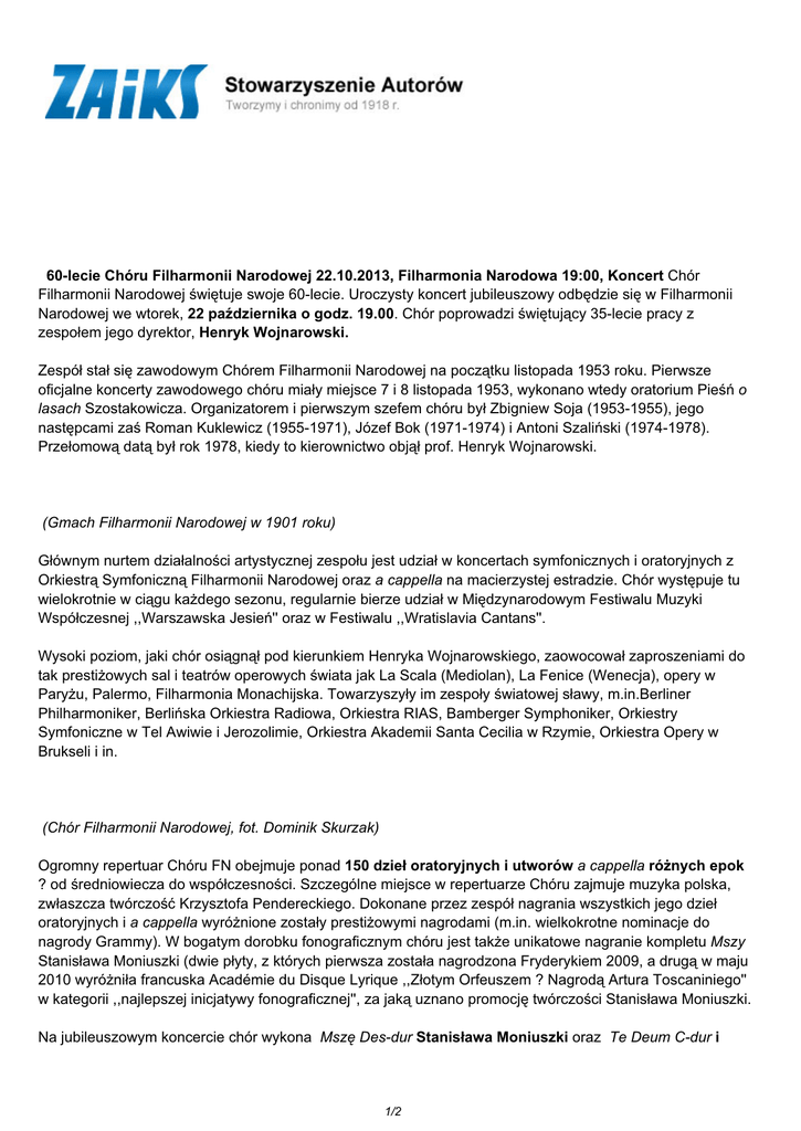 60-lecie Chóru Filharmonii Narodowej 22.10.2013, Filharmonia Narodowa 19:00, Koncert Chór Filharmonii Narodowej świętuje swoje 60-lecie. Uroczysty koncert jubileuszowy odbędzie się w Filharmonii Narodowej we wtorek, 22 października o godz. 19.00. Chór poprowadzi świętujący 35-lecie pracy z zespołem jego dyrektor, Henryk Wojnarowski. Zespół stał się zawodowym Chórem Filharmonii Narodowej na początku listopada 1953 roku. Pierwsze oficjalne koncerty zawodowego chóru miały miejsce 7 i 8 listopada 1953, wykonano wtedy oratorium Pieśń o lasach Szostakowicza. Organizatorem i pierwszym szefem chóru był Zbigniew Soja (1953-1955), jego następcami zaś Roman Kuklewicz (1955-1971), Józef Bok (1971-1974) i Antoni Szaliński (1974-1978). Przełomową datą był rok 1978, kiedy to kierownictwo objął prof. Henryk Wojnarowski. (Gmach Filharmonii Narodowej w 1901 roku) Głównym nurtem działalności artystycznej zespołu jest udział w koncertach symfonicznych i oratoryjnych z Orkiestrą Symfoniczną Filharmonii Narodowej oraz a cappella na macierzystej estradzie. Chór występuje tu wielokrotnie w ciągu każdego sezonu, regularnie bierze udział w Międzynarodowym Festiwalu Muzyki Współczesnej ,,Warszawska Jesień'' oraz w Festiwalu ,,Wratislavia Cantans''. Wysoki poziom, jaki chór osiągnął pod kierunkiem Henryka Wojnarowskiego, zaowocował zaproszeniami do tak prestiżowych sal i teatrów operowych świata jak La Scala (Mediolan), La Fenice (Wenecja), opery w Paryżu, Palermo, Filharmonia Monachijska. Towarzyszyły im zespoły światowej sławy, m.in.Berliner Philharmoniker, Berlińska Orkiestra Radiowa, Orkiestra RIAS, Bamberger Symphoniker, Orkiestry Symfoniczne w Tel Awiwie i Jerozolimie, Orkiestra Akademii Santa Cecilia w Rzymie, Orkiestra Opery w Brukseli i in. (Chór Filharmonii Narodowej, fot. Dominik Skurzak) Ogromny repertuar Chóru FN obejmuje ponad 150 dzieł oratoryjnych i utworów a cappella różnych epok ? od średniowiecza do współczesności. Szczególne miejsce w repertuarze Chóru zajmuje muzyka polska, zwłaszcza twórczość Krzysztofa Pendereckiego. Dokonane przez zespół nagrania wszystkich jego dzieł oratoryjnych i a cappella wyróżnione zostały prestiżowymi nagrodami (m.in. wielkokrotne nominacje do nagrody Grammy). W bogatym dorobku fonograficznym chóru jest także unikatowe nagranie kompletu Mszy Stanisława Moniuszki (dwie płyty, z których pierwsza została nagrodzona Fryderykiem 2009, a drugą w maju 2010 wyróżniła francuska Académie du Disque Lyrique ,,Złotym Orfeuszem ? Nagrodą Artura Toscaniniego'' w kategorii ,,najlepszej inicjatywy fonograficznej'', za jaką uznano promocję twórczości Stanisława Moniuszki. Na jubileuszowym koncercie chór wykona Mszę Des-dur Stanisława Moniuszki oraz Te Deum C-dur i 1/2 Mszę e-moll Antona Brucknera. Solistami będą członkowie chóru: Justyna Jedynak-Obłoza ? sopran, Inga Poškut? ? sopran, Anna Fijałkowska ? alt, Jolanta Kaczyńska-Lechnio ? alt, Tomasz Warmijak ? tenor, Mariusz Cyciura ? tenor, Krzysztof Chalimoniuk ? bas i Przemysław Żywczok ? bas. Na organach zagra wybitny polski artysta Andrzej Białko. Zapraszamy również na wystawę ukazującą 60 lat historii Chóru FN, dostępną dla widzów w foyer Rowickiego w porach wszystkich koncertów odbywających się w Sali Koncertowej Filharmonii. ? wróć do listy wydarzeń Wszelkie prawa zastrzeżone 2017 ZAiKS / data wygenerowania strony 02.03.2017 12:04:16 PDF ze strony: http://zaiks.org.pl/wydarzenia,196 2/2