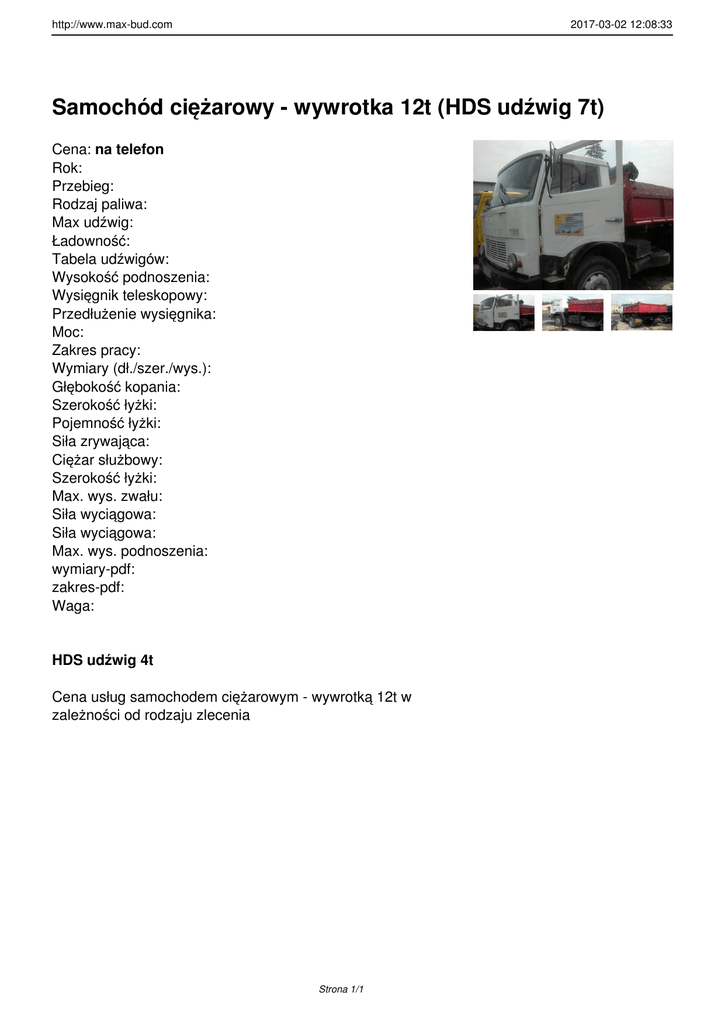 http://www.max-bud.com 2017-03-02 12:08:33 Samochód ciężarowy - wywrotka 12t (HDS udźwig 7t) Cena: na telefon Rok: Przebieg: Rodzaj paliwa: Max udźwig: Ładowność: Tabela udźwigów: Wysokość podnoszenia: Wysięgnik teleskopowy: Przedłużenie wysięgnika: Moc: Zakres pracy: Wymiary (dł./szer./wys.): Głębokość kopania: Szerokość łyżki: Pojemność łyżki: Siła zrywająca: Ciężar służbowy: Szerokość łyżki: Max. wys. zwału: Siła wyciągowa: Siła wyciągowa: Max. wys. podnoszenia: wymiary-pdf: zakres-pdf: Waga: HDS udźwig 4t Cena usług samochodem ciężarowym - wywrotką 12t w zależności od rodzaju zlecenia Strona 1/1